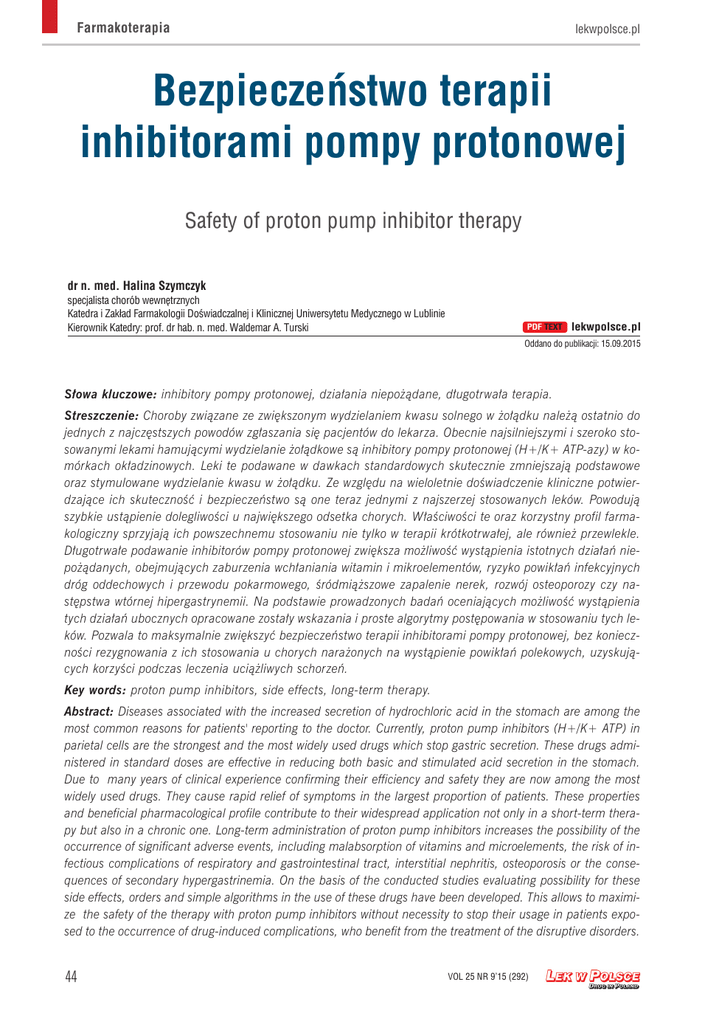 Farmakoterapia lekwpolsce.pl Bezpieczeństwo terapii inhibitorami pompy protonowej Safety of proton pump inhibitor therapy dr n. med. Halina Szymczyk specjalista chorób wewnętrznych Katedra i Zakład Farmakologii Doświadczalnej i Klinicznej Uniwersytetu Medycznego w Lublinie Kierownik Katedry: prof. dr hab. n. med. Waldemar A. Turski PDF TEXT lekwpolsce.pl Oddano do publikacji: 15.09.2015 Słowa kluczowe: inhibitory pompy protonowej, działania niepożądane, długotrwała terapia. Streszczenie: Choroby związane ze zwiększonym wydzielaniem kwasu solnego w żołądku należą ostatnio do jednych z najczęstszych powodów zgłaszania się pacjentów do lekarza. Obecnie najsilniejszymi i szeroko stosowanymi lekami hamującymi wydzielanie żołądkowe są inhibitory pompy protonowej (H+/K+ ATP-azy) w komórkach okładzinowych. Leki te podawane w dawkach standardowych skutecznie zmniejszają podstawowe oraz stymulowane wydzielanie kwasu w żołądku. Ze względu na wieloletnie doświadczenie kliniczne potwierdzające ich skuteczność i bezpieczeństwo są one teraz jednymi z najszerzej stosowanych leków. Powodują szybkie ustąpienie dolegliwości u największego odsetka chorych. Właściwości te oraz korzystny profil farmakologiczny sprzyjają ich powszechnemu stosowaniu nie tylko w terapii krótkotrwałej, ale również przewlekle. Długotrwałe podawanie inhibitorów pompy protonowej zwiększa możliwość wystąpienia istotnych działań niepożądanych, obejmujących zaburzenia wchłaniania witamin i mikroelementów, ryzyko powikłań infekcyjnych dróg oddechowych i przewodu pokarmowego, śródmiąższowe zapalenie nerek, rozwój osteoporozy czy następstwa wtórnej hipergastrynemii. Na podstawie prowadzonych badań oceniających możliwość wystąpienia tych działań ubocznych opracowane zostały wskazania i proste algorytmy postępowania w stosowaniu tych leków. Pozwala to maksymalnie zwiększyć bezpieczeństwo terapii inhibitorami pompy protonowej, bez konieczności rezygnowania z ich stosowania u chorych narażonych na wystąpienie powikłań polekowych, uzyskujących korzyści podczas leczenia uciążliwych schorzeń. Key words: proton pump inhibitors, side effects, long-term therapy. Abstract: Diseases associated with the increased secretion of hydrochloric acid in the stomach are among the most common reasons for patients' reporting to the doctor. Currently, proton pump inhibitors (H+/K+ ATP) in parietal cells are the strongest and the most widely used drugs which stop gastric secretion. These drugs administered in standard doses are effective in reducing both basic and stimulated acid secretion in the stomach. Due to many years of clinical experience confirming their efficiency and safety they are now among the most widely used drugs. They cause rapid relief of symptoms in the largest proportion of patients. These properties and beneficial pharmacological profile contribute to their widespread application not only in a short-term therapy but also in a chronic one. Long-term administration of proton pump inhibitors increases the possibility of the occurrence of significant adverse events, including malabsorption of vitamins and microelements, the risk of infectious complications of respiratory and gastrointestinal tract, interstitial nephritis, osteoporosis or the consequences of secondary hypergastrinemia. On the basis of the conducted studies evaluating possibility for these side effects, orders and simple algorithms in the use of these drugs have been developed. This allows to maximize the safety of the therapy with proton pump inhibitors without necessity to stop their usage in patients exposed to the occurrence of drug-induced complications, who benefit from the treatment of the disruptive disorders. 44 VOL 25 NR 9’15 (292) Farmakoterapia lekwpolsce.pl Wprowadzenie Choroby przewodu pokarmowego związane z nadmiernym wydzielaniem kwasu solnego w żołądku stanowią obecnie istotny problem zdrowotny. Kwas solny warunkuje prawidłowe trawienie pokarmów, a także stanowi ważną barierę ochronną organizmu przed drobnoustrojami chorobotwórczymi. Przed jego szkodliwym działaniem na błonę śluzową przewodu pokarmowego chronią obecne w organizmie mechanizmy obronne, jak np. zapobieganie cofaniu się treści żołądkowej do przełyku dzięki odpowiedniemu napięciu dolnego zwieracza przełyku, czy wydzielanie śluzu lub jonów wodorowęglanowych przez komórki żołądka [1,2]. Jeżeli ta naturalna równowaga zostanie zaburzona, dochodzi do wystąpienia zmian o charakterze zapalnym oraz owrzodzeń błony śluzowej żołądka, dwunastnicy czy przełyku. Skuteczne zapobieganie i leczenie tych stanów polega na hamowaniu wydzielania kwasu solnego przez komórki okładzinowe żołądka. Na początku lat 70. zaczęto stosować leki blokujące receptory histaminowe typu 2 (cymetydyna, ranitydyna, famotydyna, nizatydyna). Hamują one receptory H2 na powierzchni komórki okładzinowej i skutecznie tłumią wydzielanie kwasu, zależnie od zastosowanej dawki [3,4]. Jednakże większym osiągnięciem było odkrycie w 1973 r. ATP-azy wodorowo-potasowej (H+/K+- ATP-azy) – pompy protonowej, odpowiadającej za wymianę jonów potasowych na wodorowe, wydzielanych do światła żołądka [5]. Pozwoliło to, kilka lat później, zsyntetyzować substancje bezpośrednio blokujące wydzielanie kwasu w żołądku przez zahamowanie aktywności H+/K+-ATP-azy [6]. Pierwszym lekiem o takim działaniu był omeprazol, który został zarejestrowany w Stanach VOL 25 NR 9’15 (292) Zjednoczonych w 1988 r. Zapoczątkował on proces syntetyzowania nowych leków z tej grupy; kolejno wprowadzono do terapii lanzoprazol (1995 r.), rabeprazol (1999 r.), pantoprazol (2000 r.) i esomeprazol (2001 r.) [7]. Substancje te różnią się od pierwowzoru swoimi właściwościami farmakologicznymi, mimo takiego samego mechanizmu działania. Inhibitory pompy protonowej (IPP) skuteczniej niż antagoniśc