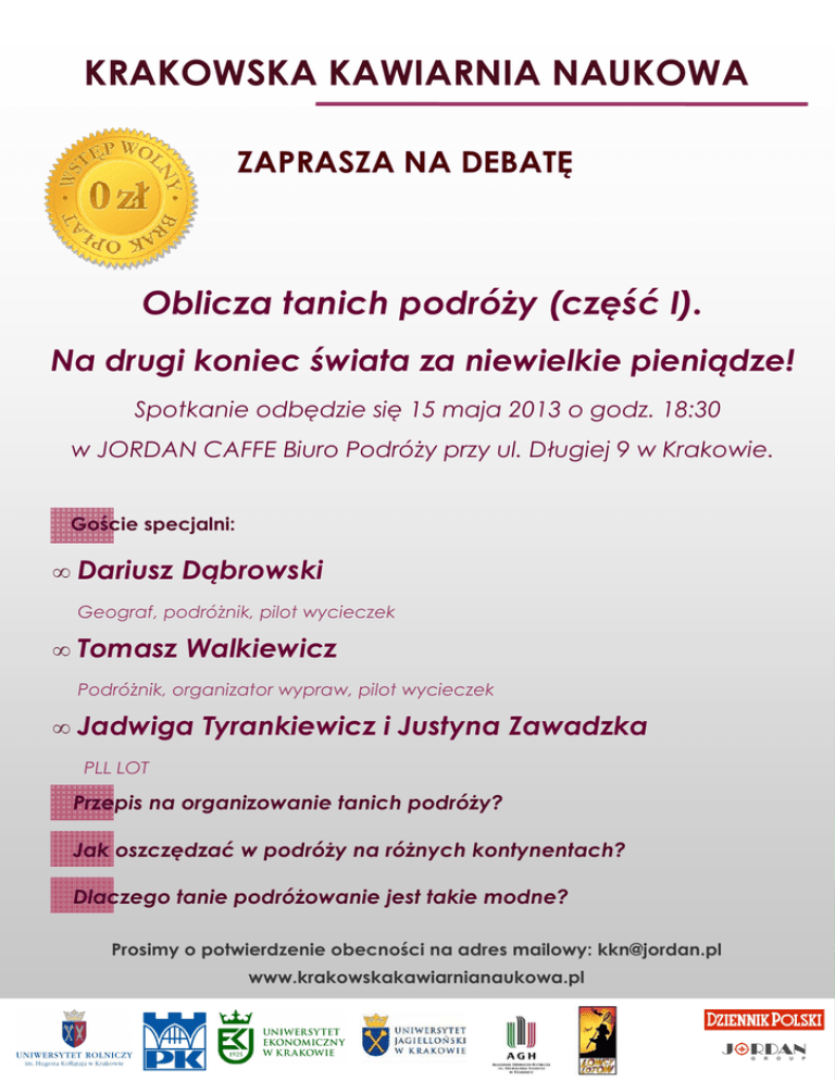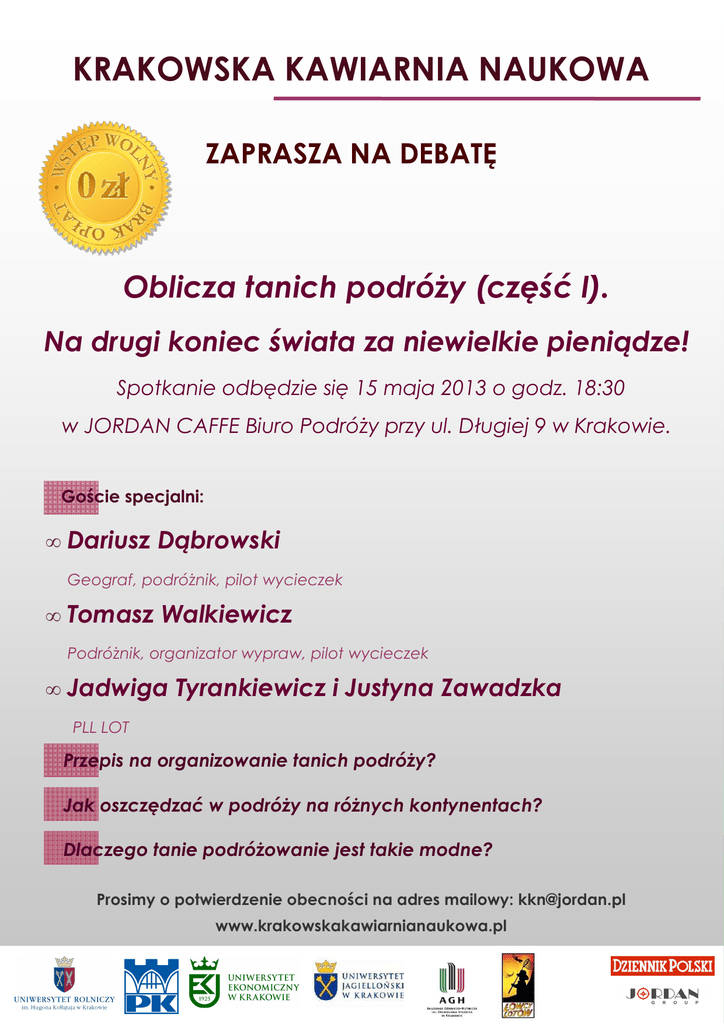 KRAKOWSKA KAWIARNIA NAUKOWA ZAPRASZA NA DEBATĘ Oblicza tanich podróŜy (część I). Na drugi koniec świata za niewielkie pieniądze! Spotkanie odbędzie się 15 maja 2013 o godz. 18:30 w JORDAN CAFFE Biuro PodróŜy przy ul. Długiej 9 w Krakowie. Goście specjalni: • Dariusz Dąbrowski Geograf, podróŜnik, pilot wycieczek • Tomasz Walkiewicz PodróŜnik, organizator wypraw, pilot wycieczek • Jadwiga Tyrankiewicz i Justyna Zawadzka PLL LOT Przepis na organizowanie tanich podróŜy? Jak oszczędzać w podróŜy na róŜnych kontynentach? Dlaczego tanie podróŜowanie jest takie modne? Prosimy o potwierdzenie obecności na adres mailowy: [email protected] www.krakowskakawiarnianaukowa.pl