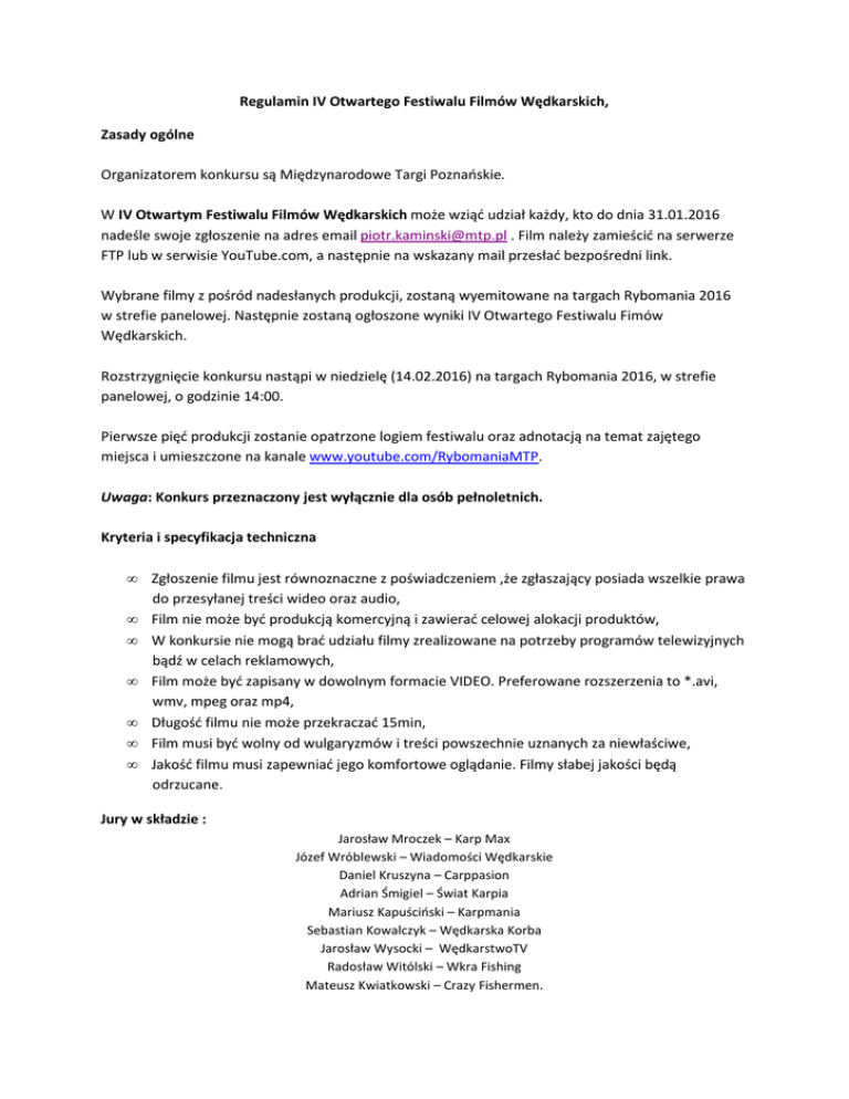 Regulamin IV Otwartego Festiwalu Filmów Wędkarskich, Zasady ogólne Organizatorem konkursu są Międzynarodowe Targi Poznańskie. W IV Otwartym Festiwalu Filmów Wędkarskich może wziąć udział każdy, kto do dnia 31.01.2016 nadeśle swoje zgłoszenie na adres email [email protected] . Film należy zamieścić na serwerze FTP lub w serwisie YouTube.com, a następnie na wskazany mail przesłać bezpośredni link. Wybrane filmy z pośród nadesłanych produkcji, zostaną wyemitowane na targach Rybomania 2016 w strefie panelowej. Następnie zostaną ogłoszone wyniki IV Otwartego Festiwalu Fimów Wędkarskich. Rozstrzygnięcie konkursu nastąpi w niedzielę (14.02.2016) na targach Rybomania 2016, w strefie panelowej, o godzinie 14:00. Pierwsze pięć produkcji zostanie opatrzone logiem festiwalu oraz adnotacją na temat zajętego miejsca i umieszczone na kanale www.youtube.com/RybomaniaMTP. Uwaga: Konkurs przeznaczony jest wyłącznie dla osób pełnoletnich. Kryteria i specyfikacja techniczna • • • • • • • Zgłoszenie filmu jest równoznaczne z poświadczeniem ,że zgłaszający posiada wszelkie prawa do przesyłanej treści wideo oraz audio, Film nie może być produkcją komercyjną i zawierać celowej alokacji produktów, W konkursie nie mogą brać udziału filmy zrealizowane na potrzeby programów telewizyjnych bądź w celach reklamowych, Film może być zapisany w dowolnym formacie VIDEO. Preferowane rozszerzenia to *.avi, wmv, mpeg oraz mp4, Długość filmu nie może przekraczać 15min, Film musi być wolny od wulgaryzmów i treści powszechnie uznanych za niewłaściwe, Jakość filmu musi zapewniać jego komfortowe oglądanie. Filmy słabej jakości będą odrzucane. Jury w składzie : Jarosław Mroczek – Karp Max Józef Wróblewski – Wiadomości Wędkarskie Daniel Kruszyna – Carppasion Adrian Śmigiel – Świat Karpia Mariusz Kapuściński – Karpmania Sebastian Kowalczyk – Wędkarska Korba Jarosław Wysocki – WędkarstwoTV Radosław Witólski – Wkra Fishing Mateusz Kwiatkowski – Crazy Fishermen. Koordynator: Piotr Kamiński – Międzynarodowe Targi Poznańskie • Każdy z sędziów będzie oceniał filmy indywidualnie przyznając im ocenę w skali od 1 do 5. O ostatecznej kolejności zdecyduje suma wszystkich otrzymanych punktów, • Jury oceni nadesłane produkcje i wybierze 5 najlepszych filmów, które zostaną zaprezentowane podczas pokazów na targach Rybomania 2016, w Poznaniu, • Wszyscy nominowani do dziesiątki twórców najlepszych produkcji otrzymają podwójne zaproszenie na targi Rybomania 2016, • Zwycięzca zostanie ogłoszony po zakończeniu seansów emitowanych w ramach finału IV Otwartego Festiwalu Filmów Wędkarskich. Zapraszamy do udziału w IV edycji Otwartego Festiwalu Filmów Wędkarskich!