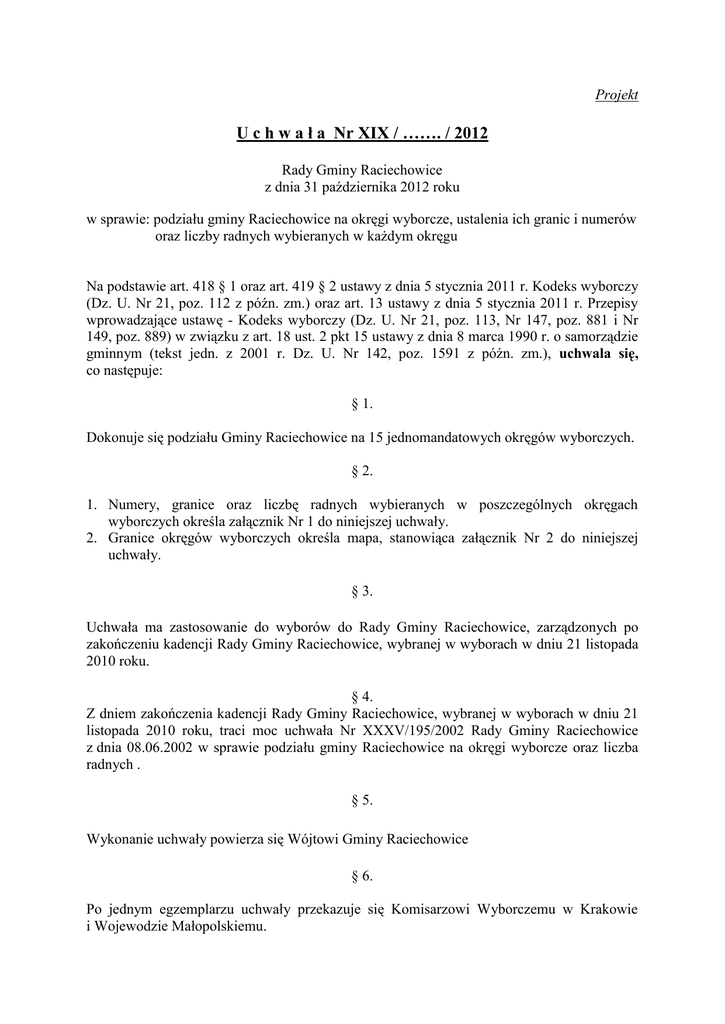 Projekt U c h w a ł a Nr XIX / ……. / 2012 Rady Gminy Raciechowice z dnia 31 października 2012 roku w sprawie: podziału gminy Raciechowice na okręgi wyborcze, ustalenia ich granic i numerów oraz liczby radnych wybieranych w każdym okręgu Na podstawie art. 418 § 1 oraz art. 419 § 2 ustawy z dnia 5 stycznia 2011 r. Kodeks wyborczy (Dz. U. Nr 21, poz. 112 z późn. zm.) oraz art. 13 ustawy z dnia 5 stycznia 2011 r. Przepisy wprowadzające ustawę - Kodeks wyborczy (Dz. U. Nr 21, poz. 113, Nr 147, poz. 881 i Nr 149, poz. 889) w związku z art. 18 ust. 2 pkt 15 ustawy z dnia 8 marca 1990 r. o samorządzie gminnym (tekst jedn. z 2001 r. Dz. U. Nr 142, poz. 1591 z późn. zm.), uchwala się, co następuje: § 1. Dokonuje się podziału Gminy Raciechowice na 15 jednomandatowych okręgów wyborczych. § 2. 1. Numery, granice oraz liczbę radnych wybieranych w poszczególnych okręgach wyborczych określa załącznik Nr 1 do niniejszej uchwały. 2. Granice okręgów wyborczych określa mapa, stanowiąca załącznik Nr 2 do niniejszej uchwały. § 3. Uchwała ma zastosowanie do wyborów do Rady Gminy Raciechowice, zarządzonych po zakończeniu kadencji Rady Gminy Raciechowice, wybranej w wyborach w dniu 21 listopada 2010 roku. § 4. Z dniem zakończenia kadencji Rady Gminy Raciechowice, wybranej w wyborach w dniu 21 listopada 2010 roku, traci moc uchwała Nr XXXV/195/2002 Rady Gminy Raciechowice z dnia 08.06.2002 w sprawie podziału gminy Raciechowice na okręgi wyborcze oraz liczba radnych . § 5. Wykonanie uchwały powierza się Wójtowi Gminy Raciechowice § 6. Po jednym egzemplarzu uchwały przekazuje się Komisarzowi Wyborczemu w Krakowie i Wojewodzie Małopolskiemu. § 7. Na niniejszą uchwałę wyborcom, w liczbie co najmniej 15, przysługuje prawo wniesienia skargi do Komisarza Wyborczego w Krakowie, w terminie 5 dni od daty podania uchwały do publicznej wiadomości. § 8. Uchwała podlega ogłoszeniu w Dzienniku Urzędowym Województwa Małopolskiego oraz podaniu do publicznej wiadomości w sposób zwyczajowo przyjęty. § 9. Uchwała wchodzi w życie z dniem podjęcia. Załącznik Nr 1 do uchwały Rady Gminy Raciechowice Nr XIX/ …../2012 z dnia 31.10.2012 r. PODZIAŁ GMINY RACIECHOWICE NA OKRĘGI WYBORCZE Numer okręgu wyborczego 1 Granice okręgu wyborczego Sołectwo: Czasław I - część sołectwa z lewej strony drogi gminnej Czasław k/Cegielni nr 540 474 / numery domów: 10, 29-50, 54-55, 59, 65, 68, 72, nieparzyste:75-81, 82-85, 88-89, 93-98, 103, 111-113, 115-117, 119-120, 125-126A, 131, 135, 140-142, 145, 152, 155-156, 163, 176A-182, 190-194, 197-202, 207-210, 214-220, 222, 229, 241-253. Ilość radnych wybieranych w okręgu wyborczym 1 Sołectwo: Czasław II - część sołectwa z prawej strony drogi gminnej Czasław k/Cegielni nr 540 474 / numery domów: 2 1-8, 11-28, 51-53, 57-58, 60-64, 66-67, 69-70, parzyste:74-80, 86-87, 90-91, parzyste:102-106, 107-110, 114, 118, 121-124, 128-129, 132-134, 136-139, parzyste:144-146, nieparzyste:147-153, 154, 158-161, 164-176, 184-188, 196, 204, 211-212, 221, parzyste:224-228, 231-238, 254-258. 1 3 Sołectwo: Dąbie Sołectwo: Gruszów I - część sołectwa z lewej strony potoku Gruszów nr 38 następnie z lewej strony drogi gminnej Gruszów k/Trojańskiego nr 540 477K do skrzyżowania z drogą powiatową 1958 K dalej z lewej strony drogi powiatowej do skrzyżowania z drogą gminną Gruszów k/campingów nr 540 478K dalej z lewej strony drogi gminnej i dalej z lewej strony drogi wewnętrznej Gruszów Wieża nr dz. 446 / numery domów: 5, 12-14, 16-19, 21, 26, 1 4 1 parzyste: 34A-36, 39-40, 44-46, 49-54, 56-61A, 67-68, parzyste: 76-78, 79, 8283, 87, nieparzyste: 91-93, parzyste: 94-96, nieparzyste: 99-105, 106, 109, 113114, 121, 124-125, 131, 134-135, 140, 145-147, 150-158, 161-162, 165-167, 170177, 179-180, 198, 211, 214-215, nieparzyste: 219-221, parzyste: 230-232, 250, 258, nieparzyste: 287-297. 5 Sołectwo: Gruszów II - część sołectwa z prawej strony potoku Gruszów nr 38 następnie z prawej strony drogi gminnej Gruszów k/Trojańskiego nr 540 477K do skrzyżowania z drogą powiatową 1958 K dalej z prawej strony drogi powiatowej do skrzyżowania z drogą gminną Gruszów k/campingów nr 540 478K dalej z prawej strony drogi gminnej i dalej z prawej strony drogi wewnętrznej Gruszów Wieża nr dz. 446 / numery domów: 1-4, 7-11, 15, parzyste: 1 20-24, nieparzyste: 25-27, 28-33, 37-38, 41-43, 48, 55, 62-65, 69-75, 77, 81, parzyste: 84-88, 89, 92, 95, parzyste: 98-104, 107-108, 111-112, 117-119, 122123, 126-130, 133, 136, 141-144, 148-149, 160, 164, 169, 178, 181-191, 200209, 212, 216-218, parzyste: 220-222, 223-227, nieparzyste: 231-239, 248, 254256, 267-280, 288. 6 7 8 9 Sołectwo: Komorniki Sołectwo: Krzesławice Sołectwo: Kwapinka Sołectwo: Mierzeń 1 1 1 1 10 11 Sołectwo: Poznachowice Górne Sołectwo: Raciechowice I - część sołectwa z lewej strony drogi powiatowej nr 1961 K do skrzyżowania z drogą gminną Raciechowice k/cmentarza nr 540 498 K dalej z lewej strony drogi gminnej do skrzyżowania z drogą powiatową 1958 K dalej z lewej strony drogi powiatowej do skrzyżowania z drogą gminną Raciechowice Na Lasek nr 540 496 K dalej z lewej strony drogi gminnej do skrzyżowania z drogą gminną Raciechowice Mokra nr 540 495 K i dalej z lewej strony drogi gminnej / numery domów: 1 1 1A, 4-10, 12-19, 22-24, parzyste: 30-32, 33-36, parzyste: 40-44, 45, nieparzyste: 49-55, parzyste: 56-58, 59-64, 67, parzyste: 72-78, 79, 83-84, 90-92, 107-116, 121, 128, 132, nieparzyste: 135-141, 148, 176-178, 190, 199, 209, 218, 229-230, 239-242, 262-263, 279-283, 305-312, 325-333, + sołectwo: Krzyworzeka 12 Sołectwo: Raciechowice II - część sołectwa z prawej strony drogi powiatowej nr 1961 K do skrzyżowania z drogą gminną Raciechowice k/cmentarza nr 540 498 K dalej z prawej strony drogi gminnej do skrzyżowania z droga powiatową 1958 K dalej z prawej strony drogi powiatowej do skrzyżowania z drogą gminną Raciech