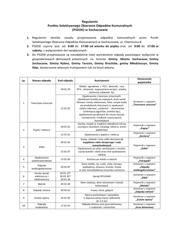 Regulamin Punktu Selektywnego Zbierania Odpadów Komunalnych (PSZOK) w Sochaczewie 1. Regulamin określa zasady przyjmowania odpadów komunalnych przez Punkt Selektywnego Zbierania Odpadów Komunalnych w Sochaczewie, ul. Chemiczna 8. 2. PSZOK czynny jest od 9:00 do 17:00 od wtorku do piątku oraz od 9:00 do 17:00 w soboty, z wyłączeniem dni świątecznych. 3. Do PSZOK przyjmowane są nieodpłatnie niżej wymienione odpady powstające wyłącznie w gospodarstwach domowych położonych na terenie Gminy Miasta Sochaczew, Gminy Sochaczew, Gminy Rybno, Gminy Teresin, Gminy Brochów, gminy Młodzieszyn, Gminy Iłów, dostarczone własnym transportem lub na koszt własny. Lp. 1 Nazwa odpadu Kod odpadu Asortyment 20 01 39 Meble ogrodowe z PCV, doniczki, rury PCV, elementy wyposażenia wnętrz, wiadra, elementy zabawek itp. Tworzywa sztuczne 15 01 02 20 01 01 2 Papier i tektura 15 01 01 20 01 02 3 Szkło 15 01 07 Opakowania z tworzyw sztucznych: plastikowe butelki po napojach, duże worki foliowe i torby reklamowe, folie, umyte kubki po produktach mlecznych (z opakowań należy oderwać „sreberka” - aluminiowe zamknięcia jogurtów, serków itp.), opakowania po płynach do mycia naczyń, szamponach, środkach czyszczących, kosmetykach Gazety, książki w miękkich okładkach lub po usunięciu twardych, katalogi, tektura, worki papierowe Oznaczenie pojemnika Kontener z napisem „Tworzywa sztuczne” Pojemnik z napisem „Papier” Opakowania z papieru i tektury Pojemnik z napisem „Kartony” Szyby, szklanki i inne szkło domowe za wyjątkiem szkła zbrojonego i szyb samochodowych Opakowania ze szkła: opróżnione z resztek, czyste butelki i słoiki oraz inne opakowania szklane Pojemnik z napisem „Szkło” 4 Opakowania wielomateriałowe 15 01 05 Kartony po mleku o sokach 5 Odpady wielkogabarytowe 20 03 07 Stare meble, np. szafy, stoły, kanapy, wykładziny, dywany, krzesła, fotele w tym nieuszkodzona ceramika sanitarna 6 Zużyty sprzęt elektryczny i elektroniczny 20 01 23* 20 01 35* 20 01 36 Sprzęt RTV/AGD 7 Metale 20 01 40 Złom stalowy, złom aluminium i metali kolorowych 8 Odpady zielone 20 02 01 Trawa, liście, gałęzie 9 Zużyte opony 16 01 03 10 Odpady budowlane 17 01 01 Opony pochodzące z pojazdów o dopuszczalnej masie całkowitej do 3,5 ton Odpady betonu oraz gruz betonowy z rozbiórek i remontów Pojemnik z napisem „Tetrapaki” Kontener z napisem „Odpady wielkogabarytowe” Kontener z napisem „ZSEE” Pojemnik z napisem „Metale” Kontener z napisem „Odpady zielone” Kontener z napisem „Zużyte opony” Kontener z napisem „Gruz betonowy’ i remontowe pochodzące z remontów prowadzonych we własnym zakresie 17 01 02 17 01 03 17 01 07 Gruz ceglany Odpady innych materiałów ceramicznych i elementów wyposażenia Zmieszane odpady z betonu, gruzu ceglanego, odpadowych materiałów ceramicznych i elementów wyposażenia (cegła, tynki, glazura, terakota, uszkodzona ceramika sanitarna, opakowania po sylikonach, cemencie, fugach, płyty karton gips, tapety (z wyłączeniem azbestu, smoły, papy, styropianu budowlanego, opakowań po farbach i lakierach), potłuczone szyby, stolarka okienna, drzwi Kontener z napisem „Gruz ceglany” Kontener z napisem „Ceramika” Kontener z napisem „Zmieszane odpady poremontowe” 11 Tekstylia 20 01 11 Odzież, firany, zasłony, obrusy Kontener z napisem „Tekstylia” 12 Farby, tusze, kleje 20 01 27* 20 01 28 Pozostałość farb, tuszy, klejów oraz opakowania zanieczyszczone tymi substancjami Pojemnik z napisem „Farby” 13 Rozpuszczalniki 20 01 13* Rozpuszczalniki do farb i lakierów 14 Środki ochrony roślin 20 01 19* Środki ochrony roślin 15 Lampy fluorescencyjne i inne odpady zawierające rtęć 20 01 21* 16 Baterie i akumulatory 20 01 33* Świetlówki Inne odpady zawierające rtęć np. termometry Baterie i akumulatory Pojemnik z napisem „Rozpuszczalniki” Pojemnik z napisem „Środki ochrony roślin” Pojemnik z napisem „Świetlówki” Pojemnik z napisem „Odpady zawierające rtęć” Pojemnik z napisem „Baterie i akumulatory” W PSZOK nie są przyjmowane następujące rodzaje odpadów: zmieszane odpady komunalne, materiały zawierające azbest, papę, smołę itp. szyby samochodowe, szkło zbrojone i hartowane, części samochodowe, styropian budowlany, inne, wskazujące na to, że nie powstały w gospodarstwach domowych. 5. PSZOK nie przyjmuje odpadów z działalności gospodarczej, w stosunku do których obowiązują odrębne przepisy w zakresie gospodarowania odpadami. 6. Prowadzący PSZOK: 1) Nie wystawia mieszkańcom kart przekazania odpadu oraz faktur. 7. Pracownicy obsługi PSZOK: 1) Przyjmując odpady sporządzają dokument potwierdzający dostarczenie odpadów (Załącznik nr 1 do Regulaminu), zawierający w szczególności: a) adres nieruchomości, z której pochodzą odpady; b) rodzaj dostarczonych odpadów; c) masę dostarczonych odpadów; d) kod odpadu; e) datę dostarczenia odpadów; 2) Mają prawo odmówić przyjęcia odpadu niezgodnego z listą przyjmowanych odpadów lub jeśli byłoby to sprzeczne z przepisami prawa lub mogłoby zagrażać zdrowiu lub życiu. 3) Mają prawo odmówić przyjęcia odpadów jeżeli osoba przywożąca odpady odmówi czynności określonych w pkt. 8 ppkt 1 i 2 niniejszego regulaminu. 4) Nie wyjmują przywiezionych odpadów z pojazdów, wskazują jedynie miejsce, gdzie należy je umieścić. 8. Oddający odpady do PSZOK: 1) Ma obowiązek okazania dokumentu potwierdzającego zamieszkiwanie na terenie Gminy (np. kopia deklaracji o wysokości opłaty za gospodarowanie odpadami komunalnymi lub inny dokument potwierdzający zamieszkiwanie na terenie właściwej gminy) oraz aktualnego dowodu opłaty za gospodarowanie odpadami komunalnymi wnoszonej do Gminy. 2) Ma obowiązek rozładunku odpadów i umieszczenia ich w miejscu i w sposób wskazany przez znaki informacyjne lub pracowników obsługi PSZOK. 3) Może poruszać się tylko po wykazanych częściach 