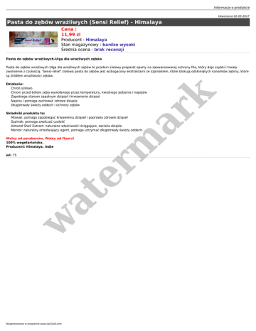 Informacje o produkcie Utworzono 02-03-2017 Pasta do zębów wrażliwych (Sensi Relief) - Himalaya Cena : 11,99 zl Producent : Himalaya Stan magazynowy : bardzo wysoki Średnia ocena : brak recenzji Pasta do zębów wrażliwych-Ulga dla wrażliwych zębów Pasta do zębów wrażliwych-Ulga dla wrażliwych zębów to przełom ziołowy preparat oparty na zaawansowanej ochrony fito, który daje szybki i trwały zwolnienie z czułością. 'Sensi-relief' ziołowa pasta do zębów jest wzbogacony ekstraktami ze szpinakiem, które blokują odsłoniętych kanalików zębiny, które są źródłem wrażliwości zębów. er m ar k Działanie: Chroń szkliwo Chroni przed bólem zęba wywołanego przez temperatury, kwaśnego jedzenia i napojów Zapobiega stanom zapalnym dziąseł i krwawienie dziąseł Napina i pomaga zachować zdrowe dziąsła Długotrwały świeży oddech i ochrony zębów Składniki produktu to: Miswak: pomaga zapobiegać krwawieniu dziąseł i poprawia zdrowie dziąseł Szpinak: pomaga zwalczać czułość Almond Shell Extract: naturalne właściwości ściągające, zaciska dziąsła Mentol: naturalny orzeźwiający agent, pomaga utrzymać długotrwały świeży oddech. Wolny od parabenów, Wolny od fluoru! 100% wegetariańska. Producent: Himalaya, Indie w at ml: 75 Wygenerowano w programie www.oscGold.com