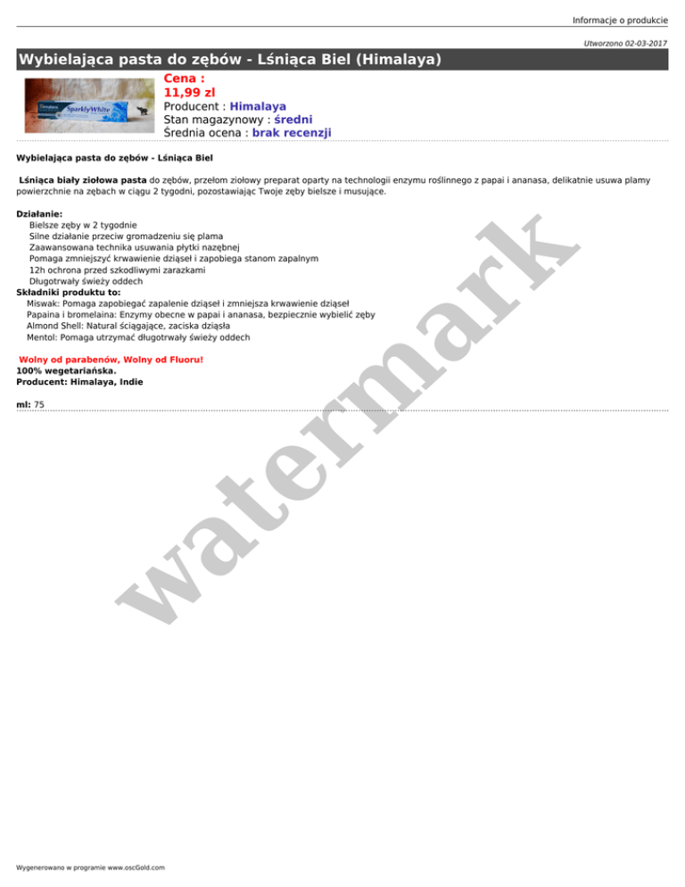 Informacje o produkcie Utworzono 02-03-2017 Wybielająca pasta do zębów - Lśniąca Biel (Himalaya) Cena : 11,99 zl Producent : Himalaya Stan magazynowy : średni Średnia ocena : brak recenzji Wybielająca pasta do zębów - Lśniąca Biel Lśniąca biały ziołowa pasta do zębów, przełom ziołowy preparat oparty na technologii enzymu roślinnego z papai i ananasa, delikatnie usuwa plamy powierzchnie na zębach w ciągu 2 tygodni, pozostawiając Twoje zęby bielsze i musujące. er m ar k Działanie: Bielsze zęby w 2 tygodnie Silne działanie przeciw gromadzeniu się plama Zaawansowana technika usuwania płytki nazębnej Pomaga zmniejszyć krwawienie dziąseł i zapobiega stanom zapalnym 12h ochrona przed szkodliwymi zarazkami Długotrwały świeży oddech Składniki produktu to: Miswak: Pomaga zapobiegać zapalenie dziąseł i zmniejsza krwawienie dziąseł Papaina i bromelaina: Enzymy obecne w papai i ananasa, bezpiecznie wybielić zęby Almond Shell: Natural ściągające, zaciska dziąsła Mentol: Pomaga utrzymać długotrwały świeży oddech Wolny od parabenów, Wolny od Fluoru! 100% wegetariańska. Producent: Himalaya, Indie w at ml: 75 Wygenerowano w programie www.oscGold.com