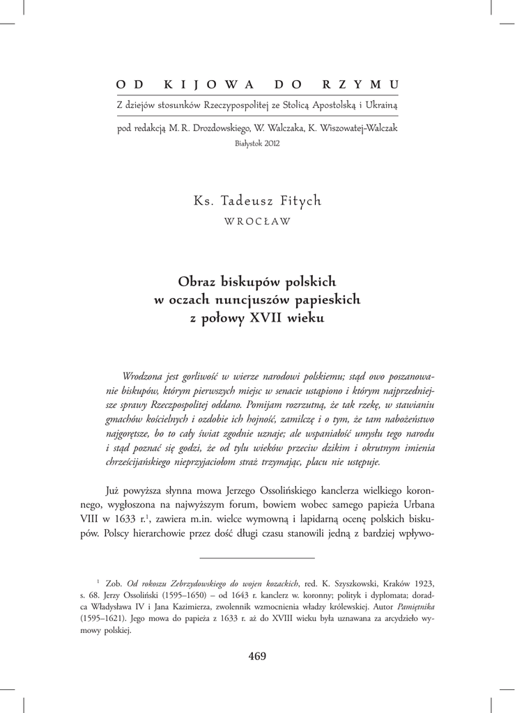 O d K i j o w a d o R z y m u Z dziejów stosunków Rzeczypospolitej ze Stolicą Apostolską i Ukrainą pod redakcją M. R. Drozdowskiego, W. Walczaka, K. Wiszowatej-Walczak Białystok 2012 Ks. Tadeus z Fitych W r o c ł aw Obraz biskupów polskich w oczach nuncjuszów papieskich z połowy XVII wieku Wrodzona jest gorliwość w wierze narodowi polskiemu; stąd owo poszanowanie biskupów, którym pierwszych miejsc w senacie ustąpiono i którym najprzedniejsze sprawy Rzeczpospolitej oddano. Pomijam rozrzutną, że tak rzekę, w stawianiu gmachów kościelnych i ozdobie ich hojność, zamilczę i o tym, że tam nabożeństwo najgorętsze, bo to cały świat zgodnie uznaje; ale wspaniałość umysłu tego narodu i stąd poznać się godzi, że od tylu wieków przeciw dzikim i okrutnym imienia chrześcijańskiego nieprzyjaciołom straż trzymając, placu nie ustępuje. Już powyższa słynna mowa Jerzego Ossolińskiego kanclerza wielkiego koronnego, wygłoszona na najwyższym forum, bowiem wobec samego papieża Urbana VIII w 1633 r.1, zawiera m.in. wielce wymowną i lapidarną ocenę polskich biskupów. Polscy hierarchowie przez dość długi czasu stanowili jedną z bardziej wpływo- 1 Zob. Od rokoszu Zebrzydowskiego do wojen kozackich, red. K. Szyszkowski, Kraków 1923, s. 68. Jerzy Ossoliński (1595–1650) – od 1643 r. kanclerz w. koronny; polityk i dyplomata; doradca Władysława IV i Jana Kazimierza, zwolennik wzmocnienia władzy królewskiej. Autor Pamiętnika (1595–1621). Jego mowa do papieża z 1633 r. aż do XVIII wieku była uznawana za arcydzieło wymowy polskiej. 469 Ks. Tadeusz Fitych wych elit Rzeczypospolitej Obojga Narodów2 – niekiedy prawie 1/3 z nich pełniła wysokie urzędy ministerialne, a ponad 3/4 – czyli 16 członków episkopatu – było senatorami. Mimo tego nawet w ponad 500 lat od powstania polskiego parlamentaryzmu3 nie posiadają jeszcze portretu zbiorowego4. 1. Cel i metoda Prezentowana tu próba prozopografii5 polskiego episkopatu z połowy XVII wieku siłą rzeczy nie będzie obrazem skończonym. Co więcej, kiedy zmierzamy do takiej charakterystyki biskupów, to zarówno historyka Kościoła, jak i badacza dziejów kultury czy też parlamentaryzmu nie może zadowolić jedynie odpowiedź na pytanie o za2 Prace tego typu należałoby prowadzić przy nowym, tzn. pełniejszym, ujęciu dziejów Rzeczypospolitej. Zob. J.A. Gierowski, O nowe ujęcie dziejów Rzeczypospolitej Polsko-Litewskiej, „Acta Universitatis Wratislaviensis” CXVI(1994), s. 7–14. 3 Zob. m.in. Piotrków sejmowy: materiały z sesji naukowej odbytej 28 stycznia 1994 z okazji 500-lecia ukształtowania się Sejmu Polskiego, red. M. Gąsior, Piotrków 1995; K. Zieliński, Dzieje parlamentaryzmu w Polsce XV–XX w., Warszawa 1985; J. Wolff, Senatorowie i dygnitarze Wielkiego Księstwa Litewskiego (1386–1795), Kraków 1885. 4 Natomiast od ponad 30 lat notujemy w Europie coraz większą liczbę prac prozopograficznych, głównie autorów włoskich, francuskich i niemieckich. Z tych ostatnich na szczególne uznanie zasługuje Christoph Weber (ur. 1943) profesor historii początków czasów nowożytnych w Uniwersytecie Heinricha Heinego w Düsseldorfie. Opublikował on ponad 15 książek, m.in. z zakresu historii papiestwa i instytucji kościelnych w okresie od XVI do XX wieku. W tej liczbie znajdziemy szereg cennych syntez źródłowych dotyczących zarówno elit legatów i gubernatorów Państwa Kościelnego, jak i kolegium kardynałów, i to aż dla okresu trzech wieków (1500–1800). Zob. m.in. Fünfzig genealogische Tafeln zur Geschichte der römischen Kurie in der frühen Neuzeit, „Quellen und Forschungen aus italienischen Archiven und Bibliotheken” (dalej – QFIAB) 73(1993), s. 496–571; Legati e governatori dello Stato Pontificio (1550–1800), Pubblicazioni degli Archivi di Stato – Sussidi 7, Roma 1994; Beiträge zur Kirchen und Kulturgeschichte, t. 2: Senatus Divinus – Verborgene Strukturen im Kardinalskollegium der frühen Neuzeit (1500–1800), Frankfurt a. Main 1996; Ch. Weber, Kardinäle und Prälaten in den lezten Jahrzehnten des Kirchenstaates, [w:] Päpste und Papsttum, t. 13, vol. I–II, Stuttgart 1978; Familien Kanonikate und Patronatsbistümer. Ein Beitrag zur Geschichte von Adel und Klerus im neuzeitlichen Italien, Historische Forschungen 38, Berlin 1988; Papstum and Adel im 19. Jahrhundert, [w:] Les Noblesses européennes au XIXe siècles. Actes du colloque organisé par l’Ecole française de Rome et le Centro per gli studi di politica estera e opinione pubblica de l’Université de Milan, en collaboration avec la Casa de Velázquez (Madrid) ... [et al.], Milano–Roma 1988. Na polskim gruncie możemy wskazać na dopiero pierwsze skromne prace tego typu: K. Chłapowski, Elita senatorsko-dygnitarska Korony za czasów Zygmunta III i Władysława IV, Warszawa 1996; U. Augustyniak, Wazowie i królowie-rodacy. Studium władzy królewskiej w Rzeczypospolitej, Warszawa 1999; T. Fitych, Biskupi i Senatorowie Duchowni w oczach dyplomacji watykańskiej z połowy XVII w., [w:] Powszechny Zjazd Historyków Polskich, Wrocław 15–19 września 1999 r., t. III: Przełomy w historii, cz. 1, [Toruń 2002], s. 433–448; http://www.non possumus.pl/biblioteka/tadeusz_fitych/artykuly/; http://www.fitych.org/polski/rozprawy_artyk 5 W kwestii zakresu tego pojęcia zob. m.in. L. Stone, Prosopography, „Daedalus” 100(1971), s. 46–79. 470 Obraz biskupów polskich w oczach nuncjuszów papieskich... angażowanie hierarchów w realizację spraw polityki wewnętrznej i zagranicznej czy też tylko kwestii ekonomicznych, społecznych, a nawet parlamentarnych i dyplomatycznych państwa polskiego. Analizując działalność biskupów katolickich, musimy mieć na uwadze przede wszystkim ich tożsamość kolegialną, a ta ma zawsze charakter relacyjny. Biskupi są więc sobą, jeśli żyją i działają w jedności kolegialnej z papieżem, a zatem także zgodnie z duchem swego po