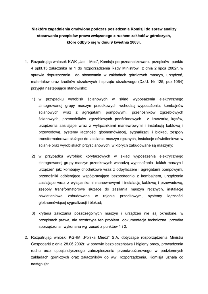 Niektóre zagadnienia omówione podczas posiedzenia Komisji do spraw analizy stosowania przepisów prawa związanego z ruchem zakładów górniczych, które odbyło się w dniu 9 kwietnia 2003r. 1. Rozpatrując wniosek KWK „Jas - Mos”, Komisja po przeanalizowaniu przepisów punktu 4 ppkt.15 załącznika nr 1 do rozporządzenia Rady Ministrów z dnia 2 lipca 2002r. w sprawie dopuszczania do stosowania w zakładach górniczych maszyn, urządzeń, materiałów oraz środków strzałowych i sprzętu strzałowego (Dz.U. Nr 125, poz.1064) przyjęła następujące stanowisko: 1) w przypadku wyrobisk ścianowych w skład wyposażenia elektrycznego zintegrowanej grupy maszyn przodkowych wchodzą wyposażenia; kombajnów ścianowych wraz z agregatami pompowymi, przenośników ścianowych, przenośników zgrzebłowych podścianowych zgrzebłowych z kruszarką kęsów, urządzenia zasilające wraz z wyłącznikami manewrowymi i instalacją kablową i przewodową, systemy łączności głośnomówiącej, sygnalizacji i blokad, zespoły transformatorowe służące do zasilania maszyn ręcznych, instalacje oświetleniowe w ścianie oraz wyrobiskach przyścianowych, w których zabudowane są maszyny; 2) w przypadku wyrobisk korytarzowych w skład wyposażenia elektrycznego zintegrowanej grupy maszyn przodkowych wchodzą wyposażenia takich maszyn i urządzeń jak: kombajny chodnikowe wraz z odpylaczem i agregatami pompowymi, przenośniki odbierające współpracujące bezpośrednio z kombajnem, urządzenia zasilające wraz z wyłącznikami manewrowymi i instalacją kablową i przewodową, zespoły transformatorowe służące do zasilania maszyn ręcznych, instalacje oświetleniowe zabudowane w rejonie przodkowym, systemy łączności głośnomówiącej sygnalizacji i blokad; 3) kryteria zaliczania poszczególnych maszyn i urządzeń nie są określone, w przepisach prawa, ale rozstrzyga ten problem dokumentacja techniczna przodka sporządzona i wykonana wg zasad z punktów 1 i 2. 2. Rozpatrując wnioski KGHM „Polska Miedź” S.A. dotyczące rozporządzenia Ministra Gospodarki z dnia 28.06.2002r. w sprawie bezpieczeństwa i higieny pracy, prowadzenia ruchu oraz specjalistycznego zabezpieczenia przeciwpożarowego w podziemnych zakładach górniczych oraz załączników do ww. rozporządzenia, Komisja uznała co następuje: 2 1) Załącznik nr 1, wzór nr 26 „Wykaz wyrobisk zagrożonych radiacyjnie”: Do wzoru na obliczanie dawki indywidualnej H= 0,011 x Σ x t zastosowany został niewłaściwy współczynnik. Wartość tego współczynnika zamiast „0,11”, powinna wynosić „0,0033”. Poprawny zapis przedmiotowego wzoru H = 0,0033 x Σ x t. 2) Załącznik nr 1, wzór nr 30 „Arkusz kontroli dawek indywidualnych na podstawie badań środowiskowych”: Do wzoru na obliczanie efektywnego równoważnika dawki : HRa = (3,7 x 10 –7 x cRaw + 1,8 - 10-5 x cRao) x t zastosowany został niewłaściwy wykładnik potęgi w pierwszym wyrażeniu zamiast „10-7” powinno być „10-6”. Ponadto w drugim wyrażeniu znak odejmowania „-„ ; powinien być zastąpiony znakiem mnożenia „x”. Poprawny zapis przedmiotowego wzoru: HRa = ( 3,7 x 10-6 x cRaw + 1,8 x 10-5 x cRao) x t Proponuje się dokonanie zmian w przedmiotowych przepisach. 3. Odpowiadając na pytania KWK „Śląsk” w sprawie interpretacji przepisów § 673 pkt.2.3.4.5.8 rozporządzenia Ministra Gospodarki z dnia 28 czerwca 2002r. w sprawie bezpieczeństwa i higieny pracy, prowadzenia ruchu oraz specjalistycznego zabezpieczenia przeciwpożarowego w podziemnych zakładach górniczych Komisja uznała, że przedstawione w piśmie zagadnienia uregulowane są przepisami rozporządzenia Ministra Pracy i Polityki Społecznej z dnia 26 września 1997r. w sprawie ogólnych przepisów bezpieczeństwa i higieny pracy (Dz.U.Nr 129, poz.844). W odpowiedzi na zapytania uznano: ● Usytuowanie i wyposażenie punktów opatrunkowych reguluje § 673 pkt.2: „ W wyrobiskach i na powierzchni zakładu górniczego organizuje się odpowiednio wyposażone punkty opatrunkowe”. Ilość, usytuowanie i wyposażenie punktów pierwszej pomocy i apteczek powinny być ustalone w porozumieniu z lekarzem sprawującym profilaktyczną opiekę zdrowotną nad pracownikami, z uwzględnieniem rodzajów i nasilenia występujących zagrożeń. Miejsca usytuowania punktów 3 opatrunkowych (miejsca pierwszej pomocy) oraz ich wyposażenie powinno być szczegółowo opisane w Dokumencie Bezpieczeństwa w myśl § 6 pkt.1 załącznik 2 rozporządzenia Ministra Gospodarki z dnia 28 czerwca 2002r. w sprawie bezpieczeństwa i higieny pracy, prowadzenia ruchu oraz specjalistycznego zabezpieczenia przeciwpożarowego w podziemnych zakładach górniczych. Punkty opatrunkowe (pierwszej pomocy) powinny znajdować się w każdym oddziale. ● Punkty opatrunkowe powinny znajdować się w pobliżu miejsc stałego zatrudnienia pracowników zgodnie z § 673 pkt. 3 „Punkt opatrunkowy urządza się w miejscu łatwo dostępnym i oznacza tablicą informacyjną”. ● Zgodnie z § 673 pkt.4 „Osoby dozoru ruchu, przodowych oraz strzałowych szkoli się w udzielaniu pierwszej pomocy”. Obowiązek szkolenia osób dozoru, przodowych i strzałowych w zakresie udzielenia pierwszej pomocy realizowany jest przez stosowanie rozporządzenie Ministra Pracy i Polityki Społecznej z dnia 28 maja 1996r. w sprawie szczegółowych zasad szkolenia w dziedzinie bezpieczeństwa i higieny pracy (Dz.U.Nr 62 poz.265). Szkolenie w zakresie udzielania pierwszej pomocy powinno być prowadzone przez wykwalifikowany personel medyczny. ● Według § 673 pkt.8: „ W przypadku gdy pracownik ulegnie wypadkowi przy pracy lub zachoruje , osoba znajdująca się w pobliżu pracownika natychmiast powiadamia najbliższa osobę dozoru ruchu, przodowego lub strzałowego; osoby te niezwłocznie udzielają pierwszej pomocy i organizują pomoc medyczną a w razie potrzeby specjalistyczny transport sanitarny”. Powyższy przepi