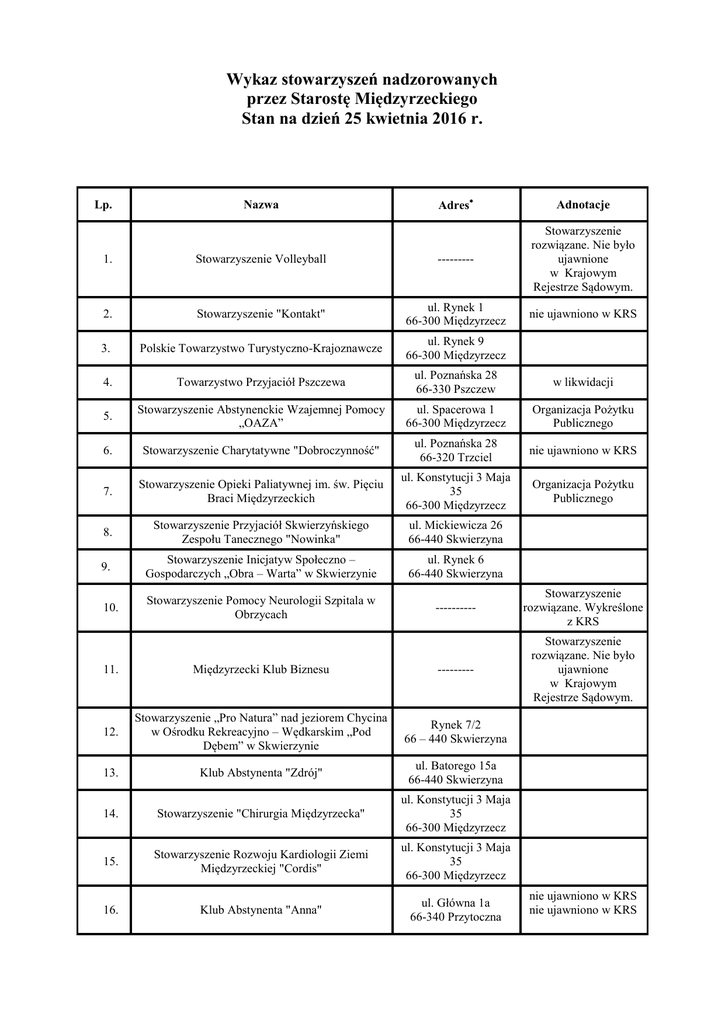 Wykaz stowarzyszeń nadzorowanych przez Starostę Międzyrzeckiego Stan na dzień 25 kwietnia 2016 r. Lp. Nazwa Adres Adnotacje 1. Stowarzyszenie Volleyball --------- Stowarzyszenie rozwiązane. Nie było ujawnione w Krajowym Rejestrze Sądowym. 2. Stowarzyszenie "Kontakt" ul. Rynek 1 66-300 Międzyrzecz nie ujawniono w KRS 3. Polskie Towarzystwo Turystyczno-Krajoznawcze ul. Rynek 9 66-300 Międzyrzecz 4. Towarzystwo Przyjaciół Pszczewa ul. Poznańska 28 66-330 Pszczew w likwidacji 5. Stowarzyszenie Abstynenckie Wzajemnej Pomocy „OAZA” ul. Spacerowa 1 66-300 Międzyrzecz Organizacja Pożytku Publicznego 6. Stowarzyszenie Charytatywne "Dobroczynność" ul. Poznańska 28 66-320 Trzciel nie ujawniono w KRS 7. Stowarzyszenie Opieki Paliatywnej im. św. Pięciu Braci Międzyrzeckich ul. Konstytucji 3 Maja 35 66-300 Międzyrzecz Organizacja Pożytku Publicznego 8. Stowarzyszenie Przyjaciół Skwierzyńskiego Zespołu Tanecznego "Nowinka" ul. Mickiewicza 26 66-440 Skwierzyna 9. Stowarzyszenie Inicjatyw Społeczno – Gospodarczych „Obra – Warta” w Skwierzynie ul. Rynek 6 66-440 Skwierzyna 10. Stowarzyszenie Pomocy Neurologii Szpitala w Obrzycach ---------- Stowarzyszenie rozwiązane. Wykreślone z KRS Stowarzyszenie rozwiązane. Nie było ujawnione w Krajowym Rejestrze Sądowym. 11. Międzyrzecki Klub Biznesu --------- 12. Stowarzyszenie „Pro Natura” nad jeziorem Chycina w Ośrodku Rekreacyjno – Wędkarskim „Pod Dębem” w Skwierzynie Rynek 7/2 66 – 440 Skwierzyna 13. Klub Abstynenta "Zdrój" ul. Batorego 15a 66-440 Skwierzyna 14. Stowarzyszenie "Chirurgia Międzyrzecka" ul. Konstytucji 3 Maja 35 66-300 Międzyrzecz 15. Stowarzyszenie Rozwoju Kardiologii Ziemi Międzyrzeckiej "Cordis" ul. Konstytucji 3 Maja 35 66-300 Międzyrzecz 16. Klub Abstynenta "Anna" ul. Główna 1a 66-340 Przytoczna nie ujawniono w KRS nie ujawniono w KRS Stowarzyszenie rozwiązane. Wykreślone z KRS 17. Stowarzyszenie Dla Ochrony i Promocji Zdrowia Psychicznego --------- 18. Towarzystwo Społeczno-Kulturalne "Obra" Policko 7/1 66-330 Pszczew nie ujawniono w KRS 19. Stowarzyszenie Agroturystyki ul. Podzamcze 2 66-300 Międzyrzecz nie ujawniono w KRS 20. Stowarzyszenie Rodziców Dzieci Niepełnosprawnych "Ocalenie" ---------- 21. Stowarzyszenie Rozwoju Ginekologii i Perinatologii ul. Konstytucji 3 Maja 35 66-300 Międzyrzecz Wykreślono z Krajowego Rejestru Sądowego. Stowarzyszenie rozwiązane. Nie było ujawnione w Krajowym Rejestrze Sądowym. 22. Międzynarodowe Centrum Integracyjne w Głębokiem ---------- 23. Lubuskie Stowarzyszenie Promocji i Rozwoju Turystyki ul. Podzamcze 2 66-300 Międzyrzecz 24. Stowarzyszenie Rozwoju Anestezjologii Reanimacji i Intensywnej Terapii Ziemi Lubuskiej "Przywróceni Życiu" ul. Konstytucji 3 maja 35 66-300 Międzyrzecz tel. 0-95 741-22-91 w. 268 25. Stowarzyszenie Fryzjerów i Kosmetyków Województwa Lubuskiego ---------- 26. Towarzystwo Miłośników Skwierzyny ul. Sportowa 1 66-440 Skwierzyna 27. Stowarzyszenie Amazonek SP ZOZ Międzyrzecz Zakład Rehabilitacji 28. Międzyrzeckie Stowarzyszenie Rozwoju Pediatrii Międzyrzeckiej ul. Konstytucji 3 Maja 35 Oddział Dziecięcy Samodzielnego Publicznego Zakładu Opieki Zdrowotnej 66-300 Międzyrzecz 29. Międzyrzeckie Stowarzyszenie "Szansa" na Rzecz Dzieci i Młodzieży Niepełnosprawnej Uzdolnionej Artystycznie ul. Staszica 9 66-300 Międzyrzecz 30. Stowarzyszenie Miłośników Trzciela ul. Poznańska 9 66-320 Trzciel Organizacja Pożytku Publicznego Stowarzyszenie rozwiązane. Nie było ujawnione w Krajowym Rejestrze Sądowym. 31. Stowarzyszenie Wzajemnej Pomocy "VIS MAIOR" ---------- 32. Stowarzyszenie Kupieckie w Międzyrzeczu ul. Prusa 1a/9 66-300 Międzyrzecz 33. Stowarzyszenie Nadobrzańskiego Klubu Płetwonurków w Skwierzynie ul. Pola Międzyrzeckie 16A nie ujawniono w KRS Organizacja Pożytku Publicznego Stowarzyszenie rozwiązane. Wykreślone z KRS nie ujawniono w KRS nie ujawniono w KRS 66-440 Skwierzyna 34. Towarzystwo Przyjaciół św. Klary z Asyżu w Międzyrzeczu ---------- W związku ze zmianą siedziby stowarzyszenia, akta przekazano do nowego Organu Sprawującego Nadzór - Prezydenta Kalisza W związku ze zmianą siedziby stowarzyszenia, akta przekazano do nowego Organu Sprawującego Nadzór - Prezydenta Gorzowa Wlkp. 35. Stowarzyszenie Osób z Uszkodzoną Wątrobą „Życie Po Przeszczepie” ---------- 36. Wolne Dobroczynne Stowarzyszenie "Dary Serca" w Międzyrzeczu ul. Poznańska 109/17b 66-300 Międzyrzecz 37. Parafia RzymskoKatolicka p.w. Św. Jana Koło Stowarzyszenia Rodzin Katolickich w parafii Chrzciciela p.w. Św. Jana Chrzciciela w Międzyrzeczu ul. Spokojna 6 66-300 Międzyrzecz 38. Gminna Grupa Międzyrzeczan ---------- Wykreślono z Krajowego Rejestru Sądowego 39. Stowarzyszenie Budowy i Działalności Ośrodka Leczniczo – Dydaktycznego „Lubuskie Centrum Rehabilitacji i Hipoterapii” w Trzcielu ---------- Wykreślono z Krajowego Rejestru Sądowego. Stowarzyszenie rozwiązane. Wykreślone z KRS 40. Stowarzyszenie Młodych Skwierzyniaków ---------- 41. Towarzystwo Miłośników Międzyrzeckiego Rejonu Umocnionego w Międzyrzeczu ul. Księdza Skargi 6 66-300 Międzyrzecz 42. Polsko-Niemieckie Stowarzyszenie Europejskiego Kształcenia Zawodowego w Bobowicku ul. Międzyrzecka 7A 66-300 Międzyrzecz 43. Zakład Doskonalenia Zawodowego w Międzyrzeczu Stowarzyszenie Oświatowe ul. Staszica 20 66-300 Międzyrzecz 44. Stowarzyszenie "NASZA WIEŚ JUTRO" Stary Dwór 52 66-304 Brójce 45. Stowarzyszenie Przyjaciół Studia Tańca "REMIX" ul. Teatralna 5 66-440 Skwierzyna Organizacja Pożytku Publicznego 46. Oddział Skwierzyńsko – Międzyrzecki Stowarzyszenia „Dzieci Wojny” w Skwierzynie ---------- Wykreślono z Krajowego Rejestru Sądowego 47. Stowarzyszenie "Zdrowie i Wypoczynek" ul. Poznańska 105b/7 66-300 Międzyrzecz 48. Stowarzyszenie "Jedność Patriotyczna" im. R. ---------- brak władz w likwidacji Stowarzyszenie rozwiązane. Wykreślone z KRS Dmowskiego 49. Stowar