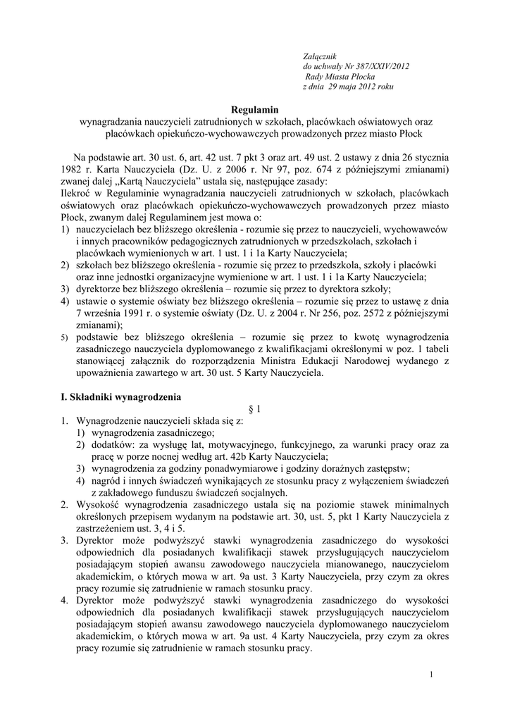 Załącznik do uchwały Nr 387/XXIV/2012 Rady Miasta Płocka z dnia 29 maja 2012 roku Regulamin wynagradzania nauczycieli zatrudnionych w szkołach, placówkach oświatowych oraz placówkach opiekuńczo-wychowawczych prowadzonych przez miasto Płock Na podstawie art. 30 ust. 6, art. 42 ust. 7 pkt 3 oraz art. 49 ust. 2 ustawy z dnia 26 stycznia 1982 r. Karta Nauczyciela (Dz. U. z 2006 r. Nr 97, poz. 674 z późniejszymi zmianami) zwanej dalej „Kartą Nauczyciela” ustala się, następujące zasady: Ilekroć w Regulaminie wynagradzania nauczycieli zatrudnionych w szkołach, placówkach oświatowych oraz placówkach opiekuńczo-wychowawczych prowadzonych przez miasto Płock, zwanym dalej Regulaminem jest mowa o: 1) nauczycielach bez bliższego określenia - rozumie się przez to nauczycieli, wychowawców i innych pracowników pedagogicznych zatrudnionych w przedszkolach, szkołach i placówkach wymienionych w art. 1 ust. 1 i 1a Karty Nauczyciela; 2) szkołach bez bliższego określenia - rozumie się przez to przedszkola, szkoły i placówki oraz inne jednostki organizacyjne wymienione w art. 1 ust. 1 i 1a Karty Nauczyciela; 3) dyrektorze bez bliższego określenia – rozumie się przez to dyrektora szkoły; 4) ustawie o systemie oświaty bez bliższego określenia – rozumie się przez to ustawę z dnia 7 września 1991 r. o systemie oświaty (Dz. U. z 2004 r. Nr 256, poz. 2572 z późniejszymi zmianami); 5) podstawie bez bliższego określenia – rozumie się przez to kwotę wynagrodzenia zasadniczego nauczyciela dyplomowanego z kwalifikacjami określonymi w poz. 1 tabeli stanowiącej załącznik do rozporządzenia Ministra Edukacji Narodowej wydanego z upoważnienia zawartego w art. 30 ust. 5 Karty Nauczyciela. I. Składniki wynagrodzenia §1 1. Wynagrodzenie nauczycieli składa się z: 1) wynagrodzenia zasadniczego; 2) dodatków: za wysługę lat, motywacyjnego, funkcyjnego, za warunki pracy oraz za pracę w porze nocnej według art. 42b Karty Nauczyciela; 3) wynagrodzenia za godziny ponadwymiarowe i godziny doraźnych zastępstw; 4) nagród i innych świadczeń wynikających ze stosunku pracy z wyłączeniem świadczeń z zakładowego funduszu świadczeń socjalnych. 2. Wysokość wynagrodzenia zasadniczego ustala się na poziomie stawek minimalnych określonych przepisem wydanym na podstawie art. 30, ust. 5, pkt 1 Karty Nauczyciela z zastrzeżeniem ust. 3, 4 i 5. 3. Dyrektor może podwyższyć stawki wynagrodzenia zasadniczego do wysokości odpowiednich dla posiadanych kwalifikacji stawek przysługujących nauczycielom posiadającym stopień awansu zawodowego nauczyciela mianowanego, nauczycielom akademickim, o których mowa w art. 9a ust. 3 Karty Nauczyciela, przy czym za okres pracy rozumie się zatrudnienie w ramach stosunku pracy. 4. Dyrektor może podwyższyć stawki wynagrodzenia zasadniczego do wysokości odpowiednich dla posiadanych kwalifikacji stawek przysługujących nauczycielom posiadającym stopień awansu zawodowego nauczyciela dyplomowanego nauczycielom akademickim, o których mowa w art. 9a ust. 4 Karty Nauczyciela, przy czym za okres pracy rozumie się zatrudnienie w ramach stosunku pracy. 1 5. Wynagrodzenie zasadnicze dyrektora ustala się w wysokości 130% podstawy, przy czym kwota tego wynagrodzenia zostaje zaokrąglona do pełnych złotych przez pominięcie cyfr po przecinku, jeżeli stanowią one kwotę poniżej 50 groszy, a co najmniej 50 groszy liczy się za 1 złoty. II. Dodatek za wysługę lat 1. 2. 3. 4. 5. 6. 7. 8. 9. §2 Nauczycielom przysługuje dodatek za wysługę lat w wysokości 1% wynagrodzenia zasadniczego za każdy rok pracy, wypłacany w okresach miesięcznych poczynając od czwartego roku pracy z tym, że dodatek ten nie może przekroczyć 20% wynagrodzenia zasadniczego. Do okresów uprawniających do dodatku za wysługę lat wlicza się okresy poprzedniego zatrudnienia we wszystkich zakładach pracy, w których stosunek pracy został rozwiązany lub wygasł, bez względu na sposób ustania stosunku pracy. Nauczycielowi pozostającemu jednocześnie w więcej niż w jednym stosunku pracy okresy uprawniające do dodatku za wysługę lat ustala się odrębnie dla każdego stosunku pracy, z zastrzeżeniem ust. 4 i 5. Do okresu zatrudnienia uprawniającego do dodatku za wysługę lat nie wlicza się okresu pracy w innym zakładzie pracy, w którym pracownik jest lub był jednocześnie zatrudniony. Do okresu dodatkowego zatrudnienia nie podlegają zaliczeniu okresy podstawowego zatrudnienia. Nauczycielowi zatrudnionemu jednocześnie w kilku szkołach w wymiarze łącznie nie przekraczającym obowiązującego nauczyciela wymiaru zajęć, do okresów uprawniających do dodatku za wysługę lat w każdej ze szkół zalicza się okresy zatrudnienia, o których mowa w ust. 2. Do okresów pracy wymaganych do nabycia prawa do dodatku za wysługę lat zalicza się wszystkie okresy pracy oraz inne okresy zaliczane na podstawie odrębnych przepisów. Do okresów pracy uprawniających do dodatku za wysługę lat wlicza się także inne okresy, jeżeli z mocy odrębnych przepisów podlegają one wliczeniu do okresu pracy, od którego zależą uprawnienia pracownicze. Dodatek za wysługę lat przysługuje: 1) począwszy od pierwszego dnia miesiąca kalendarzowego następującego po miesiącu, w którym nauczyciel nabył prawo do dodatku lub wyższej stawki dodatku, jeżeli nabycie prawa nastąpiło w ciągu miesiąca, 2) za dany miesiąc, jeżeli nabycie prawa do dodatku lub wyższej jego stawki nastąpiło od pierwszego dnia miesiąca. Dodatek za wysługę lat przysługuje nauczycielowi za okres urlopu dla poratowania zdrowia oraz za dni, za które otrzymuje wynagrodzenie, chyba, że przepis szczególny stanowi inaczej. Dodatek ten przysługuje również za dni nieobecności w pracy z powodu niezdolności do pracy wskutek choroby bądź konieczności osobistego sprawowania opieki nad dzieckiem lub chorym członkiem rodziny, za które nauczyciel otrzymuje w