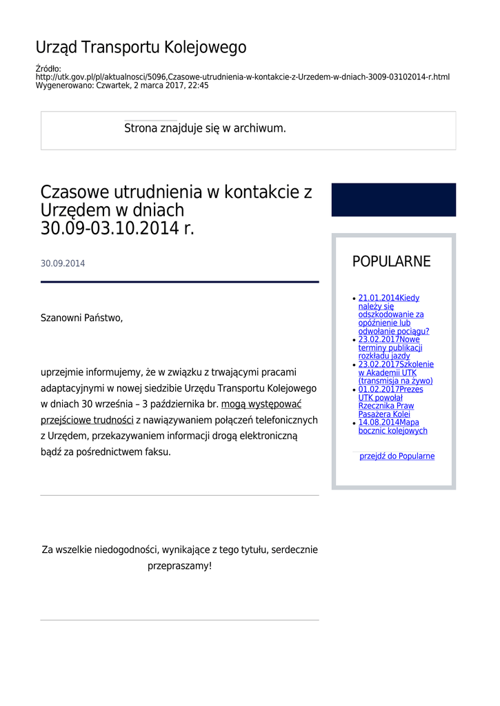 Urząd Transportu Kolejowego Źródło: http://utk.gov.pl/pl/aktualnosci/5096,Czasowe-utrudnienia-w-kontakcie-z-Urzedem-w-dniach-3009-03102014-r.html Wygenerowano: Czwartek, 2 marca 2017, 22:45 Strona znajduje się w archiwum. Czasowe utrudnienia w kontakcie z Urzędem w dniach 30.09-03.10.2014 r. POPULARNE 30.09.2014 ● Szanowni Państwo, ● uprzejmie informujemy, że w związku z trwającymi pracami adaptacyjnymi w nowej siedzibie Urzędu Transportu Kolejowego ● ● w dniach 30 września – 3 października br. mogą występować przejściowe trudności z nawiązywaniem połączeń telefonicznych z Urzędem, przekazywaniem informacji drogą elektroniczną bądź za pośrednictwem faksu. Za wszelkie niedogodności, wynikające z tego tytułu, serdecznie przepraszamy! ● 21.01.2014Kiedy należy się odszkodowanie za opóźnienie lub odwołanie pociągu? 23.02.2017Nowe terminy publikacji rozkładu jazdy 23.02.2017Szkolenie w Akademii UTK (transmisja na żywo) 01.02.2017Prezes UTK powołał Rzecznika Praw Pasażera Kolei 14.08.2014Mapa bocznic kolejowych przejdź do Popularne