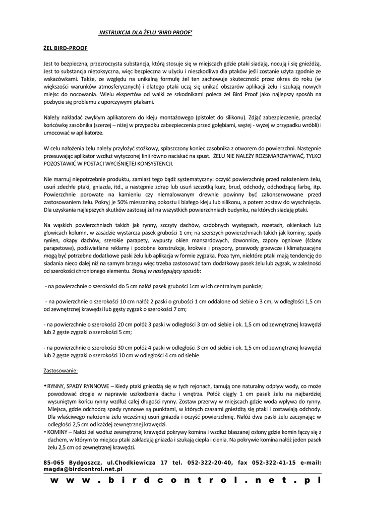 INSTRUKCJA DLA ŻELU ‘BIRD PROOF’ ŻEL BIRD-PROOF Jest to bezpieczna, przezroczysta substancja, którą stosuje się w miejscach gdzie ptaki siadają, nocują i się gnieżdżą. Jest to substancja nietoksyczna, więc bezpieczna w użyciu i nieszkodliwa dla ptaków jeśli zostanie użyta zgodnie ze wskazówkami. Także, ze względu na unikalną formułę żel ten zachowuje skuteczność przez okres do roku (w większości warunków atmosferycznych) i dlatego ptaki uczą się unikać obszarów aplikacji żelu i szukają nowych miejsc do nocowania. Wielu ekspertów od walki ze szkodnikami poleca żel Bird Proof jako najlepszy sposób na pozbycie się problemu z uporczywymi ptakami. Należy nakładać zwykłym aplikatorem do kleju montażowego (pistolet do silikonu). Zdjąć zabezpieczenie, przeciąć końcówkę zasobnika (szerzej – niżej w przypadku zabezpieczenia przed gołębiami, wężej - wyżej w przypadku wróbli) i umocować w aplikatorze. W celu nałożenia żelu należy przyłożyć stożkowy, spłaszczony koniec zasobnika z otworem do powierzchni. Następnie przesuwając aplikator wzdłuż wytyczonej linii równo naciskać na spust. ŻELU NIE NALEŻY ROZSMAROWYWAĆ, TYLKO POZOSTAWIĆ W POSTACI WYCIŚNIĘTEJ KONSYSTENCJI. Nie marnuj niepotrzebnie produktu, zamiast tego bądź systematyczny: oczyść powierzchnię przed nałożeniem żelu, usuń zdechłe ptaki, gniazda, itd., a następnie zdrap lub usuń szczotką kurz, brud, odchody, odchodzącą farbę, itp. Powierzchnie porowate na kamieniu czy niemalowanym drewnie powinny być zakonserwowane przed zastosowaniem żelu. Pokryj je 50% mieszaniną pokostu i białego kleju lub silikonu, a potem zostaw do wyschnięcia. Dla uzyskania najlepszych skutków zastosuj żel na wszystkich powierzchniach budynku, na których siadają ptaki. Na wąskich powierzchniach takich jak rynny, szczyty dachów, ozdobnych występach, rozetach, okienkach lub głowicach kolumn, w zasadzie wystarcza pasek grubości 1 cm; na szerszych powierzchniach takich jak kominy, spady rynien, okapy dachów, szerokie parapety, wypusty okien mansardowych, dzwonnice, zapory ogniowe (ściany parapetowe), podświetlane reklamy i podobne konstrukcje, krokwie i przypory, przewody grzewcze i klimatyzacyjne mogą być potrzebne dodatkowe paski żelu lub aplikacja w formie zygzaka. Poza tym, niektóre ptaki mają tendencję do siadania nieco dalej niż na samym brzegu więc trzeba zastosować tam dodatkowy pasek żelu lub zygzak, w zależności od szerokości chronionego elementu. Stosuj w następujący sposób: - na powierzchnie o szerokości do 5 cm nałóż pasek grubości 1cm w ich centralnym punkcie; - na powierzchnie o szerokości 10 cm nałóż 2 paski o grubości 1 cm oddalone od siebie o 3 cm, w odległości 1,5 cm od zewnętrznej krawędzi lub gęsty zygzak o szerokości 7 cm; - na powierzchnie o szerokości 20 cm połóż 3 paski w odległości 3 cm od siebie i ok. 1,5 cm od zewnętrznej krawędzi lub 2 gęste zygzaki o szerokości 5 cm; - na powierzchnie o szerokości 30 cm połóż 4 paski w odległości 3 cm od siebie i ok. 1,5 cm od zewnętrznej krawędzi lub 2 gęste zygzaki o szerokości 10 cm w odległości 4 cm od siebie Zastosowanie: • RYNNY, SPADY RYNNOWE – Kiedy ptaki gnieżdżą się w tych rejonach, tamują one naturalny odpływ wody, co może powodować drogie w naprawie uszkodzenia dachu i wnętrza. Połóż ciągły 1 cm pasek żelu na najbardziej wysuniętym końcu rynny wzdłuż całej długości rynny. Zostaw przerwy w miejscach gdzie woda wpływa do rynny. Miejsca, gdzie odchodzą spady rynnowe są punktami, w których czasami gnieżdżą się ptaki i zostawiają odchody. Dla właściwego nałożenia żelu wcześniej usuń gniazda i oczyść powierzchnię. Nałóż dwa paski żelu zaczynając w odległości 2,5 cm od każdej zewnętrznej krawędzi. • KOMINY – Nałóż żel wzdłuż zewnętrznej krawędzi pokrywy komina i wzdłuż blaszanej osłony gdzie komin łączy się z dachem, w którym to miejscu ptaki zakładają gniazda i szukają ciepła i cienia. Na pokrywie komina nałóż jeden pasek żelu 2,5 cm od zewnętrznej krawędzi. 85-065 Bydgoszcz, ul.Chodkiewicza 17 tel. 052-322-20-40, fax 052-322-41-15 e-mail: [email protected] w w w . b i r d c o n t r o l . n e t . p l • BALKONY – Tam, gdzie szczyty balustrad wymagają ochrony przed ptakami, zabezpiecz powierzchnię naklejając najpierw na nie plaster, a potem nakładając żel na ten plaster. Także zabezpiecz podłogę balkonów pod balustradami w odległości 2,5 cm od zewnętrznej krawędzi. Pamiętaj, aby poinformować domowników o obszarach pokrytych żelem. Jeśli ptaki nie będą siadały w tych miejscach, usuń plaster z balustrady. • RZEŹBY, POWIERZCHNIE POFAŁDOWANE – Nanieś żel tam, gdzie ptaki siadają i prawdopodobnie nocują. • ZWIEŃCZENIA KOLUMN – Nanieś żel w postaci pasków grubości 1 cm) ok. 2,5 cm) od zewnętrznej krawędzi i na wszystkie przyległe miejsca gdziekolwiek widać znaki obecności ptaków. Pamiętaj, że oprócz funkcjonalności, kolumny i ich zwieńczenia mają być atrakcyjne, więc należy robić to starannie i uważnie z dbałością o szczegóły! • PODŚWIETLANE REKLAMY, ZNAKI, NEONY, LITERY I PODOBNE STRUKTURY – Wyłącz prąd elektryczny przed użyciem żelu na podświetlanych reklamach. Przed zastosowaniem żelu może zaistnieć potrzeba oczyszczenia powierzchni ze smoły (co powinno się traktować jako opłacalny wydatek). Nałóż żel na wszystkie wsporniki i przypory pod i nad reklamą lub neonem; ilość pasków żelu lub zygzaków zależeć będzie od dotkliwości problemów z ptakami i szerokości powierzchni. Może się przydać kontakt z przedstawicielami serwisu od tej reklamy dla upewnienia się, że żel nie zostanie naniesiony na powierzchnie gdzie serwisanci będą chodzić. Dla obliczenia ilości żelu wymaganego dla danej reklamy, oblicz szacunkowo mierząc odległość od jednego końca rekl
