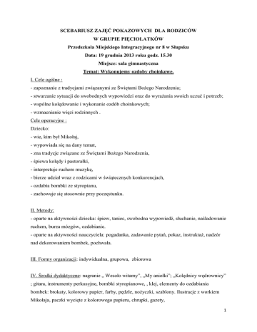SCEBARIUSZ ZAJĘĆ POKAZOWYCH DLA RODZICÓW W GRUPIE PIĘCIOLATKÓW Przedszkola Miejskiego Integracyjnego nr 8 w Słupsku Data: 19 grudnia 2013 roku godz. 15.30 Miejsce: sala gimnastyczna Temat: Wykonujemy ozdoby choinkowe. I. Cele ogólne : - zapoznanie z tradycjami związanymi ze Świętami Bożego Narodzenia; - stwarzanie sytuacji do swobodnych wypowiedzi oraz do wyrażania swoich uczuć i potrzeb; - wspólne kolędowanie i wykonanie ozdób choinkowych; - wzmacnianie więzi rodzinnych . Cele operacyjne : Dziecko: - wie, kim był Mikołaj, - wypowiada się na dany temat, - zna tradycje związane ze Świętami Bożego Narodzenia, - śpiewa kolędy i pastorałki, - interpretuje ruchem muzykę, - bierze udział wraz z rodzicami w świątecznych konkurencjach, - ozdabia bombki ze styropianu, - zachowuje się stosownie przy poczęstunku. II. Metody: - oparte na aktywności dziecka: śpiew, taniec, swobodna wypowiedź, słuchanie, naśladowanie ruchem, burza mózgów, ozdabianie. - oparte na aktywności nauczyciela: pogadanka, zadawanie pytań, pokaz, instruktaż, nadzór nad dekorowaniem bombek, pochwała. III. Formy organizacji: indywidualna, grupowa, zbiorowa IV. Środki dydaktyczne: nagranie „ Wesoło witamy”, „My aniołki”; „Kolędnicy wędrownicy” ; gitara, instrumenty perkusyjne, bombki styropianowe, , klej, elementy do ozdabiania bombek: brokaty, kolorowy papier, farby, pędzle, nożyczki, szablony. Ilustracje z workiem Mikołaja, paczki wycięte z kolorowego papieru, chrupki, gazety, 1 V. Przebieg: 1. Powitanie: Wesoło witamy, wesoło witamy wszystkich Was, wszystkich Was. Radośnie śpiewamy , radośnie śpiewamy cały czas. Całuski, całuski dzisiaj dla Was mamy, całuski, całuski damy Wam. 2. Powitanie przez nauczyciela Rodziców i dzieci, krótkie wprowadzenie do tematu. Zaproszenie do obejrzenia muzycznego występu dzieci . 3. Występy muzyczne dzieci: prezentacja piosenek o tematyce świątecznej połączona z ruchem.  Piosenka „My aniołki”;  Śpiewanie i granie akompaniamentu perkusyjnego- pastorałka „Skrzypi wóz”;  Tańczące śnieżynki- pokaz do muzyki Vivaldiego;  Prezentacja pastorałki pt „Kolędnicy, wędrownicy”. 4. Rozwiązanie zagadki o Mikołaju. Pod choinką po wigilijnej kolacji, z workiem na plecach wkracza do akcji. Dzieciom rozdaje piękne prezenty, zawsze jest miły i uśmiechnięty. 5. Zabawa muzyczno- ruchowa „Czy wiesz, jaki jest Mikołaj”- udział dzieci i rodziców. Uczestnicy śpiewają piosenkę jednocześnie ilustrując ją ruchem. Czy wiesz , czy wiesz Jaki jest Mikołaj? Taki gruby, Taki długi, Tak tańcuje, prezenty pakuje, jedzie saneczkami, dzwoni dzwoneczkami, z radości podskakuje. 6. Masażyk- rodzice robią dzieciom, następnie dzieci rodzicom. Słońce świeci przez dzień cały (zataczanie dłońmi koła, aż odczujemy ciepło) Pada z nieba śnieżek biały (stukamy w plecy delikatnie opuszkami palców) Idą dzieci na saneczki (stukamy w plecy palcami wskazującymi na przemian, przy kręgosłupie, zaczynając od dołu) 2 Zjeżdżają z wysokiej góreczki(przesuwamy jednocześnie dłonie po plecach, od szyi, w dół kręgosłupa, kreśląc linię falistą) Szczypie mróz (delikatne szczypanie) Wieje wietrzyk(lekko dmuchamy we włosy kolegi) Czy przeszedł cię dreszczyk? (delikatnie szczypiemy w kark) Wierszykowi towarzyszy spokojna melodia relaksacyjna. 7. Lekcja ciszy- przy melodii „Cichej nocy” dzieci podają sobie z rąk do rąk różne symbole świąteczne: dzwonki, lampiony, aniołki, świece, oglądają je w ciszy wsłuchując się w melodię kolędy. 8. Zaproszenie do konkursów z udziałem dzieci i rodziców.  Pakowanie prezentów do worka świętego Mikołaja: rodzice i dzieci przy pomocy słomek umieszczają prezenty na ilustracja worka Mikołaja.  Kto pierwszy zje chrupka.  Bieg narciarski na gazetach: konkurs dla rodziców.  „Mikołajowe woreczki”- przenoszenie na czas woreczków- rodzice przy pomocy kuchennych szczypiec, dzieci- drewnianych łyżek. 9. Zabawa ruchowa „Jadę, jadę”. 10. Zabawa zręcznościowa: łowimy prezenty od świętego Mikołaja. 11. Zabawa muzyczno- ruchowa „Cześć, na spacer chodź”. 12. Ozdabianie bombek ze styropianu- rodzice i dzieci. 13. Poczęstunek i wspólne śpiewanie kolęd. 14. Podziękowanie za przybycie, wspólne zaśpiewanie na zakończenie pastorałki „Kolędnicy, wędrownicy”. 3