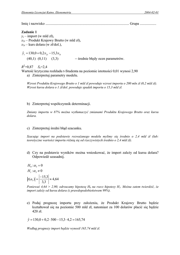 Ekonomia Licencjat Kutno, Ekonometria 2004-02-01 Imię i nazwisko ............................................................................................ Grupa .................. Zadanie 1 yt – import (w mld zł), x2t – Produkt Krajowy Brutto (w mld zł), x3t – kurs dolara (w zł/dol.), yˆ t = 130,0 + 0,2 x2t − 15,3x3t (40,1) (0,11) (3,3) − średnie błędy ocen parametrów. R2=0,87 Se=2,4 Wartość krytyczna rozkładu t-Studenta na poziomie istotności 0,01 wynosi 2,90 a) Zinterpretuj parametry modelu. Wzrost Produktu Krajowego Brutto o 1 mld zł powoduje wzrost importu o 200 mln zł (0,2 mld zł). Wzrost kursu dolara o 1 zł/dol. powoduje spadek importu o 15,3 mld zł. b) Zinterpretuj współczynnik determinacji. Zmiany importu w 87% można wytłumaczyć zmianami Produktu Krajowego Brutto oraz kursu dolara. c) Zinterpretuj średni błąd szacunku. Szacując import na podstawie rozważanego modelu mylimy się średnio o 2,4 mld zł (lub: teoretyczne wartości importu różnią się od rzeczywistych średnio o 2,4 mld zł). d) Czy na podstawie wyników można wnioskować, że import zależy od kursu dolara? Odpowiedź uzasadnij. H 0 :α3 = 0 H1 : α 3 ≠ 0 t ( a3 ) = − 15,3 ≈ 4,64 3,3 Ponieważ 4,64 > 2,90, odrzucamy hipotezę H0 na rzecz hipotezy H1. Można zatem twierdzić, że import zależy od kursu dolara (z prawdopodobieństwem 99%). e) Podaj prognozę importu przy założeniu, że Produkt Krajowy Brutto będzie kształtował się na poziomie 500 mld zł, natomiast za 100 dolarów płacić się będzie 420 zł. yˆ = 130,0 + 0,2 ⋅ 500 − 15,3 ⋅ 4,2 = 165,74 Według prognozy import będzie wynosił 165,74 mld zł. Ekonomia Licencjat Kutno, Ekonometria 2004-02-01 Zadanie 2 Asortyment zakładu produkującego meble szkolne stanowią stoły, ławki i krzesła drewniane (ilości produkowanych stołów, ławek i krzeseł oznaczone są, odpowiednio, przez x1, x2 oraz x3). Produkcja każdego wyrobu odbywa się w trzech fazach: na wydziale obróbki wstępnej drewna, stolarni i lakierni, których dopuszczalny tygodniowy czas pracy wynosi odpowiednio 960, 800 i 320 godzin. Zysk z jednego stołu wynosi 60 zł, z jednej ławki – 30 zł, z jednego krzesła – 18 zł. W oparciu o dane dotyczące potrzebnego czasu obróbki poszczególnych wyrobów w kolejnych fazach, zapisano model optymalizacyjny dla określenia asortymentu produkcji zapewniającego największy zysk. Tablica 1 przedstawia startowe rozwiązanie bazowe. Tablica 1 Wartości zmiennych bazowych Ilorazy wyjścia 0 960 120 1 0 800 100 0 0 1 320 80 0 0 0 0 Zmienne bazowe 60 x1 30 x2 18 x3 0 s1 0 s2 0 s3 0 s1 8 6 3 1 0 0 s2 8 4 3 0 0 s3 4 3 1 -60 -30 -18 c B ∆j=zj−cj Tablica 2 c B Zmienne bazowe x1 x2 x3 s1 s2 s3 Wartości zmiennych bazowych 0 s1 0 0 1 1 0 -2 320 0 s2 0 -2 1 0 1 -2 160 60 x1 1 3/4 1/4 0 0 1/4 80 0 15 -3 0 0 15 4800 ∆j=zj−cj Ilorazy wyjścia a) Uzupełnij tablicę 1. b) Wyznacz kolejne rozwiązanie bazowe w tablicy 2. c) Zapisz rozwiązanie bazowe zawarte w tablicy 2. Jakiej decyzji odpowiada to rozwiązanie? Jaki zysk osiąga zakład postępując według tej decyzji? Rozwiązanie w tablicy 2: x1=80, x2=0, x3=0, s1=320, s2=160, s3=0, f=4800 Decyzja odpowiadająca temu rozwiązaniu polega na produkowaniu tylko stołów, w liczbie 80 szt. Tygodniowy zysk osiągany przy takiej produkcji wynosi 4800 zł. d) Czy rozwiązanie wyznaczone w tablicy 2 jest rozwiązaniem optymalnym? Odpowiedź uzasadnij. Rozwiązanie w tablicy 2 nie jest rozwiązaniem optymalnym, ponieważ nie wszystkie wskaźniki optymalności przyjmują wartości większe lub równe zeru. Ekonomia Licencjat Kutno, Ekonometria 2004-02-01 UWAGA! Przypominam, że gdy stwierdzimy na podstawie testu t-Studenta, że między zmienną objaśnianą a daną zmienną objaśniającą nie występuje zależność, to w praktyce nie powinniśmy interpretować parametru przy danej zmiennej objaśniającej. Jednak na sprawdzianie, jeżeli występuje polecenie zinterpretowania parametrów, to należy je wykonać, niezależnie od wniosków płynących z testu t-Studenta. Na sprawdzianie weryfikujemy bowiem umiejętność interpretacji, natomiast o tym, czy interpretacja jest zasadna, tzn. czy prowadzi do poprawnych i odpowiedzialnych wniosków, rozstrzyga test t-Studenta.