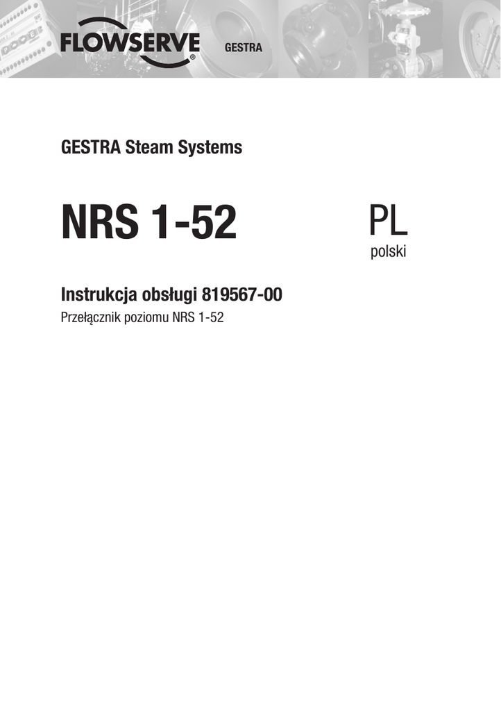 GESTRA GESTRA Steam Systems NRS 1-52 PL polski Instrukcja obsługi 819567-00 Przełącznik poziomu NRS 1-52 1 Spis treści strona Ważne wskazówki Zastosowanie zgodne z przeznaczeniem..................................................................................................4 Zasada działania...................................................................................................................................... 4 Wskazówka bezpieczeństwa....................................................................................................................4 Dyrektywy i normy Biuletyn VdTÜV Poziom wody 100............................................................................................................5 Dyrektywa niskonapięciowa i kompatybilność elektromagnetyczna.........................................................5 ATEX (Atmosphère Explosible = atmosfera wybuchowa)..........................................................................5 Informacja dotycząca deklaracji zgodności/deklaracji producenta .....................................................5 Dane techniczne NRS 1-52..........................................................................................................................................6 – 7 Zawartość opakowania............................................................................................................................ 7 W szafie rozdzielczej: montaż przełącznika poziomu Wymiary NRG 1-52.................................................................................................................................. 8 Legenda.................................................................................................................................................. 8 Montaż w szafie rozdzielczej....................................................................................................................8 Tabliczka znamionowa/oznaczenie...........................................................................................................9 W szafie rozdzielczej: podłączenie elektryczne przełącznika poziomu Schemat połączeń przełącznika poziomu NRS 1-52...............................................................................10 Legenda................................................................................................................................................ 10 Podłączenie napięcia zasilania...............................................................................................................11 Podłączenie styku wyjściowego MIN/MAX..............................................................................................11 Podłączenie elektrody poziomu..............................................................................................................11 Narzędzia.............................................................................................................................................. 11 W instalacji: podłączenie elektryczne elektrody poziomu Podłączenie różnych elektrod poziomu...................................................................................................12 Legenda................................................................................................................................................ 12 Podłączenie elektrody poziomu..............................................................................................................12 2 Spis treści c.d. strona Ustawienia fabryczne Ustawienia fabryczne............................................................................................................................. 13 Uruchamianie Zmiana czułości..................................................................................................................................... 14 Kontrola punktu przełączania i działania.........................................................................................15 – 16 Działanie, alarm i test Wskazania i obsługa..............................................................................................................................17 Pozostałe wskazówki Przeciwdziałanie zakłóceniom wysokoczęstotliwościowym....................................................................19 Wyłączanie urządzenia z eksploatacji/wymiana......................................................................................19 Utylizacja............................................................................................................................................... 19 3 Ważne wskazówki Zastosowanie zgodne z przeznaczeniem Przełącznik poziomu NRS 1-52 w połączeniu z elektrodami poziomu NRG 1.-.. i ER 5. jest stosowany jako sygnalizator wartości poziomów granicznych, np. w kotłach parowych i instalacjach wody gorącej oraz w zbiornikach kondensatu i wody zasilającej. Przełącznik poziomu sygnalizuje osiągnięcie minimalnego i maksymalnego poziomu wody. Zgodnie z przeznaczeniem przełącznik poziomu NRS 1-52 można stosować w połączeniu z następującymi elektrodami poziomu: Elektrody poziomu NRG 10-52, NRG 16-52 elektroda 4-prętowa NRG 16-36 elektroda 4-prętowa NRG 16-4 elektroda 1-prętowa ER 50 elektroda 4-prętowa ER 56 elektroda 4-prętowa Zasada działania Przełącznik poziomu NRS 1-52 działa na zasadzie pomiaru przewodnictwa, wykorzystując przewodność elektryczną wody. Przełącznik poziomu jest przeznaczony do zastosowania w wodzie o różnej przewodności elektrycznej oraz do podłączenia dwóch prętów elektrody. Długość przyporządkowanych prętów elektrody wyznacza punkt przełączania dla poziomów wody MIN i MAX. Gdy poziom wody osiągnie stan MIN lub MAX przełącznik poziomu rozpoznaje zanurzenie lub wynurzenie danego pręta elektrody. Po upływie czasu zwłoki przełącza się styk wejściowy MIN lub MAX. Jednocześnie wskazanie diody LED MIN lub MAX zmien