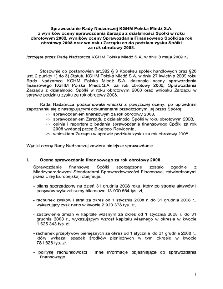 Sprawozdanie Rady Nadzorczej KGHM Polska Miedź S.A. z wyników oceny sprawozdania Zarządu z działalności Spółki w roku obrotowym 2008, wyników oceny Sprawozdania Finansowego Spółki za rok obrotowy 2008 oraz wniosku Zarządu co do podziału zysku Spółki za rok obrotowy 2008. /przyjęte przez Radę Nadzorczą KGHM Polska Miedź S.A. w dniu 8 maja 2009 r./ Stosownie do postanowień art.382 § 3 Kodeksu spółek handlowych oraz §20 ust. 2 punkty 1) do 3) Statutu KGHM Polska Miedź S.A. w dniu 27 kwietnia 2009 roku Rada Nadzorcza KGHM Polska Miedź S.A. dokonała oceny sprawozdania finansowego KGHM Polska Miedź S.A. za rok obrotowy 2008, Sprawozdania Zarządu z działalności Spółki w roku obrotowym 2008 oraz wniosku Zarządu w sprawie podziału zysku za rok obrotowy 2008. Rada Nadzorcza podsumowała wnioski z powyŜszej oceny, po uprzednim zapoznaniu się z następującymi dokumentami przedłoŜonymi jej przez Spółkę: • sprawozdaniem finansowym za rok obrotowy 2008, • sprawozdaniem Zarządu z działalności Spółki w roku obrotowym 2008, • opinią i raportem z badania sprawozdania finansowego Spółki za rok 2008 wydanej przez Biegłego Rewidenta, • wnioskiem Zarządu w sprawie podziału zysku za rok obrotowy 2008. Wyniki oceny Rady Nadzorczej zawiera niniejsze sprawozdanie. I. Ocena sprawozdania finansowego za rok obrotowy 2008 zostało zgodnie z Sprawozdanie finansowe Spółki sporządzone Międzynarodowymi Standardami Sprawozdawczości Finansowej zatwierdzonymi przez Unię Europejską i obejmuje: - bilans sporządzony na dzień 31 grudnia 2008 roku, który po stronie aktywów i pasywów wykazał sumy bilansowe 13 900 564 tys. zł, - rachunek zysków i strat za okres od 1 stycznia 2008 r. do 31 grudnia 2008 r., wykazujący zysk netto w kwocie 2 920 378 tys. zł, - zestawienie zmian w kapitale własnym za okres od 1 stycznia 2008 r. do 31 grudnia 2008 r., wykazującym wzrost kapitału własnego w okresie w kwocie 1 625 343 tys. zł, - rachunek przepływów pienięŜnych za okres od 1 stycznia do 31 grudnia 2008 r., który wykazał spadek środków pienięŜnych w tym okresie w kwocie 781 628 tys. zł, - politykę rachunkowości i inne informacje objaśniające do sprawozdania finansowego. 1 I.1 Bilans na dzień 31 grudnia 2008 roku Strukturę aktywów bilansu stanowią: 1. Aktywa trwałe w wartości 8 703 565 tys. zł , co stanowi 62,6% aktywów ogółem. W strukturze aktywów trwałych: - 5 515 028 tys. zł, tj. 63% aktywów trwałych stanowią aktywa rzeczowe, - akcje i udziały w jednostkach zaleŜnych w kwocie 1 795 013 tys. zł, stanowią ponad 20% aktywów trwałych, - inwestycje w jednostki stowarzyszone w kwocie 1 163 640 tys. zł, stanowią 13,4% aktywów trwałych, 2. Aktywa obrotowe o wartości 5 173 979 tys. zł stanowią 37,2% aktywów ogółem, w tym w strukturze aktywów obrotowych: - zapasy w kwocie 1 446 802 tys. zł.: 28% aktywów obrotowych, - naleŜności z tytułu dostaw i usług oraz pozostałe naleŜności w kwocie 1 222 501 tys. zł. - 23,6 % aktywów obrotowych - środki pienięŜne i ich ekwiwalenty w wartości 1 793 580 tys. zł. - 34,7% aktywów obrotowych. Strukturę pasywów bilansu stanowią: 1. Kapitał własny w kwocie 10 591 292 tys. zł, co stanowi 76,2% źródeł finansowania. W strukturze kapitału własnego pozostają: - kapitał akcyjny 2 000 000 tys. zł, - pozostałe kapitały 518 748 tys. zł, - zyski zatrzymane 8 072 544 tys. zł. 2. Zobowiązania w kwocie 3 309 272 tys. zł, stanowiące 23,8% źródeł finansowania aktywów, z czego: 1 640 668 tys. zł, co stanowi ok. - zobowiązania długoterminowe w kwocie 50% zobowiązań ogółem. Istotne pozycje zobowiązań długoterminowych dotyczą zobowiązań z tytułu świadczeń pracowniczych w kwocie 975 697 tys. zł oraz rezerw na pozostałe zobowiązania (głównie z tyt. przyszłych kosztów likwidacji działalności górniczej) i inne obciąŜenia w wysokości 591 320 tys. zł, - zobowiązania krótkoterminowe w kwocie 1 668 604 tys. zł, tj. 50,4% zobowiązań. Główne pozycje dotyczą zobowiązań z tytułu dostaw i usług oraz pozostałe zobowiązania w wysokości 1 476 088 tys. zł, zobowiązania krótkoterminowe z tytułu świadczeń pracowniczych w kwocie 73 289 tys. zł i zobowiązania z tytułu bieŜącego podatku dochodowego od osób prawnych wynikające z rozliczeń rocznych w kwocie 64 866 tys. zł. 2 I.2 Rachunek zysków i strat za okres od 1.01.-31.12.2008 r. Rachunek zysków i strat za rok obrotowy wykazał przychody ze sprzedaŜy w wysokości 11 302 913 tys. zł oraz koszty sprzedanych produktów, towarów i materiałów w wysokości 7 215 430 tys. zł. Osiągnięto następujące wyniki finansowe : - zysk brutto na sprzedaŜy w wysokości 4 087 483 tys. zł; - EBITDA na poziomie 4 077 740 tys. zł; - zysk na działalności operacyjnej w wysokości 3 596 364 tys. zł; - zysk przed opodatkowaniem w wysokości 3 553 629 tys. zł; - zysk netto na poziomie 2 920 378 tys. zł: Zysk na 1 akcję wyniósł 14,60 zł. I.3 Zestawienie zmian w kapitale własnym za okres od 1.01.-31.12.2008 r. Kapitał własny na koniec roku obrotowego stanowił wartość 10 591 292 tys. zł. Wartość kapitału własnego stanowiły: - kapitał podstawowy 2 000 000 tys. zł - pozostałe kapitały (z aktualizacji wyceny aktywów finansowych) 518 748 tys. zł - zyski zatrzymane 8 072 544 tys. zł z tego: -kapitał zapasowy tworzony zgodnie z art. 396 KSH 660 000 tys. zł -kapitał zapasowy tworzony zgodnie ze Statutem 4 492 166 tys. zł -zysk netto za rok 2008 r. 2 920 378 tys. zł. Na dzień 31 grudnia 2008 roku akcjonariat KGHM Polska Miedź S.A. stanowili: - Skarb Państwa 41,79%, co stanowi 835 899 tys. zł wartości kapitału akcyjnego - pozostali akcjonariusze (posiadający mniej niŜ 5% kapitału zakładowego) 58,21%, co stanowi 1 164 101 tys. zł. wartości kapitału akcyjnego. W roku 2008 nastąpił wzrost kapitału własnego Spółki w kwocie 1 625 343 tys. zł. Zmiana kapita
