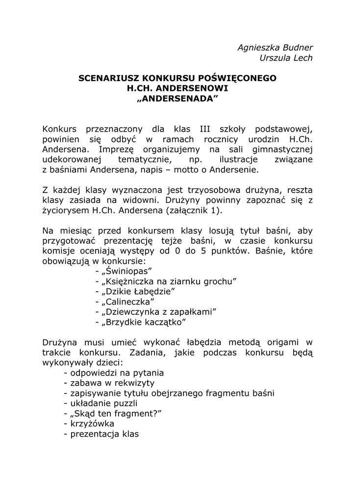 Agnieszka Budner Urszula Lech SCENARIUSZ KONKURSU POŚWIĘCONEGO H.CH. ANDERSENOWI „ANDERSENADA” Konkurs przeznaczony dla klas III szkoły podstawowej, powinien się odbyć w ramach rocznicy urodzin H.Ch. Andersena. Imprezę organizujemy na sali gimnastycznej udekorowanej tematycznie, np. ilustracje związane z baśniami Andersena, napis – motto o Andersenie. Z każdej klasy wyznaczona jest trzyosobowa drużyna, reszta klasy zasiada na widowni. Drużyny powinny zapoznać się z życiorysem H.Ch. Andersena (załącznik 1). Na miesiąc przed konkursem klasy losują tytuł baśni, aby przygotować prezentację tejże baśni, w czasie konkursu komisje oceniają występy od 0 do 5 punktów. Baśnie, które obowiązują w konkursie: - „Świniopas” - „Księżniczka na ziarnku grochu” - „Dzikie Łabędzie” - „Calineczka” - „Dziewczynka z zapałkami” - „Brzydkie kaczątko” Drużyna musi umieć wykonać łabędzia metodą origami w trakcie konkursu. Zadania, jakie podczas konkursu będą wykonywały dzieci: - odpowiedzi na pytania - zabawa w rekwizyty - zapisywanie tytułu obejrzanego fragmentu baśni - układanie puzzli - „Skąd ten fragment?” - krzyżówka - prezentacja klas Aby drużyny i publiczność mogły się włączyć w zabawę, zachęcamy do nauczenia dzieci tekstu piosenki „Mała racja” (załącznik 2). Kiedy przeprowadzałyśmy ten konkurs, nasi uczniowie byli w drugiej klasie, pomagali oni w obsłudze konkursów oraz otrzymali role wykorzystane w przerywnikach konkursu. W scenariuszu tym pojawią się cztery klasy trzecie, nazywane A, B, C, D. Cele: Zapoznanie z baśniami H.Ch. Andersena: - sprawdzenie wiedzy uczniów poprzez zabawę, - mobilizowanie do zdobywania wiedzy, - doskonalenie umiejętności przekazywania przez uczniów nabytych wiadomości, - zachęcenie do czytania książek (spoza kanonu lektur), - rozbudzenie motywacji czytania i rozwijania umiejętności odbioru dzieł literackich. Metody: - ćwiczeń praktycznych, - problemowa, - zabawowa. Czas trwania: około 1,5 godziny Pomoce dydaktyczne: zestaw pytań, krzyżówka, rekwizyty do baśni, puzzle czterech baśni, duże arkusze brystolu, fragmenty trzech baśni napisane na kolorowych kartkach, białe i niebieskie kartki papieru różnej wielkości, karty odpowiedzi, plastikowe pojemniki, stare gazety zwinięte w kule, kleje, flamastry, słowa piosenki dla uczestników, tabela wyników – duża umieszczona w widocznym miejscu i dla każdego członka komisji, dekoracja sali, dyplomy dla uczestników. PYTANIA: 1. Wymień przedmioty, które zrobił Świniopas i sprzedawał córce cesarza za pocałunki? garnuszek z dzwoneczkiem, grzechotka 2. W jaki sposób dzikie łabędzie zabrały swoją siostrę za morze? w siatce 3. W jakiej rodzinie urodziło się brzydkie kaczątko? w kaczej 4. Podaj pełną datę urodzin H.Ch. Andersena. 2 kwietnia 1805 r. 5. Jak brzydkie kaczątko spędziło zimę? Przez całą zimę opiekowali się nim ludzie. REKWIZYTY: Calineczka – orzech Księżniczka na ziarnku grochu – poduszka Brzydkie kaczątko – jajko Dziewczynka z zapałkami – zapałki Dzikie łabędzie – koszula bez rękawa PUZZLE: Zrobiłyśmy je z powiększonych ilustracji do baśni. SKĄD TEN FRAGMENT? Kartka zielona – fragment z baśni „Dzikie łabędzie”, Kartka niebieska – fragment z baśni „Calineczka”, Kartka pomarańczowa – fragment z baśni „Księżniczka na ziarnku grochu”. PRZEBIEG: 1. Powitanie. 2. Przedstawienie komisji nadzorującej przebieg konkursu i oceniającej. 3. Przedstawienie drużyn. 4. Wprowadzenie do tematu konkursu (krótki życiorys H.Ch. Andersena, recytacja wiersza W. Chotomskiej „Dzień dobry, Panie Andersenie!” – uczniowie kl. II) 5. Losowanie pytanie przez klasę III a – dobra odp. 1 punkt. 6. Inscenizacja wiersza Józefa Ratajczaka pt. „Podsłuchane w bajkach Andersena” (uczniowie kl. II). 7. Klasa III a prezentuje swoją wylosowaną baśń – pozostałe klasy zapisują na karteczkach tytuł oglądanego fragmentu baśni – poprawna odp. 1 punkt. 8. Zabawa w rekwizyty (drużyny kolejno podchodzą do stolika z rekwizytami, losują karteczkę z tytułem baśni, a następnie dobiera odpowiedni rekwizyt) – dobry rekwizyt 1 punkt. 9. Układanie puzzli i naklejenie je na duży arkusz brystolu a. poprawne ułożenie i podanie tytułu - 2 punkty. b. ułożenie bez podania tytułu baśni - 1 punkt. 10. Losowanie pytania przez klasę III b – dobra odp. 1 punkt. 11. „Taniec kwiatów” – występ klasy II. 12. Klasa III b prezentuje swoją wylosowaną baśń – pozostałe klasy zapisują na karteczkach tytuł oglądanego fragmentu baśni – poprawna odp. 1 punkt. 13. Skąd ten fragment? – dopisanie tytułu baśni do trzech odczytanych fragmentów w kolejności pomarańczowy, niebieski, zielony – każda poprawna odp. 1 pkt. (0-3 pkt). 14. Losowanie pytania przez klasę III c – dobra odp. 1 punkt. 15. Piosenka „Mała racja” (załącznik 2), na środku tańczą i śpiewają uczniowie klas II. 16. Klasa III c prezentuje swoją wylosowaną baśń – pozostałe klasy zapisują na karteczkach tytuł oglądanego fragmentu baśni – poprawna odp. 1 punkt. 17. Losowanie pytania przez klasę III d – dobra odp. 1 punkt. 18. Rozwiązywanie krzyżówki (załącznik 3) – za każdą poprawną odp. 1 punkt (0-8 pkt). 19. Rzuty do celu – zadanie wykonują uczniowie z widowni (cztery osoby z każdej klasy) w trakcie rozwiązywania krzyżówki – celny rzut 1 punkt (0-4 pkt). 20. Klasa III d prezentuje swoją wylosowaną baśń – pozostałe klasy zapisują na karteczkach tytuł oglądanego fragmentu baśni – poprawna odp. 1 punkt. 21. Łabędzia rodzina – drużyny wykonują jak największą liczbę łabędzi metodą origami w ciągu 5 minut. Ile będzie łabędzi, tyle punktów. W tym czasie uczniowie zasiadający na widowni i uczniowie klasy II śpiewają piosenkę pt. „Mała racja”. 22. Komisja podaje sumę punktów 