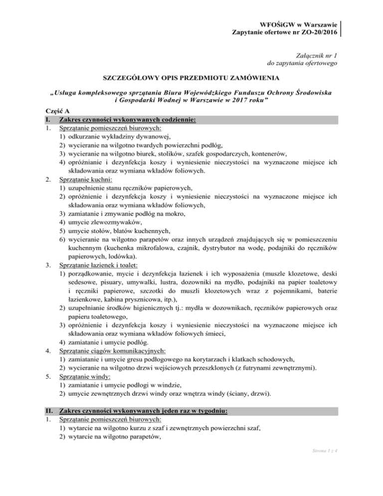 WFOŚiGW w Warszawie Zapytanie ofertowe nr ZO-20/2016 Załącznik nr 1 do zapytania ofertowego SZCZEGÓŁOWY OPIS PRZEDMIOTU ZAMÓWIENIA „Usługa kompleksowego sprzątania Biura Wojewódzkiego Funduszu Ochrony Środowiska i Gospodarki Wodnej w Warszawie w 2017 roku” Część A I. Zakres czynności wykonywanych codziennie: 1. Sprzątanie pomieszczeń biurowych: 1) odkurzanie wykładziny dywanowej, 2) wycieranie na wilgotno twardych powierzchni podłóg, 3) wycieranie na wilgotno biurek, stolików, szafek gospodarczych, kontenerów, 4) opróżnianie i dezynfekcja koszy i wyniesienie nieczystości na wyznaczone miejsce ich składowania oraz wymiana wkładów foliowych. 2. Sprzątanie kuchni: 1) uzupełnienie stanu ręczników papierowych, 2) opróżnienie i dezynfekcja koszy i wyniesienie nieczystości na wyznaczone miejsce ich składowania oraz wymiana wkładów foliowych, 3) zamiatanie i zmywanie podłóg na mokro, 4) umycie zlewozmywaków, 5) umycie stołów, blatów kuchennych, 6) wycieranie na wilgotno parapetów oraz innych urządzeń znajdujących się w pomieszczeniu kuchennym (kuchenka mikrofalowa, czajnik, dystrybutor na wodę, podajniki do ręczników papierowych, lodówka). 3. Sprzątanie łazienek i toalet: 1) porządkowanie, mycie i dezynfekcja łazienek i ich wyposażenia (muszle klozetowe, deski sedesowe, pisuary, umywalki, lustra, dozowniki na mydło, podajniki na papier toaletowy i ręczniki papierowe, szczotki do muszli klozetowych wraz z pojemnikami, baterie łazienkowe, kabina prysznicowa, itp.), 2) uzupełnianie środków higienicznych tj.: mydła w dozownikach, ręczników papierowych oraz papieru toaletowego, 3) opróżnienie i dezynfekcja koszy i wyniesienie nieczystości na wyznaczone miejsce ich składowania oraz wymiana wkładów foliowych śmieci, 4) zamiatanie i umycie podłóg. 4. Sprzątanie ciągów komunikacyjnych: 1) zamiatanie i umycie gresu podłogowego na korytarzach i klatkach schodowych, 2) wycieranie na wilgotno drzwi wejściowych przeszklonych (z futrynami zewnętrznymi). 5. Sprzątanie windy: 1) zamiatanie i umycie podłogi w windzie, 2) umycie zewnętrznych drzwi windy oraz wnętrza windy (ściany, drzwi). II. Zakres czynności wykonywanych jeden raz w tygodniu: 1. Sprzątanie pomieszczeń biurowych: 1) wytarcie na wilgotno kurzu z szaf i zewnętrznych powierzchni szaf, 2) wytarcie na wilgotno parapetów, Strona 1 z 4 WFOŚiGW w Warszawie Zapytanie ofertowe nr ZO-20/2016 3) wytarcie na wilgotno drzwi wejściowych w pokojach z ościeżnicami, 4) wytarcie na wilgotno witryn meblowych, 5) wytarcie na wilgotno cokolików przypodłogowych, 6) wytarcie na wilgotno podstaw krzeseł obrotowych, nóg krzeseł i stołów, 7) wytarcie na wilgotno krzeseł skórzanych i skóropodobnych wraz z podstawą, 8) wytarcie na wilgotno włączników światła oraz gniazdek, 9) odkurzenie mebli tapicerowanych, 10) opróżnianie zawartości niszczarek. Sprzątanie kuchni: 1) wymiana gąbek kuchennych i zmywaków, 2) wytarcie na wilgotno drzwi wejściowych z ościeżnicami, 3) mycie kosza na śmieci, 4) mycie ścian pokrytych płytkami ceramicznymi, 5) wytarcie na wilgotno włączników światła oraz gniazdek. Sprzątanie łazienek: 1) wytarcie na wilgotno drzwi wejściowych oraz drzwi do kabin z ościeżnicami, 2) mycie koszy na śmieci, 3) mycie ścian pokrytych płytkami ceramicznymi, 4) wytarcie na wilgotno włączników światła oraz gniazdek. Sprzątanie ciągów komunikacyjnych: 1) wycieranie na wilgotno drzwi przeszklonych (z futrynami zewnętrznymi) na klatkach schodowych, 2) wycieranie na wilgotno poręczy na klatkach schodowych, 3) wytarcie na wilgotno włączników światła oraz gniazdek. 2. 3. 4. III. Zakres czynności wykonywanych dwa razy w miesiącu: mycie zewnętrzne i wewnętrzne sprzętu AGD (lodówki, kuchenki mikrofalowe, itp.). IV. Zakres czynności wykonywanych raz w miesiącu: zamiatanie i umycie posadzki korytarzy w piwnicy. V. Zakres czynności wykonywanych cztery razy w roku (w terminach uzgodnionych z zamawiającym w trakcie trwania umowy): 1. umycie grzejników, 2. czyszczenie rolet okiennych, 3. mycie okien wewnątrz i zewnątrz wraz ze stolarką okienną i parapetami zewnętrznymi: Zestawienie powierzchni okien w budynku przy ul. Ogrodowej 5/7 w Warszawie Lp. Wymiary okna [cm] Powierzchnia okna [m2] Ilość okien [szt] Powierzchnia wszystkich okien [m2] 1 130x140 1,82 35 63,70 2 150x140 2,10 16 33,60 3 70x50 0,35 4 1,40 Strona 2 z 4 WFOŚiGW w Warszawie Zapytanie ofertowe nr ZO-20/2016 4 70x140 0,98 4 3,92 5 110x100 1,10 16 17,60 75 120,22 łącznie VI. 1) 2) 3) 4) 5) 6) Zakres czynności wykonywanych według potrzeb: usuwanie pajęczyn, usuwanie miejscowych plam na wykładzinach dywanowych i meblach tapicerowanych, wymiana odświeżaczy powietrza i kostek toaletowych, uzupełnianie płynu do mycia naczyń, udrożnianie mechaniczne i chemiczne odpływów kanalizacyjnych (sedesów, pisuarów, umywalek), uzupełnianie wody w kratkach odpływowych w łazienkach. Część B Zakres czynności wykonywanych jeden raz lub dwa razy w roku (w terminach uzgodnionych z zamawiającym w trakcie trwania umowy): 1. maszynowe pranie wykładzin dywanowych (jeden raz w roku), 2. czyszczenie mechaniczne gresu podłogowego na korytarzach, w pomieszczeniach socjalnokuchennych oraz w pokojach biurowych nr 011, 311, 312 (dwa razy w roku). ZESTAWIENIE POWIERZCHNI Pomieszczenie Korytarz Łazienki Kuchnie Korytarz Pomieszczenie biurowe Klatka schodowa Klatka schodowa Łazienki Kuchnia Korytarz Pomieszczenia biurowe Klatka schodowa Klatka schodowa Pokój obsługi beneficjenta Łazienki Kuchnie Korytarz Pomieszczenia biurowe Podłoże Biuro Ogrodowa 5/7 Piwnica Gres Parter Terakota Gres Gres Wykładzina biurowa Kamień Gres I Piętro Terakota Gres Gres Wykładzina biurowa Kamień Gres Gres II Piętro Terakota Gres Gres Wykładzina biurowa Metraż [m²] 51,4 29,1 11,6 138,3 164,4 16,3 16,2 25,9 8,5 157,0 244,7 16,3 16,2 10,5 17,2 10,8 111,0 347,6 Strona 3 z 4 WFO