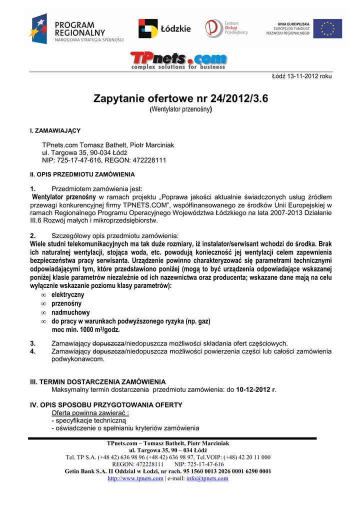 Łódź 13-11-2012 roku Zapytanie ofertowe nr 24/2012/3.6 (Wentylator przenośny) I. ZAMAWIAJĄCY TPnets.com Tomasz Bathelt, Piotr Marciniak ul. Targowa 35, 90-034 Łódź NIP: 725-17-47-616, REGON: 472228111 II. OPIS PRZEDMIOTU ZAMÓWIENIA 1. Przedmiotem zamówienia jest: Wentylator przenośny w ramach projektu „Poprawa jakości aktualnie świadczonych usług źródłem przewagi konkurencyjnej firmy TPNETS.COM”, współfinansowanego ze środków Unii Europejskiej w ramach Regionalnego Programu Operacyjnego Województwa Łódzkiego na lata 2007-2013 Działanie III.6 Rozwój małych i mikroprzedsiębiorstw. 2. Szczegółowy opis przedmiotu zamówienia: Wiele studni telekomunikacyjnych ma tak duże rozmiary, iż instalator/serwisant wchodzi do środka. Brak ich naturalnej wentylacji, stojąca woda, etc. powodują konieczność jej wentylacji celem zapewnienia bezpieczeństwa pracy serwisanta. Urządzenie powinno charakteryzować się parametrami technicznymi odpowiadającymi tym, które przedstawiono poniżej (mogą to być urządzenia odpowiadające wskazanej poniżej klasie parametrów niezależnie od ich nazewnictwa oraz producenta; wskazane dane mają na celu wyłącznie wskazanie poziomu klasy parametrów): • elektryczny • przenośny • nadmuchowy • do pracy w warunkach podwyższonego ryzyka (np. gaz) moc min. 1000 m3/godz. 3. 4. Zamawiający dopuszcza/niedopuszcza możliwości składania ofert częściowych. Zamawiający dopuszcza/niedopuszcza możliwości powierzenia części lub całości zamówienia podwykonawcom. III. TERMIN DOSTARCZENIA ZAMÓWIENIA Maksymalny termin dostarczenia przedmiotu zamówienia: do 10-12-2012 r. IV. OPIS SPOSOBU PRZYGOTOWANIA OFERTY Oferta powinna zawierać : - specyfikacje techniczną - oświadczenie o spełnianiu kryteriów zamówienia TPnets.com – Tomasz Bathelt, Piotr Marciniak ul. Targowa 35, 90 – 034 Łódź Tel. TP S.A. (+48 42) 636 98 96 (+48 42) 636 98 97, Tel.VOIP: (+48) 42 20 11 000 REGON: 472228111 NIP: 725-17-47-616 Getin Bank S.A. II Oddział w Łodzi, nr rach. 95 1560 0013 2026 0001 6290 0001 http://www.tpnets.com | e-mail: [email protected] - ceny wyrażone w kwocie netto i brutto, - opatrzona danymi firmowymi, - posiadać datę sporządzenia, - zawierać dane teleadresowe , numer telefonu oraz numer NIP, V. MIEJSCE ORAZ TERMIN SKŁADANIA OFERT 1. Oferta powinna być przesłana / dostarczona za pośrednictwem ( do wyboru) : a) b) c) d) e) poczty elektronicznej na adres: [email protected] faksem na nr: 42 636 98 96, pocztą tradycyjną, kurierem osobiście na adres zamawiającego do dnia 20-11-2012 roku Ocena ofert zostanie dokonana w dniu 21-11-2012 roku a wyniki i wybór najkorzystniejszej oferty zostanie ogłoszony o godzinie 12:00 w siedzibie TPnets.com ul. Targowa 35 oraz na stronie internetowej pod adresem http://tpnets.com/?page_id=394 2. Oferty złożone po terminie nie będą rozpatrywane 3. Oferent może przed upływem terminu składania ofert zmienić lub wycofać swoją ofertę. 4. W toku badania i oceny ofert Zamawiający może żądać od oferentów wyjaśnień dotyczących treści złożonych ofert. Zapytanie ofertowe zamieszczono na stronie: http://tpnets.com/?page_id=394 VI. OCENA OFERT Zamawiający dokona oceny ważnych ofert na podstawie następujących kryteriów: 1. Spełnienie wymagań specyfikacji technicznej : 40 % 2. Cena - 60% VII. INFORMACJE DOTYCZĄCE WYBORU NAJKORZYSTNIEJSZEJ OFERTY O wyborze najkorzystniejszej oferty Zamawiający zawiadomi oferentów za pośrednictwem strony internetowej znajdującej się pod adresem http://tpnets.com/?page_id=394 VIII. DODATKOWE INFORMACJE Dodatkowych informacji udziela Tomasz Bathelt/Beata Bajer pod numerem telefonu 42 636 98 96 lub 42 636 98 97 oraz adresem email: [email protected] TPnets.com – Tomasz Bathelt, Piotr Marciniak ul. Targowa 35, 90 – 034 Łódź Tel. TP S.A. (+48 42) 636 98 96 (+48 42) 636 98 97, Tel.VOIP: (+48) 42 20 11 000 REGON: 472228111 NIP: 725-17-47-616 Getin Bank S.A. II Oddział w Łodzi, nr rach. 95 1560 0013 2026 0001 6290 0001 http://www.tpnets.com | e-mail: [email protected]