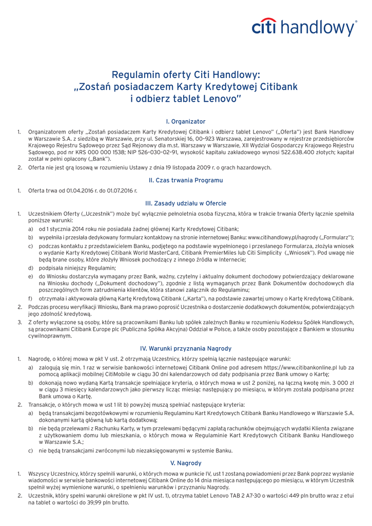 Regulamin oferty Citi Handlowy: „Zostań posiadaczem Karty Kredytowej Citibank i odbierz tablet Lenovo” I. Organizator 1. Organizatorem oferty „Zostań posiadaczem Karty Kredytowej Citibank i odbierz tablet Lenovo” („Oferta”) jest Bank Handlowy w Warszawie S.A. z siedzibą w Warszawie, przy ul. Senatorskiej 16, 00–923 Warszawa, zarejestrowany w rejestrze przedsiębiorców Krajowego Rejestru Sądowego przez Sąd Rejonowy dla m.st. Warszawy w Warszawie, XII Wydział Gospodarczy Krajowego Rejestru Sądowego, pod nr KRS 000 000 1538; NIP 526–030–02–91, wysokość kapitału zakładowego wynosi 522.638.400 złotych; kapitał został w pełni opłacony („Bank”). 2. Oferta nie jest grą losową w rozumieniu Ustawy z dnia 19 listopada 2009 r. o grach hazardowych. II. Czas trwania Programu 1. Oferta trwa od 01.04.2016 r. do 01.07.2016 r. III. Zasady udziału w Ofercie 1. Uczestnikiem Oferty („Uczestnik”) może być wyłącznie pełnoletnia osoba fizyczna, która w trakcie trwania Oferty łącznie spełniła poniższe warunki: a) od 1 stycznia 2014 roku nie posiadała żadnej głównej Karty Kredytowej Citibank; b) wypełniła i przesłała dedykowany formularz kontaktowy na stronie internetowej Banku: www.citihandlowy.pl/nagrody („Formularz”); c) podczas kontaktu z przedstawicielem Banku, podjętego na podstawie wypełnionego i przesłanego Formularza, złożyła wniosek o wydanie Karty Kredytowej Citibank World MasterCard, Citibank PremierMiles lub Citi Simplicity („Wniosek”). Pod uwagę nie będą brane osoby, które złożyły Wniosek pochodzący z innego źródła w Internecie; d) podpisała niniejszy Regulamin; e) do Wniosku dostarczyła wymagany przez Bank, ważny, czytelny i aktualny dokument dochodowy potwierdzający deklarowane na Wniosku dochody („Dokument dochodowy”), zgodnie z listą wymaganych przez Bank Dokumentów dochodowych dla poszczególnych form zatrudnienia klientów, która stanowi załącznik do Regulaminu; f) otrzymała i aktywowała główną Kartę Kredytową Citibank („Karta”), na podstawie zawartej umowy o Kartę Kredytową Citibank. 2. Podczas procesu weryfikacji Wniosku, Bank ma prawo poprosić Uczestnika o dostarczenie dodatkowych dokumentów, potwierdzających jego zdolność kredytową. 3. Z oferty wyłączone są osoby, które są pracownikami Banku lub spółek zależnych Banku w rozumieniu Kodeksu Spółek Handlowych, są pracownikami Citibank Europe plc (Publiczna Spółka Akcyjna) Oddział w Polsce, a także osoby pozostające z Bankiem w stosunku cywilnoprawnym. IV. Warunki przyznania Nagrody 1. Nagrodę, o której mowa w pkt V ust. 2 otrzymają Uczestnicy, którzy spełnią łącznie następujące warunki: a) zalogują się min. 1 raz w serwisie bankowości internetowej Citibank Online pod adresem https://www.citibankonline.pl lub za pomocą aplikacji mobilnej CitiMobile w ciągu 30 dni kalendarzowych od daty podpisania przez Bank umowy o Kartę; b) dokonają nowo wydaną Kartą transakcje spełniające kryteria, o których mowa w ust 2 poniżej, na łączną kwotę min. 3 000 zł w ciągu 3 miesięcy kalendarzowych jako pierwszy licząc miesiąc następujący po miesiącu, w którym została podpisana przez Bank umowa o Kartę. 2. Transakcje, o których mowa w ust 1 lit b) powyżej muszą spełniać następujące kryteria: a) będą transakcjami bezgotówkowymi w rozumieniu Regulaminu Kart Kredytowych Citibank Banku Handlowego w Warszawie S.A. dokonanymi kartą główną lub kartą dodatkową; b) nie będą przelewami z Rachunku Karty, w tym przelewami będącymi zapłatą rachunków obejmujących wydatki Klienta związane z użytkowaniem domu lub mieszkania, o których mowa w Regulaminie Kart Kredytowych Citibank Banku Handlowego w Warszawie S.A.; c) nie będą transakcjami zwróconymi lub niezaksięgowanymi w systemie Banku. V. Nagrody 1. Wszyscy Uczestnicy, którzy spełnili warunki, o których mowa w punkcie IV, ust 1 zostaną powiadomieni przez Bank poprzez wysłanie wiadomości w serwisie bankowości internetowej Citibank Online do 14 dnia miesiąca następującego po miesiącu, w którym Uczestnik spełnił wyżej wymienione warunki, o spełnieniu warunków i przyznaniu Nagrody. 2. Uczestnik, który spełni warunki określone w pkt IV ust. 1), otrzyma tablet Lenovo TAB 2 A7-30 o wartości 449 pln brutto wraz z etui na tablet o wartości do 39,99 pln brutto. 3. Każdy Uczestnik może otrzymać maksymalnie jedną Nagrodę (Tablet oraz etui). 4. Nagrody będą przekazywane wyłącznie w sposób określony w punkcie VI Regulaminu, bez możliwości wypłaty ich równowartości w gotówce lub zamiany na inną nagrodę rzeczową. Także w przypadku rezygnacji z odbioru Nagrody Uczestnik nie otrzyma równowartości tej nagrody w formie pieniężnej. 5. Uczestnik nie ma możliwości wyboru wersji kolorystycznej Nagrody. VI. Przekazanie Nagród 1. Nagroda zostanie wysłana za pośrednictwem kuriera na adres korespondencyjny Uczestnika, podany na wniosku o Kartę, w przeciągu 30 dni od daty wysłania przez Bank wiadomości informującej o przyznaniu Nagrody. VII. Gwarancja 1. Nagroda objęta jest 24 miesięczną gwarancją producenta, realizowaną na podstawie numeru seryjnego. Wszystkie pytania dotyczące warunków gwarancji producenta powinny być kierowane do firmy Lenovo Technology B.V Sp. z o.o. oddział w Polsce poprzez infolinię telefoniczną +48–22–295–4950 lub +48–22–116–8656, stronę http://shop.lenovo.com/pl/pl/contact/ lub poprzez wysłanie wiadomości e–mail na adres [email protected] VIII. Podatek 1. Nagrody w ramach Oferty są wolne od podatku dochodowego od osób fizycznych na podstawie art. 21 ust. 1 pkt 68 ustawy z dnia 26 lipca 1991 r. o podatku dochodowym od osób fizycznych. IX. Reklamacje 1. Bank przyjmuje skargi i reklamacje od Klientów w formie: a) pisemnej – złożonej osobiście w Oddziale Banku w godzinach pracy Oddziału, albo przesłanej na adres: Citi Handlowy, Departam