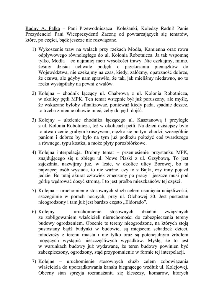 Radny A. Pałka – Pani Przewodnicząca! Koleżanki, Koledzy Radni! Panie Prezydencie! Pani Wiceprezydent! Zacznę od powtarzających się tematów, które, po części, bądź jeszcze nie rozwiązane. 1) Wykoszenie traw na wałach przy rzekach Modła, Kamienna oraz rowu odpływowego równoległego do ul. Kolonia Robotnicza. Ja tak wspomnę tylko, Modła – co najmniej metr wysokości trawy. Nie czekajmy, mimo, żeśmy dzisiaj uchwałę podjęli o przekazaniu pieniążków do Województwa, nie czekajmy na czas, kiedy, załóżmy, opatrzność dobrze, że czuwa, ale gdyby nam sprawiło, że tak, jak mieliśmy niedawno, no to rzeka wystąpiłaby na pewni z wałów. 2) Kolejna – chodnik łączący ul. Chabrową z ul. Kolonia Robotnicza, w okolicy pętli MPK. Ten temat wstępnie był już poruszony, ale myślę, że wskazane byłoby sfinalizować, ponieważ kiedy pada, spadnie deszcz, to trzeba zmienne obuwie mieć, żeby do pętli dojść. 3) Kolejny – ułożenie chodnika łączącego ul. Kasztanową i przyległe z ul. Kolonia Robotnicza, też w okolicach pętli. Na dzień dzisiejszy było to utwardzenie grubym kruszywem, ciężko się po tym chodzi, szczególnie paniom i dobrze by było na tym już podłożu położyć coś twardszego a równego, typu kostka, a może płyty porozbiórkowe. 4) Kolejna interpelacja. Drobny temat – przeniesienie przystanku MPK, znajdującego się u zbiegu ul. Nowe Piaski z ul. Grzybową. To jest zajezdnia, nazwijmy już, w lesie, w okolice ulicy Borowej, bo tu najwięcej osób wysiada, to nie ważne, czy to z Bajki, czy inny pojazd jedzie. Bo tutaj akurat człowiek zmęczony po pracy i jeszcze musi pod górkę wędrować dosyć stromą. I to jest prośba mieszkańców tej części. 5) Kolejna – uruchomienie stosownych służb celem usunięcia uciążliwości, szczególnie w porach nocnych, przy ul. Olchowej 20. Jest pustostan nieogrodzony i tam już jest bardzo często „Eldorado”. 6) Kolejny – uruchomienie stosownych działań związanych ze zobligowaniem właścicieli nieruchomości do zabezpieczenia tereny budowy ogrodzeniem. Obecnie te tereny nieogrodzone, na których stoją pustostany bądź budynki w budowie, są miejscem schadzek dzieci, młodzieży z terenu miasta i nie tylko oraz są potencjalnym źródłem mogących wystąpić nieszczęśliwych wypadków. Myślę, że to jest w warunkach budowy już wydawane, że teren budowy powinien być zabezpieczony, ogrodzony, stąd przypomnienie w formie tej interpelacji. 7) Kolejne – uruchomienie stosownych służb celem zobowiązania właściciela do uporządkowania kanału biegnącego wzdłuż ul. Kolejowej. Obecny stan sprzyja rozmnażaniu się kleszczy, komarów, których ukąszenie doprowadza do ciężkich powikłań. Myślę, że dzisiaj już wiele słyszymy w mediach, że komary tez są nosicielami wielu chorób i o czym też warto tutaj wspomnieć. Kanał, kiedy huta pracowała, Stary Zakład, był niezbędny. Dzisiaj jest – jak to się mówi – ja nie powiem, że bezpański, bo ktoś czuwa nad tym, tylko, że winien dołożyć stosownych starań, aby mieszkańcy tej części naszego miasta, a dokładnie tej ulicy, spokojnie mogli mieszkać. 8) Ulica Kolonia Robotnicza ma dwie odnogi – jedna w pobliżu ul. Sienkiewicza, a druga w pobliżu Ronda Narodowych Sił Zbrojnych. Jest gorąca prośba mieszkańców, by te ulicy potraktować jako ulice dojazdowe o pasie szerokości trzymetrowym. Byłoby to już rozwiązanie naprawdę wystarczające, a myślę, że jazda po szlace, kiedy jest sucho, wiemy jak mieszkania wyglądają i jazda po szlace, kiedy jest mokro, wiemy, jakie błoto i stąd ta gorąca prośba. 9) Kolejna – rozpoczęcie działań związanych z powstaniem długo oczekiwanej świetlicy na Kolonii Robotniczej. Wiadomym jest, że jest uporządkowany stan prawny, pozwalający na działanie w tym zakresie. Dla porównania – jeżeli da się odgrzybić, osuszyć budynki Browaru, to może da się i zrobić to na istniejącej starej świetlicy, Panie Prezydencie. Myślę, że może coś się da tu zrobić, a nowości budowlane są wielkie. 10) Kolejne – uruchomienie stosownych służb celem utwardzenia odcinka ul. Bieliny destruktem pozyskanym z remontu – przebudowy ul. 3-go Maja. Myślę, że już te 100 metrów, jakie było wykonane z naszej strony, jest już pewnym krokiem ważnym, ale kolejne naprawdę ułatwiłoby żywot tej części, chcę powiedzieć ulicy, przez którą przechodzą 3 gminy. Ja tylko mówię o naszej – Ostrowiec, żeby tylko z naszej strony było to do wykonania. Rok ubiegły – dziękowałem już za wspólne działanie Gminy Kunów i naszej, naszych służb, a więc to jest istotna sprawa. 11) I kolejne – zwiększenie częstotliwości koszenia traw na placach zabaw oraz codzienne opróżnianie koszy na śmieci. Powyższe powinno dotyczyć również terenów wypoczynkowych. Częste koszenie – tak, jak mamy – pozostałej zieleni – nie jest wystarczające dla placów zabaw, bo co tydzień coś się tu zbiera i młodzież, dzieci chcą się bawić.