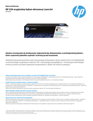 Dane techniczne HP 32A oryginalny bęben obrazowy LaserJet (CF232A) Idealne rozwiązanie do drukowania większej liczby dokumentów w profesjonalnej jakości , które zapewnia jednolite wydruki i ochronę przed oszustami. 1 Wyeliminuj kosztowną konieczność ponownego drukowania i drukuj więcej stron niż kiedykolwiek wcześniej dzięki oryginalnym bębnom HP z technologią JetIntelligence . Innowacyjna technologia ochrony przed oszustami zapewnia niezawodność i jakość HP, której oczekujesz. 1 Więcej wydrukowanych stron i większa wartość niż kiedykolwiek wcześniej 1 Pewność, że dostajesz więcej. Oryginalne bębny HP z technologią JetIntelligence zapewniają więcej stron niż kiedykolwiek dotąd1. Łatwe śledzenie pozostałej liczby stron gwarantuje, że otrzymasz wartość, za którą zapłaciłeś2. Wykorzystaj swoją inwestycję – technologia maximiser zapewnia większą liczbę stron niż kiedykolwiek dotąd1. Szybki druk bez kompromisów w zakresie jakości Drukuj z szybkością i jakością, z myślą o której urządzenia HP LaserJet Pro zostały zaprojektowane. Oryginalne bębny z technologią JetIntelligence są opracowane z myślą o bezproblemowej współpracy z drukarkami lub urządzeniami wielofunkcyjnymi HP. Uzyskaj stałą, profesjonalną jakość i wyeliminuj konieczność ponownego drukowania. Możesz być pewien stałej jakości wydruków dzięki oryginalnym bębnom HP z technologią JetIntelligence. Bądź spokojny dzięki ochronie przed oszustami Chroń swoją firmę przed podrabianymi wkładami dzięki innowacyjnej technologii zapewniającej ochronę przed oszustami. Zarządzaj kosztami dzięki nowatorskiej technologii, która pozwala na utrzymanie wysokiej jakości standardów dla drukarek HP LaserJet Pro i urządzeń wielofunkcyjnych. Nie daj się zwieść alternatywom, które naśladują oryginalne materiały HP. Zagwarantuj sobie jakość, za którą zapłaciłeś. Opracowany, by zapewnić niezawodność Wydrukuj więcej stron, korzystając z drukarki HP LaserJet Pro lub urządzenia wielofunkcyjnego1. Możesz liczyć na spójną, wyjątkową jakość i wydajność przy użyciu oryginalnych bębnów z technologią JetIntelligence – zaprojektowanych z myślą o ochronie inwestycji i pomocy drukarce w osiągnięciu najwyższej wydajności. Możesz być pewien stałej jakości dzięki bębnom dostosowanym do szybkości Twojej drukarki lub urządzenia wielofunkcyjnego HP. Zgodnie z normą ISO/IEC 19752 wydajność kasety: dla oryginalnych wkładów z czarnym tonerem HP 30A LaserJet oraz oryginalnych bębnów LaserJet HP 32A w porównaniu z oryginalnymi wkładami z czarnym tonerem HP 83A LaserJet, a także dla oryginalnych, wysokowydajnych wkładów z czarnym tonerem HP 30X LaserJet w porównaniu z oryginalnymi, wysokowydajnymi wkładami z czarnym tonerem HP 83X LaserJet. Więcej informacji jest dostępnych na stronie hp.com/go/learnaboutsupplies. 2 W porównaniu ze wskaźnikami poziomu we wkładach do starszych produktów HP. 1 Dane techniczne | HP 32A oryginalny bęben obrazowy LaserJet Informacje o zgodności Drukarki HP LaserJet Pro M203; Urządzenie wielofunkcyjne HP LaserJet Pro M227; Drukarki HP LaserJet Ultra M206; Urządzenie wielofunkcyjne HP LaserJet Ultra M230 Dane techniczne produktu P/N Opis Średnia wydajność kasety z tonerem * Wymiary (dł x szer x gł) Waga Kod UPC CF232A HP 32A oryginalny bęben obrazowy LaserJet 23,000 stron 365 × 97 × 102 mm 0,42 kg 889894797483 *Przybliżona średnia wydajność wg normy ISO/IEC 19752. Rzeczywista wydajność może się znacznie różnić w zależności od zawartości drukowanych stron i innych czynników. Szczegółowe informacje są dostępne pod adresem http://www.hp.com/go/learnaboutsupplies. Gwarancja Gwarancja HP Premium Protection. HP gwarantuje, że ten produkt jest wolny od wad materiałowych i produkcyjnych. Aby uzyskać więcej informacji na temat materiałów konsumpcyjnych HP, odwiedź http://www.hp.com Produkt może odbiegać wyglądem od widocznego na ilustracjach. © Copyright 2016 HP Development Company, L.P. Informacje zawarte w niniejszym dokumencie mogą ulec zmianie bez powiadomienia. Jedyne gwarancje, jakich firma HP udziela na produkty i usługi, są określone w oświadczeniach gwarancyjnych dostarczanych wraz z tymi produktami i usługami. Żadne informacje przedstawione w niniejszym dokumencie nie powinny być interpretowane jako dodatkowa gwarancja. Firma HP nie ponosi odpowiedzialności za błędy techniczne lub redakcyjne oraz braki występujące w niniejszym dokumencie. 4AA6-6783PLE, Sierpień 2016