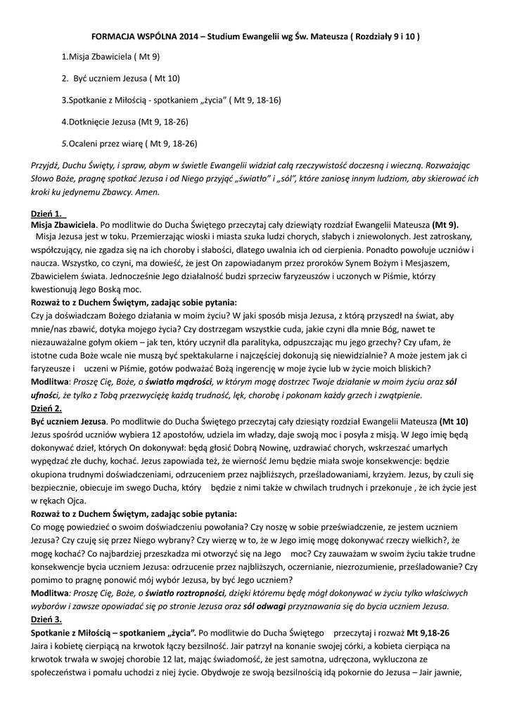 FORMACJA WSPÓLNA 2014 – Studium Ewangelii wg Św. Mateusza ( Rozdziały 9 i 10 ) 1.Misja Zbawiciela ( Mt 9) 2. Być uczniem Jezusa ( Mt 10) 3.Spotkanie z Miłością - spotkaniem „życia” ( Mt 9, 18-16) 4.Dotknięcie Jezusa (Mt 9, 18-26) 5.Ocaleni przez wiarę ( Mt 9, 18-26) Przyjdź, Duchu Święty, i spraw, abym w świetle Ewangelii widział całą rzeczywistość doczesną i wieczną. Rozważając Słowo Boże, pragnę spotkać Jezusa i od Niego przyjąć „światło” i „sól”, które zaniosę innym ludziom, aby skierować ich kroki ku jedynemu Zbawcy. Amen. Dzień 1. Misja Zbawiciela. Po modlitwie do Ducha Świętego przeczytaj cały dziewiąty rozdział Ewangelii Mateusza (Mt 9). Misja Jezusa jest w toku. Przemierzając wioski i miasta szuka ludzi chorych, słabych i zniewolonych. Jest zatroskany, współczujący, nie zgadza się na ich choroby i słabości, dlatego uwalnia ich od cierpienia. Ponadto powołuje uczniów i naucza. Wszystko, co czyni, ma dowieść, że jest On zapowiadanym przez proroków Synem Bożym i Mesjaszem, Zbawicielem świata. Jednocześnie Jego działalność budzi sprzeciw faryzeuszów i uczonych w Piśmie, którzy kwestionują Jego Boską moc. Rozważ to z Duchem Świętym, zadając sobie pytania: Czy ja doświadczam Bożego działania w moim życiu? W jaki sposób misja Jezusa, z którą przyszedł na świat, aby mnie/nas zbawić, dotyka mojego życia? Czy dostrzegam wszystkie cuda, jakie czyni dla mnie Bóg, nawet te niezauważalne gołym okiem – jak ten, który uczynił dla paralityka, odpuszczając mu jego grzechy? Czy ufam, że istotne cuda Boże wcale nie muszą być spektakularne i najczęściej dokonują się niewidzialnie? A może jestem jak ci faryzeusze i uczeni w Piśmie, gotów podważać Bożą ingerencję w moje życie lub w życie moich bliskich? Modlitwa: Proszę Cię, Boże, o światło mądrości, w którym mogę dostrzec Twoje działanie w moim życiu oraz sól ufności, że tylko z Tobą przezwyciężę każdą trudność, lęk, chorobę i pokonam każdy grzech i zwątpienie. Dzień 2. Być uczniem Jezusa. Po modlitwie do Ducha Świętego przeczytaj cały dziesiąty rozdział Ewangelii Mateusza (Mt 10) Jezus spośród uczniów wybiera 12 apostołów, udziela im władzy, daje swoją moc i posyła z misją. W Jego imię będą dokonywać dzieł, których On dokonywał: będą głosić Dobrą Nowinę, uzdrawiać chorych, wskrzeszać umarłych wypędzać złe duchy, kochać. Jezus zapowiada też, że wierność Jemu będzie miała swoje konsekwencje: będzie okupiona trudnymi doświadczeniami, odrzuceniem przez najbliższych, prześladowaniami, krzyżem. Jezus, by czuli się bezpiecznie, obiecuje im swego Ducha, który będzie z nimi także w chwilach trudnych i przekonuje , że ich życie jest w rękach Ojca. Rozważ to z Duchem Świętym, zadając sobie pytania: Co mogę powiedzieć o swoim doświadczeniu powołania? Czy noszę w sobie przeświadczenie, ze jestem uczniem Jezusa? Czy czuję się przez Niego wybrany? Czy wierzę w to, że w Jego imię mogę dokonywać rzeczy wielkich?, że mogę kochać? Co najbardziej przeszkadza mi otworzyć się na Jego moc? Czy zauważam w swoim życiu także trudne konsekwencje bycia uczniem Jezusa: odrzucenie przez najbliższych, oczernianie, niezrozumienie, prześladowanie? Czy pomimo to pragnę ponowić mój wybór Jezusa, by być Jego uczniem? Modlitwa: Proszę Cię, Boże, o światło roztropności, dzięki któremu będę mógł dokonywać w życiu tylko właściwych wyborów i zawsze opowiadać się po stronie Jezusa oraz sól odwagi przyznawania się do bycia uczniem Jezusa. Dzień 3. Spotkanie z Miłością – spotkaniem „życia”. Po modlitwie do Ducha Świętego przeczytaj i rozważ Mt 9,18-26 Jaira i kobietę cierpiącą na krwotok łączy bezsilność. Jair patrzył na konanie swojej córki, a kobieta cierpiąca na krwotok trwała w swojej chorobie 12 lat, mając świadomość, że jest samotna, udręczona, wykluczona ze społeczeństwa i pomału uchodzi z niej życie. Obydwoje ze swoją bezsilnością idą pokornie do Jezusa – Jair jawnie, kobieta ukradkiem – bo mają nadzieję, że tylko On może im pomóc. I nie zawodzą się. Spotkanie z Miłością staje się najważniejszym spotkaniem ich życia. Taki jest nasz Bóg! Dla tej Miłości nie ma znaczenia, kim byli Jair i kobieta, nie ma znaczenia, że on był zwierzchnikiem synagogi, a więc przyjacielem faryzeuszów i uczonych w Piśmie, którzy nie akceptowali Jezusa; a ona, cierpiąc na krwotok, była rytualnie nieczysta i nie miała prawa do nikogo się zbliżać. Dla Jezusa każdy człowiek jest tak samo ważny – jest jedyny, wyjątkowy, dlatego dla Jaira Jezus zostawia słuchające Go tłumy i idzie wskrzesić jego córeczkę, a kobiety nieczystej nie tylko nie potępia, ale spogląda na nią z miłością, nazywając ją „ córką”, chociaż z pewnością nikt do tej pory tak do niej nie mówił. Rozważ to z Duchem Świętym, zadając sobie pytania: Czy pragnę spotykać się z Jezusem na modlitwie? Jak często spotykam się z Nim w Najświętszym Sakramencie? Z czym idę najczęściej na adorację? Czy pamiętam takie spotkanie z Jezusem, które było dla mnie najważniejszym spotkaniem, spotkaniem „życia”? Czy wierzę, że On, może bardziej niż ja, czeka na spotkanie ze mną? Czy wierzę, że dla Niego nie ma znaczenia, kim jestem, ile mam lat, jaka jest moja przeszłość? Czy pamiętam takie sytuacje, po ludzku beznadziejne, w których czułem całkowitą bezsilność? Czy szedłem pokornie do Niego, pokładając w Nim nadzieję i ufając, że tylko On może zaradzić mojej bezsilności? Co mogę powiedzieć o swojej ufności do Jezusa w takich momentach? Modlitwa: Proszę Cię, Boże, o światło nadziei pokładanej jedynie w Tobie oraz sól pokory, bym wyzbył się przekonania, że mogę sobie poradzić sam. Dzień 4. Dotknięcie Jezusa. Po modlitwie do Ducha Świętego przeczytaj i rozw