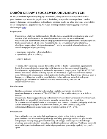 DOBÓR OPRAW I SOCZEWEK OKULAROWYCH W naszych sklepach posiadamy bogatą i różnorodną ofertę opraw okularowych i okularów przeciwsłonecznych w atrakcyjnych cenach. Posiadamy w sprzedaży awangardowe i modne oprawy, doskonale korespondujące z aktualnymi trendami mody, ale także klasyczne wzory, które od lat cieszą się dużą popularnością. W swojej ofercie posiadamy szeroką gamę soczewek okularowych m.in.: Progresywne Potrzebne są właściwie każdemu około 40 roku życia, nawet jeśli wcześniej nie miał wady wzroku, gdyż wtedy pojawia się naturalny proces starzenia się soczewki ocznej. Objawia się on trudnościami podczas długiego obserwowania przedmiotów znajdujących się blisko i odsuwaniem ich od oczu. Konieczne staje się wówczas używanie okularów, określanych często jako "okulary do czytania" i wtedy szczególnie dla osób aktywnych zawodowo pojawiają się problemy: - nieustannie zakładają i zdejmują okulary, - zapominają, gdzie je położyły, - a nawet gubią je. Te osoby, które już noszą okulary do korekty krótko- i daleko- wzroczności są zmuszone kupić drugą parę okularów, sprawiając sobie tym samym dwa razy więcej kłopotów. Rozwiązaniem wyżej opisanych problemów są soczewki progresywne. SĄ PRAKTYCZNE... Dzięki nim można patrzeć na każdy dystans nie zmieniając ciągle okularów i nie męcząc oczu. Górna część przeznaczona jest do patrzenia daleko, dolna do patrzenia blisko, a łączy je korytarz, czyli łagodne przejście umożliwiające dobre widzenie na średnią odległość. Wyglądają jak normalne soczewki okularowe, bowiem zmiany mocy są na soczewceniewidoczne. Fotochromowe Każdy poszukujący komfortu widzenia, bez względu na warunki oświetlenia, powinienskorzystać z soczewek TRANSITIONS VI. Soczewki te dostępne są w kolorze szarym i brązowym. Zapewniają doskonałą widoczność we wszystkich warunkach oświetleniowych. Najszybciej ze wszystkich fotochromów na rynku zaciemniają się i rozjaśniają. W pomieszczeniach są doskonale przezroczyste, a na zewnątrz ciemnieją, osiągając właściwe zabarwienie dla panujących warunków oświetlenia, w 100% chroniąc oczy przed oślepiającym blaskiem na zewnątrz oraz promieniowaniem UVA i UVB. Polaryzacyjne Soczewki polaryzacyjne mają dwie podstawowe zalety: pełnią funkcję okularów przeciwsłonecznych i neutralizują oślepiające refleksy, powstające wówczas gdy światło odbija się od mokrej drogi, powierzchni wody lub śniegu. Eliminacja światła odbitego zwiększa kontrast widzenia i pozwala na bardziej komfortowe widzenie. To idealne soczewki do wszelkiego rodzaju aktywności na świeżym powietrzu, pozwalające pełniej korzystać z życia. Zalety: - eliminują oślepiające odblaski, zmniejszają zmęczenie oczu, - całkowicie chronią przed szkodliwym promieniowaniem UV, - zwiększają kontrast widzenia, - idealne rozwiązanie dla osób wrażliwych na światło, - idealne do uprawiania sportów wodnych, łowienia ryb, jazdy samochodem, jazdy na nartach. Indeksowe SOCZEWKI INDEKSOWE – CIENKIE Osobom z dużymi wadami wzroku proponujemy soczewki o wysokich współczynnikach załamania światła w wersji soczewek organicznych (plastikowych) indeksy: 1,76//1,74//1,7//1,67//1,60 lub 1,56 oraz mineralnych 1,9//1,8//1,7//1,6. Pocienienie soczewek sprawi, iż będą one lekkie i estetyczne. Decydując się dodatkowo na konstrukcję asferyczną soczewki, uzyskamy efekt pomniejszenia oczu przy mocy plusowej lub powiększenia przy mocy minusowej oraz redukcji brzegowych zniekształceń obrazu. DOBÓR SOCZEWEK KONTAKTOWYCH W ramach badania kontaktologicznego oferujemy soczewki próbne wraz z nauką samodzielnej aplikacji. W salonie można nabyć soczewki kontaktowe różnych firm oraz środki do ich pielęgnacji.