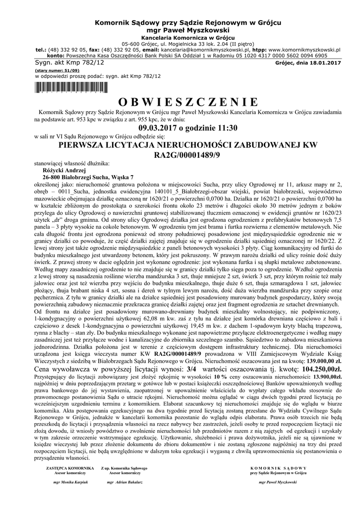 Komornik Sądowy przy Sądzie Rejonowym w Grójcu mgr Paweł Myszkowski Kancelaria Komornicza w Grójcu 05-600 Grójec, ul. Mogielnicka 33 lok. 2.04 (II piętro) tel.: (48) 332 92 05, fax: (48) 332 92 05, email: [email protected], htpp: www.komornikmyszkowski.pl konto: Powszechna Kasa Oszczędności Bank Polski SA Oddział 1 w Radomiu 05 1020 4317 0000 5602 0094 6905 Sygn. akt Kmp 782/12 Grójec, dnia 18.01.2017 (stary numer: 51/09) w odpowiedzi proszę podać: sygn. akt Kmp 782/12 *8017011800764* OBWIESZCZENIE Komornik Sądowy przy Sądzie Rejonowym w Grójcu mgr Paweł Myszkowski Kancelaria Komornicza w Grójcu zawiadamia na podstawie art. 953 kpc w związku z art. 955 kpc, że w dniu: 09.03.2017 o godzinie 11:30 w sali nr VI Sądu Rejonowego w Grójcu odbędzie się: PIERWSZA LICYTACJA NIERUCHOMOŚCI ZABUDOWANEJ KW RA2G/00001489/9 stanowiącej własność dłużnika: Różycki Andrzej 26-800 Białobrzegi Sucha, Wąska 7 określonej jako: nieruchomość gruntowa położona w miejscowości Sucha, przy ulicy Ogrodowej nr 11, arkusz mapy nr 2, obręb – 0011_Sucha, jednostka ewidencyjna 140101_5_Białobrzegi-obszar wiejski, powiat białobrzeski, województwo mazowieckie obejmująca działkę oznaczoną nr 1620/21 o powierzchni 0,0700 ha. Działka nr 1620/21 o powierzchni 0,0700 ha w kształcie zbliżonym do prostokąta o szerokości frontu około 23 metrów i długości około 30 metrów jednym z boków przylega do ulicy Ogrodowej o nawierzchni gruntowej stabilizowanej tłuczniem oznaczonej w ewidencji gruntów nr 1620/23 użytek „dr” droga gminna. Od strony ulicy Ogrodowej działka jest ogrodzona ogrodzeniem z prefabrykatów betonowych 7,5 panela – 3 płyty wysokie na cokole betonowym. W ogrodzeniu tym jest brama i furtka rozwierna z elementów metalowych. Nie cała długość frontu jest ogrodzona ponieważ od strony południowej posadowione jest międzysąsiedzkie ogrodzenie nie w granicy działki co powoduje, że część działki zajętej znajduje się w ogrodzeniu działki sąsiedniej oznaczonej nr 1620/22. Z lewej strony jest także ogrodzenie międzysąsiedzkie z paneli betonowych wysokości 3 płyty. Ciąg komunikacyjny od furtki do budynku mieszkalnego jest utwardzony betonem, który jest pokruszony. W prawym narożu działki od ulicy rośnie dość duży świerk. Z prawej strony w dacie oględzin jest wykonane ogrodzenie: jest wykonana furtka i są słupki metalowe zabetonowane. Według mapy zasadniczej ogrodzenie to nie znajduje się w granicy działki tylko sięga poza to ogrodzenie. Wzdłuż ogrodzenia z lewej strony są nasadzenia roślinne wierzba mandżurska 3 szt, thuje mniejsze 2 szt, świerk 3 szt, przy którym rośnie też mały jałowiec oraz jest też wierzba przy wejściu do budynku mieszkalnego, thuje duże 6 szt, thuja szmaragdowa 1 szt, jałowiec płożący, thuja brabant niska 4 szt, sosna i dereń w tylnym lewym narożu, dość duża wierzba mandżurska przy szopie oraz pęcherznica. Z tyłu w granicy działki ale na działce sąsiedniej jest posadowiony murowany budynek gospodarczy, który swoją powierzchnią zabudowy nieznacznie przekracza granicę działki zajętej oraz jest fragment ogrodzenia ze sztachet drewnianych. Od frontu na działce jest posadowiony murowano-drewniany budynek mieszkalny wolnostojący, nie podpiwniczony, 1-kondygnacyjny o powierzchni użytkowej 62,08 m kw. zaś z tyłu na działce jest komórka drewniana częściowo z bali i częściowo z desek 1-kondygnacyjna o powierzchni użytkowej 19,45 m kw. z dachem 1-spadowym kryty blachą trapezową, rynna z blachy – stan zły. Do budynku mieszkalnego wykonane jest napowietrzne przyłącze elektroenergetyczne i według mapy zasadniczej jest też przyłącze wodne i kanalizacyjne do zbiornika szczelnego szambo. Sąsiedztwo to zabudowa mieszkaniowa jednorodzinna. Działka położona jest w terenie z częściowym dostępem infrastruktury technicznej. Dla nieruchomości urządzona jest księga wieczysta numer KW RA2G/00001489/9 prowadzona w VIII Zamiejscowym Wydziale Ksiąg Wieczystych z siedzibą w Białobrzegach Sądu Rejonowego w Grójcu. Nieruchomość oszacowana jest na kwotę: 139.000,00 zł. Cena wywoławcza w powyższej licytacji wynosi: 3/4 wartości oszacowania tj. kwotę: 104.250,00zł. Przystępujący do licytacji zobowiązany jest złożyć rękojmię w wysokości 10 % ceny oszacowania nieruchomości: 13.900,00zł. najpóźniej w dniu poprzedzającym przetarg w gotówce lub w postaci książeczki oszczędnościowej Banków upoważnionych według prawa bankowego do jej wystawienia, zaopatrzonej w upoważnienie właściciela do wypłaty całego wkładu stosownie do prawomocnego postanowienia Sądu o utracie rękojmi. Nieruchomość można oglądać w ciągu dwóch tygodni przed licytacją po wcześniejszym uzgodnieniu terminu z komornikiem. Elaborat szacunkowy tej nieruchomości znajduje się do wglądu w biurze komornika. Akta postępowania egzekucyjnego na dwa tygodnie przed licytacją zostaną przesłane do Wydziału Cywilnego Sądu Rejonowego w Grójcu, jednakże w kancelarii komornika pozostanie do wglądu odpis elaboratu. Prawa osób trzecich nie będą przeszkodą do licytacji i przysądzenia własności na rzecz nabywcy bez zastrzeżeń, jeżeli osoby te przed rozpoczęciem licytacji nie złożą dowodu, iż wniosły powództwo o zwolnienie nieruchomości lub przedmiotów razem z nią zajętych od egzekucji i uzyskały w tym zakresie orzeczenie wstrzymujące egzekucję. Użytkowanie, służebności i prawa dożywotnika, jeżeli nie są ujawnione w księdze wieczystej lub przez złożenie dokumentu do zbioru dokumentów i nie zostaną zgłoszone najpóźniej na trzy dni przed rozpoczęciem licytacji, nie będą uwzględnione w dalszym toku egzekucji i wygasną z chwilą uprawomocnienia się postanowienia o przysądzeniu własności. ZASTĘPCA KOMORNIKA Asesor komorniczy Z up. Komornika Sądowego Asesor komorniczy KOMORNIK SĄDOWY przy Sądzie Rejonowym w Grójcu mgr Mo