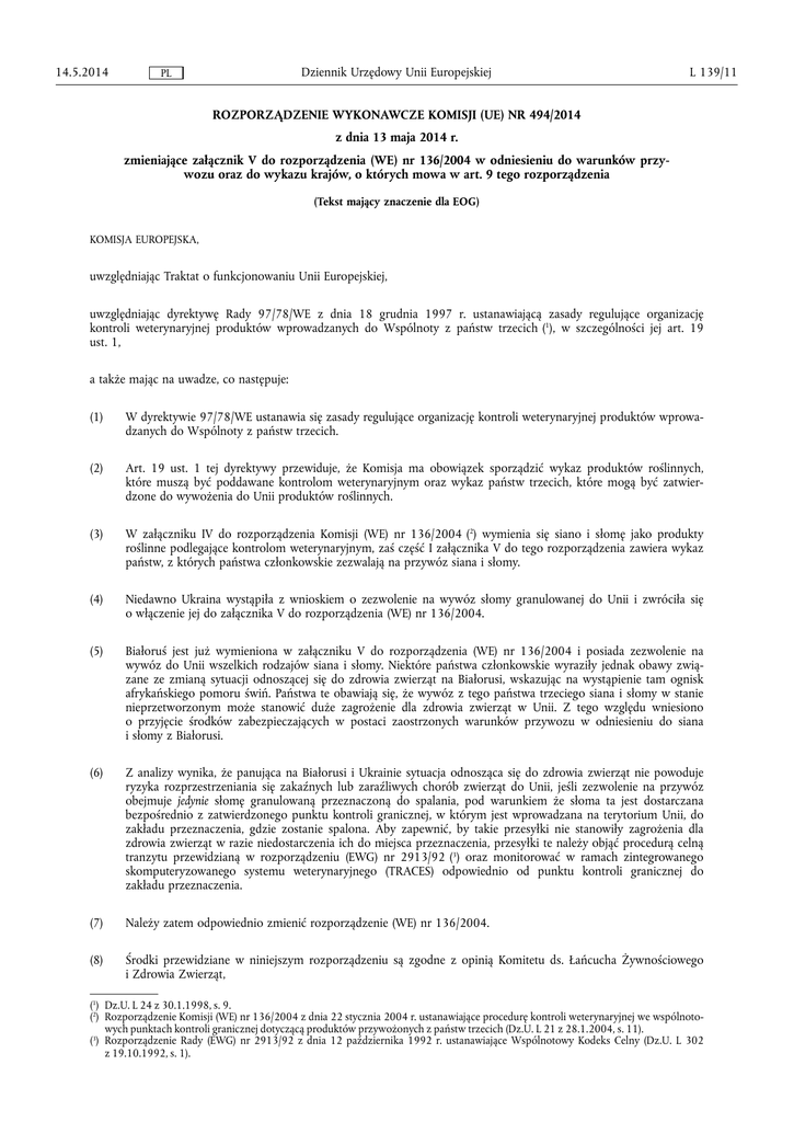 14.5.2014 Dziennik Urzędowy Unii Europejskiej PL L 139/11 ROZPORZĄDZENIE WYKONAWCZE KOMISJI (UE) NR 494/2014 z dnia 13 maja 2014 r. zmieniające załącznik V do rozporządzenia (WE) nr 136/2004 w odniesieniu do warunków przy wozu oraz do wykazu krajów, o których mowa w art. 9 tego rozporządzenia (Tekst mający znaczenie dla EOG) KOMISJA EUROPEJSKA, uwzględniając Traktat o funkcjonowaniu Unii Europejskiej, uwzględniając dyrektywę Rady 97/78/WE z dnia 18 grudnia 1997 r. ustanawiającą zasady regulujące organizację kontroli weterynaryjnej produktów wprowadzanych do Wspólnoty z państw trzecich (1), w szczególności jej art. 19 ust. 1, a także mając na uwadze, co następuje: (1) W dyrektywie 97/78/WE ustanawia się zasady regulujące organizację kontroli weterynaryjnej produktów wprowa dzanych do Wspólnoty z państw trzecich. (2) Art. 19 ust. 1 tej dyrektywy przewiduje, że Komisja ma obowiązek sporządzić wykaz produktów roślinnych, które muszą być poddawane kontrolom weterynaryjnym oraz wykaz państw trzecich, które mogą być zatwier dzone do wywożenia do Unii produktów roślinnych. (3) W załączniku IV do rozporządzenia Komisji (WE) nr 136/2004 (2) wymienia się siano i słomę jako produkty roślinne podlegające kontrolom weterynaryjnym, zaś część I załącznika V do tego rozporządzenia zawiera wykaz państw, z których państwa członkowskie zezwalają na przywóz siana i słomy. (4) Niedawno Ukraina wystąpiła z wnioskiem o zezwolenie na wywóz słomy granulowanej do Unii i zwróciła się o włączenie jej do załącznika V do rozporządzenia (WE) nr 136/2004. (5) Białoruś jest już wymieniona w załączniku V do rozporządzenia (WE) nr 136/2004 i posiada zezwolenie na wywóz do Unii wszelkich rodzajów siana i słomy. Niektóre państwa członkowskie wyraziły jednak obawy zwią zane ze zmianą sytuacji odnoszącej się do zdrowia zwierząt na Białorusi, wskazując na wystąpienie tam ognisk afrykańskiego pomoru świń. Państwa te obawiają się, że wywóz z tego państwa trzeciego siana i słomy w stanie nieprzetworzonym może stanowić duże zagrożenie dla zdrowia zwierząt w Unii. Z tego względu wniesiono o przyjęcie środków zabezpieczających w postaci zaostrzonych warunków przywozu w odniesieniu do siana i słomy z Białorusi. (6) Z analizy wynika, że panująca na Białorusi i Ukrainie sytuacja odnosząca się do zdrowia zwierząt nie powoduje ryzyka rozprzestrzeniania się zakaźnych lub zaraźliwych chorób zwierząt do Unii, jeśli zezwolenie na przywóz obejmuje jedynie słomę granulowaną przeznaczoną do spalania, pod warunkiem że słoma ta jest dostarczana bezpośrednio z zatwierdzonego punktu kontroli granicznej, w którym jest wprowadzana na terytorium Unii, do zakładu przeznaczenia, gdzie zostanie spalona. Aby zapewnić, by takie przesyłki nie stanowiły zagrożenia dla zdrowia zwierząt w razie niedostarczenia ich do miejsca przeznaczenia, przesyłki te należy objąć procedurą celną tranzytu przewidzianą w rozporządzeniu (EWG) nr 2913/92 (3) oraz monitorować w ramach zintegrowanego skomputeryzowanego systemu weterynaryjnego (TRACES) odpowiednio od punktu kontroli granicznej do zakładu przeznaczenia. (7) Należy zatem odpowiednio zmienić rozporządzenie (WE) nr 136/2004. (8) Środki przewidziane w niniejszym rozporządzeniu są zgodne z opinią Komitetu ds. Łańcucha Żywnościowego i Zdrowia Zwierząt, (1) Dz.U. L 24 z 30.1.1998, s. 9. (2) Rozporządzenie Komisji (WE) nr 136/2004 z dnia 22 stycznia 2004 r. ustanawiające procedurę kontroli weterynaryjnej we wspólnoto wych punktach kontroli granicznej dotyczącą produktów przywożonych z państw trzecich (Dz.U. L 21 z 28.1.2004, s. 11). (3) Rozporządzenie Rady (EWG) nr 2913/92 z dnia 12 października 1992 r. ustanawiające Wspólnotowy Kodeks Celny (Dz.U. L 302 z 19.10.1992, s. 1). L 139/12 PL Dziennik Urzędowy Unii Europejskiej 14.5.2014 PRZYJMUJE NINIEJSZE ROZPORZĄDZENIE: Artykuł 1 Załącznik V do rozporządzenia (WE) nr 136/2004 zastępuje się załącznikiem do niniejszego rozporządzenia. Artykuł 2 Niniejsze rozporządzenie wchodzi w życie dwudziestego dnia po jego opublikowaniu w Dzienniku Urzędowym Unii Europejskiej. Niniejsze rozporządzenie wiąże w całości i jest bezpośrednio stosowane we wszystkich państwach członkowskich. Sporządzono w Brukseli dnia 13 maja 2014 r. W imieniu Komisji José Manuel BARROSO Przewodniczący 14.5.2014 Dziennik Urzędowy Unii Europejskiej PL L 139/13 ZAŁĄCZNIK „ZAŁĄCZNIK V WYKAZ PAŃSTW, O KTÓRYCH MOWA W ART. 9 Kod ISO Państwo AU Australia BY Białoruś (1) CA Kanada CH Szwajcaria CL Chile GL Grenlandia IS Islandia NZ Nowa Zelandia RS Serbia (2) UA Ukraina (1) US Stany Zjednoczone Ameryki ZA Republika Południowej Afryki (wyłączając część obszaru zwalczania pryszczycy w regionie weteryna ryjnym Transwalu Północnego i Wschodniego, w dystrykcie Ingwavuma regionu weterynaryjnego Natal i obszarze graniczącym z Botswaną na wschód od 28° długości geograficznej) (1) Jedynie słoma granulowana przeznaczona do spalenia, która jest dostarczona bezpośrednio z zastosowaniem procedury celnej tran zytu przewidzianej w art. 4 ust. 16 lit. b) rozporządzenia (EWG) nr 2913/92 (Dz.U. L 302 z 19.10.1992, s. 1) i podlega monitoro waniu w ramach systemu TRACES od zatwierdzonego punktu kontroli granicznej, w którym jest wprowadzana na terytorium Unii, do zakładu przeznaczenia w Unii, gdzie zostanie spalona. (2) Zgodnie z art. 135 Układu o stabilizacji i stowarzyszeniu między Wspólnotami Europejskimi i ich państwami członkowskimi, z jednej strony, a Republiką Serbii, z drugiej strony (Dz.U. L 278 z 18.10.2013, s. 16).”