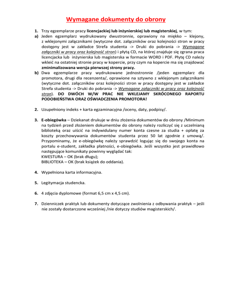 Wymagane dokumenty do obrony 1. Trzy egzemplarze pracy licencjackiej lub inżynierskiej lub magisterskiej, w tym: a) Jeden egzemplarz wydrukowany dwustronnie, oprawiony na miękko – klejony, z wklejonymi załącznikami (wytyczne dot. załączników oraz kolejności stron w pracy dostępny jest w zakładce Strefa studenta -> Druki do pobrania -> Wymagane załączniki w pracy oraz kolejność stron) i płytą CD, na której znajduje się zgrana praca licencjacka lub inżynierska lub magisterska w formacie WORD i PDF. Płytę CD należy wkleić na ostatniej stronie pracy w kopercie, przy czym na kopercie ma się znajdować zminimalizowana wersja pierwszej strony pracy. b) Dwa egzemplarze pracy wydrukowane jednostronnie /jeden egzemplarz dla promotora, drugi dla recenzenta/, oprawione na sztywno z wklejonym załącznikami (wytyczne dot. załączników oraz kolejności stron w pracy dostępny jest w zakładce Strefa studenta -> Druki do pobrania -> Wymagane załączniki w pracy oraz kolejność stron). DO DWÓCH W/W PRAC NIE WKLEJAMY SKRÓCONEGO RAPORTU PODOBIEŃSTWA ORAZ OŚWIADCZENIA PROMOTORA! 2. Uzupełniony indeks + karta egzaminacyjna /oceny, daty, podpisy/. 3. E-obiegówka – Dziekanat drukuje w dniu złożenia dokumentów do obrony /Minimum na tydzień przed złożeniem dokumentów do obrony należy rozliczyć się z uczelnianą biblioteką oraz uiścić na indywidulany numer konta czesne za studia + opłatę za koszty przechowywania dokumentów studenta przez 50 lat zgodnie z umową/. Przypominamy, że e-obiegówkę należy sprawdzić logując się do swojego konta na portalu e-student, zakładka płatności, e-obiegówka. Jeśli wszystko jest prawidłowo następujące komunikaty powinny wyglądać tak: KWESTURA – OK (brak długu); BIBLIOTEKA – OK (brak książek do oddania). 4. Wypełniona karta informacyjna. 5. Legitymacja studencka. 6. 4 zdjęcia dyplomowe (format 6,5 cm x 4,5 cm). 7. Dzienniczek praktyk lub dokumenty dotyczące zwolnienia z odbywania praktyk – jeśli nie zostały dostarczone wcześniej /nie dotyczy studiów magisterskich/.