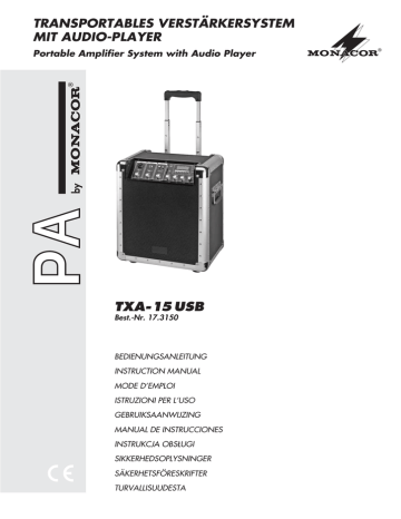 TRANSPORTABLES VERSTÄRKERSYSTEM MIT AUDIO-PLAYER Portable Amplifier System with Audio Player TXA-15 USB Best.-Nr. 17.3150 BEDIENUNGSANLEITUNG INSTRUCTION MANUAL MODE D’EMPLOI ISTRUZIONI PER L’USO GEBRUIKSAANWIJZING MANUAL DE INSTRUCCIONES INSTRUKCJA OBSŁUGI SIKKERHEDSOPLYSNINGER SÄKERHETSFÖRESKRIFTER TURVALLISUUDESTA D Bevor Sie einschalten … A Wir wünschen Ihnen viel Spaß mit Ihrem neuen Gerät von MONACOR. Bitte lesen Sie diese Bedienungsanleitung vor dem Betrieb gründlich durch. Nur so lernen Sie alle Funktionsmöglichkeiten kennen, vermeiden Fehlbedienungen und schützen sich und Ihr Gerät vor eventuellen Schäden durch unsachgemäßen Gebrauch. Heben Sie die Anleitung für ein späteres Nachlesen auf. We wish you much pleasure with your new MONACOR unit. Please read these operating instructions carefully prior to operating the unit. Thus, you will get to know all functions of the unit, operating errors will be prevented, and yourself and the unit will be protected against any damage caused by improper use. Please keep the operating instructions for later use. Der deutsche Text beginnt auf der Seite 4. The English text starts on page 6. CH Before switching on … F Avant toute installation … B Nous vous souhaitons beaucoup de plaisir à utiliser cet appareil MONACOR. Lisez ce mode dʼemploi entièrement avant toute utilisation. Uniquement ainsi, vous pourrez apprendre lʼensemble des possibilités de fonctionnement de lʼappareil, éviter toute manipulation erronée et vous protéger, ainsi que lʼappareil, de dommages éventuels engendrés par une utilisation inadaptée. Conservez la notice pour pouvoir vous y reporter ultérieurement. Vi auguriamo buon divertimento con il vostro nuovo apparecchio di MONACOR. Leggete attentamente le istruzioni prima di mettere in funzione lʼapparecchio. Solo così potete conoscere tutte le funzionalità, evitare comandi sbagliati e proteggere voi stessi e lʼapparecchio da eventuali danni in seguito ad un uso improprio. Conservate le istruzioni per poterle consultare anche in futuro. La version française se trouve page 8. Il testo italiano inizia a pagina 10. CH NL B PL S 2 GB Voor u inschakelt … I E Prima di accendere … Antes de la utilización … Wij wensen u veel plezier met uw nieuwe apparaat van MONACOR. Lees deze gebruikershandleiding grondig door, alvorens het apparaat in gebruik te nemen. Alleen zo leert u alle functies kennen, vermijdt u foutieve bediening en behoedt u zichzelf en het apparaat voor eventuele schade door ondeskundig gebruik. Bewaar de handleiding voor latere raadpleging. Le deseamos una buena utilización para su nuevo aparato MONACOR. Por favor, lea estas instrucciones de uso atentamente antes de hacer funcionar el aparato. De esta manera conocerá todas las funciones de la unidad, se prevendrán errores de operación, usted y el aparato estarán protegidos en contra de todo daño causado por un uso inadecuado. Por favor, guarde las instrucciones para una futura utilización. De Nederlandstalige tekst vindt u op pagina 12. La versión española comienza en la página 14. Przed uruchomieniem … DK Før du tænder … Życzymy zadowolenia z nowego produktu MONACOR. Dzięki tej instrukcji obsługi będą państwo w stanie poznać wszystkie funkcje tego urządzenia. Stosując się do instrukcji unikną państwo błędów i ewentualnego uszkodzenia urządzenia na skutek nieprawidłowego użytkowania. Prosimy zachować instrukcję. Tillykke med dit nye MONACOR produkt. Læs sikkerhedsanvisningerne nøje før ibrugtagning, for at beskytte Dem og enheden mod skader, der skyldes forkert brug. Gem venligst denne betjeningsvejledning til senere brug. Tekst polski zaczyna się na stronie 16. Sikkerhedsanvisningerne findes på side 18. Innan du slår på enheten … FIN Ennen kytkemistä … Vi önskar dig mycket glädje med din nya MONACOR produkt. Läs igenom säkerhetsföreskrifterna innan enheten tas i bruk för att undvika skador till följd av felaktig hantering. Behåll instruktionerna för framtida bruk. Toivomme Sinulle paljon miellyttäviä hetkiä uuden MONACOR laitteen kanssa. Ennen laitteen käyttöä pyydämme Sinua huolellisesti tutustumaan turvallisuusohjeisiin. Näin vältyt vahingoilta, joita virheellinen laitteen käyttö saattaa aiheuttaa. Ole hyvä ja säilytä käyttöohjeet myöhempää tarvetta varten. Säkerhetsföreskrifterna återfinns på sidan 18. Turvallisuusohjeet löytyvät sivulta 19. T X A -15USB PLAY/PAUSE STOP USB/ SD PLAY TIME /TOTAL TIME REPEAT ONE /ALL EQ PORTABLE AMPLIFIER SYSTEM NUMBER 1 2 3 4 5 6 7 8 230 V ~ / 50 Hz 3 CHARGE 2 1 LINK OUTPUT 13 3 14 15 16 LOW BATTERY LEVEL POWER T 500 m AL 17 18 9 NAME VOLUME 10 11 12 PL Proszę otworzyć niniejszą instrukcję na stronie 3. Pokazano tam rozkład elementów operacyjnych i gniazd połączeniowych. 2 Środki bezpieczeństwa Urządzenie spełnia wszystkie wymagania norm UE dlatego zostało oznaczone symbolem . UWAGA 1 Elementy operacyjne i złącza 1 Wejście MIC 1 (combo 6,3 mm / XLR, sym.) do podłączania mikrofonu 2 Regulator głośności dla wejścia MIC 1 3 Wejście MIC 2 (gniazdo 6,3 mm, niesym.) do podłączania mikrofonu 4 Regulator głośności dla wejścia MIC 2 Należy przestrzegać następujących zasad: G Urządzenie przeznaczone jest wyłącznie do użytku wewnątrz pomieszczeń. Należy chronić je przez wodą, dużą wilgotnością oraz wysoką temperaturą (dopuszczalny zakres wynosi 0 – 40 °C). G Na urządzeniu nie należy stawiać żadnych pojemników z cieczą np. szklanek. G Ciepło wytwarzane podczas pracy urządzenia musi być odprowadzane przez otwory wentylacyjne. W związku z tym nie wolno ich nigdy zasłaniać. G Nie wolno używać urządzenia lub natychmiast odłączyć wtyczkę zasilającą z gniazdka jeżeli 1. widoczne są jakiekolwiek uszkodzenia urządzenia lub kabla zasilającego, 2. urządzenie upadło lub uległo podobnemu wypadkowi, który mógł spowodować jego uszkodzenie, 3. urząd