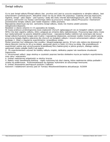 drwesolowski.pl Świąd odbytu Co to jest świąd odbytu?Świąd odbytu (łac. pruritus ani) jest to uczucie swędzenia w obrębie odbytu. Jest schorzeniem cywilizacyjnym. Aktualnie cierpi na nią aż około 5% populacji. Częściej chorują mężczyźni. Ogólnie, świąd - jako objaw - jest typowy i stały dla wielu chorób dermatologicznych, jak np. świerzbu, grzybicy, pokrzywki czy liszaju czerwonego.Jakie są przyczyny świądu odbytu?Przyczyna i mechanizm powstawania świądu odbytu jest nadal niejasna i słabo poznana. Najczęściej obserwuje się tzw. samoistny świąd odbytu, kiedy nie można ustalić powodu dolegliwości/objawów. Niedobór w diecie witamin A i D usposabia do świądu. W mojej praktyce proktologicznej duża większość chorych zgłaszających sie ze świądem odbytu (ponad 90%) ma stan zapalny odbytu, który ustępuje po zmianie diety (jakościowej). Przyczyną tego stanu może być nadwrażliwość na pewne składniki pokarmowe - najczęściej białka roślinne lub zwierzęce.Jak leczyć świąd odbytu?Leczenie świądu jest trudne i najczęściej objawowe, ponieważ rzadko można ustalić pewną przyczynę świądu.Ogólne zalecenia dla chorych ze świądem odbytu i innymi schorzeniami odbytu i jelita grubego:1. Dbać o regularne wypróżnienia i prawidłowy stolec. Stolec powinien być oddawany bez wysiłku i długotrwającego parcia. W tym celu zaleca się stosować w diecie błonnik (norma to 40 g na dobę), spożywać płyny w ilości 2,5 litra na dobę. Dla prawidłowych wypróżnień ważne jest utrzymywanie prawidłowej flory bakteryjnej w jelicie grubym, dlatego należy spożywać mleko zsiadłe (kefir) lub jogurt. 2. Po wypróznieniach używać do toalety odbytu miękki, delikatny papier lub nawilżone chusteczki higieniczne. 3. Utrzymywać odbyt i jego okolicę w czystości poprzez bardzo dokładne mycie po każdym wypróżnieniu oraz rano i wieczorem. 4. Unikać nadmiernej wilgotności w okolicy krocza. 5. Należy nosić bawełnianą bieliznę - nigdy nylonową lub zbyt ciasną, która nadmiernie zbliża pośladki i uciska na podbrzusze. Przeciwwskazane są rajstopy wykonane ze sztucznego tworzywa. 6. Unikać stosowania pachnących pudrów z talkiem. Autorem i redaktorem serwisu jest dr Tomasz WesołowskiOstatnia aktualizacja: 9/2009 http://drwesolowski.pl/joomla Kreator PDF Utworzono 2 March, 2017, 20:45