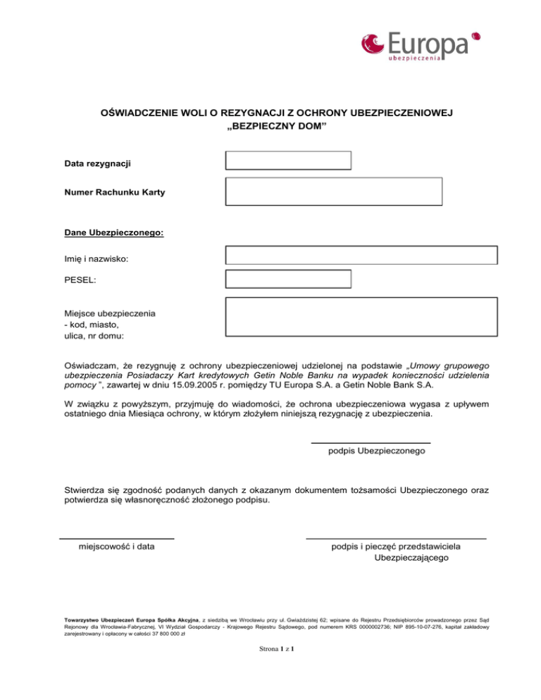 OŚWIADCZENIE WOLI O REZYGNACJI Z OCHRONY UBEZPIECZENIOWEJ „BEZPIECZNY DOM” Data rezygnacji Numer Rachunku Karty Dane Ubezpieczonego: Imię i nazwisko: PESEL: Miejsce ubezpieczenia - kod, miasto, ulica, nr domu: Oświadczam, że rezygnuję z ochrony ubezpieczeniowej udzielonej na podstawie „Umowy grupowego ubezpieczenia Posiadaczy Kart kredytowych Getin Noble Banku na wypadek konieczności udzielenia pomocy ”, zawartej w dniu 15.09.2005 r. pomiędzy TU Europa S.A. a Getin Noble Bank S.A. W związku z powyższym, przyjmuję do wiadomości, że ochrona ubezpieczeniowa wygasa z upływem ostatniego dnia Miesiąca ochrony, w którym złożyłem niniejszą rezygnację z ubezpieczenia. podpis Ubezpieczonego Stwierdza się zgodność podanych danych z okazanym dokumentem tożsamości Ubezpieczonego oraz potwierdza się własnoręczność złożonego podpisu. miejscowość i data podpis i pieczęć przedstawiciela Ubezpieczającego Towarzystwo Ubezpieczeń Europa Spółka Akcyjna, z siedzibą we Wrocławiu przy ul. Gwiaździstej 62; wpisane do Rejestru Przedsiębiorców prowadzonego przez Sąd Rejonowy dla Wrocławia-Fabrycznej, VI Wydział Gospodarczy - Krajowego Rejestru Sądowego, pod numerem KRS 0000002736; NIP 895-10-07-276, kapitał zakładowy zarejestrowany i opłacony w całości 37 800 000 zł Strona 1 z 1