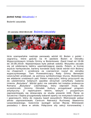 Jesteś tutaj: Aktualności > Bożenki zaszalały 23 czerwiec 2010 08:21:00 Bożenki zaszalały Iście szampańskie nastroje panowały wśród 61 Bożen z polski i zagranicy, które gościły na III zjeździe Bożen w Ośrodku Wypoczynkowym Urzędu Gminy w Bożenkowie. Zjazd trwał od 19.06 do 20.06.2010r. Najważniejsza była jednak sobota. Wszystko zaczęło się od odsłonięcia tablicy upamiętniającej zjazdy. Potem, w licznej asyście harleyowców, barwny korowód (były także wśród nich Bożeny na choperach i przebrane za czarownice) ruszył do ośrodka wypoczynkowego. Tam Przewodniczący Rady Gminy Benedykt Leszczyński przekazał, za pomocą symbolicznego klucza, Bożenkowo we władanie urodziwych pań. Potem mężczyźni, którzy przyczynili się do uświetnienia kolejnych zjazdów otrzymali certyfikaty nadania imienia „Bożydara”. Wśród gości nie zabrakło też księdza proboszcza Romana „Bożydara” Lidzińskiego, który odprawił mszę dla uczestniczek. Gminny Ośrodek Kultury przygotował program artystyczny. Z repertuarem lekkim, łatwym i przyjemnym zaprezentowały się dziewczęta ze studia piosenki GOK. Panie ze Szczecina i Śląska przygotowały kabaret oparty na motywach lokalnych i gwarowych, który do rozpuku bawił wszystkich. Mistrzowski pokaz aikido zaprezentowało Centrum Rekreacji Ruchowej Sławomira Lewandowskiego. Gościnnie wystąpił sensei Maciej Wiśniewski posiadacz I dana w aikido. Połączone siły sekcji koronowskiej i http://www.osielsko.pl/blog/1_330-bozenki_zaszalaly.html Strona 1/3 bydgoskiej prezentowały techniki treningowe. Starsze stopnie techniki mistrzowskie, obronę przed mieczem, kijem, nożem. Panie doceniły klasę pokazu i co więcej same próbowały swoich sił z mężczyznami kultywującymi tradycje samurajskie oraz prosiły o porady... Instruktor Daniel Kossakowski ze świetlicy w Bożenkowie przygotował wraz z młodzieżą kabaret pt. „Romeo i Julia”, Natalia Nadolska zaśpiewała piosenki Dody i Maryli Rodowicz, konkurs „Jak oni śpiewają” . Panie nie tylko słuchały . Przy wielu utworach tańczyły. Na zakończenie występów artystycznych kilka z poznańskich Bożen przygotowały metamorfozy , czyli przebrały się za najbardziej topowe piosenkarki polskie i zaśpiewały ich przeboje, podkreślając przy tym , że za 40 lat będzie śpiewać i wyglądać owa gwiazda. Motocykliści co chwila zabierali je na przejażdżki chopperami a LOK z Dobrcza urządził konkurs strzelania z broni pneumatycznej. Zwyciężyła Bożena „Zając” Zajączek, drugie miejsce zajęła Bożena Marchlewicz, trzecie Bożena Wostal. W świetnych humorach panie opuściły Bożenkowo udając się na ognisko i nocleg do Janowa. Wszystkie solennie obiecały przyjazd na IV zjazd i dziękowały za atrakcyjny program oraz gościnność. http://www.osielsko.pl/blog/1_330-bozenki_zaszalaly.html Strona 2/3 Marek „Bożydar” Manuszewski drukuj Wróć http://www.osielsko.pl/blog/1_330-bozenki_zaszalaly.html Powered by TCPDF (www.tcpdf.org) Strona 3/3