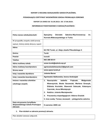 RAPORT Z ROCZNEJ DZIAŁALNOŚCI SZKOŁY/PLACÓWKI, POSIADAJĄCEJ CERTYFIKAT WOJEWÓDZKI SZKOŁA PROMUJĄCA ZDROWIE RAPORT ZA OKRES OD 01.09.2013r. DO 27.06.2014r. INFORMACJE PODSTAWOWE O SZKOLE/PLACÓWCE: Pełna nazwa szkoły/placówki Specjalny Ośrodek Szkolno-Wychowawczy im. Kornela Makuszyńskiego w Turku W przypadku zespołu szkół proszę wpisać, której szkoły dotyczy raport Adres 62-700 Turek, ul. Aleja Józefa Piłsudskiego 5 Gmina Turek Powiat turecki Telefon 063 289 60 61 Adres mailowy szkoły [email protected] Adres mailowy koordynatora [email protected] Strona www www.zpew-turek.pl Imię i nazwisko dyrektora Jolanta Baran Imię i nazwisko koordynatora Agnieszka Idzikowska, Iwona Andrzejak Imiona i nazwiska członków 1. Nauczyciele: szkolnego zespołu Izabella Frątczak, Małgorzata Wawrzyniuk, Beata Szczesiak, Marlena Graczyk, Elżbieta Kociołek, Sławomir Sobczak, Katarzyna Czerniak, Anna Mikołajczyk 2. Rodzice: Jolanta Maciejewska 3. Pracownicy niepedagogiczni: Aldona Grzelak 5. Inne osoby: Teresa Jacaszek – pielęgniarka szkolna Data otrzymania Certyfikatu Wojewódzkiego Szkoła Promująca Zdrowie 9 czerwiec 2009 rok 1. Plan działań w zakresie promocji zdrowia. Plan działań stanowi załącznik. 2. Sprawozdanie z realizacji podjętych działań. W naszym Ośrodku realizowane były programy edukacyjne, takie jak: Trzymaj Formę, „Bądźmy Zdrowi – Wiemy, Więc Działamy”, „Żyj smacznie i zdrowo”, „Owoce w szkole”, Program edukacji antynikotynowej dla uczniów klas I – III szkoły podstawowej „Nie pal przy mnie proszę”, Program profilaktyki palenia tytoniu dla uczniów starszych klas szkoły podstawowej oraz gimnazjum „Znajdź właściwe rozwiązanie”, Program Ograniczania Zdrowotnych Następstw Palenia Tytoniu w Polsce oraz Ogólnopolska Kampania Społeczna w zakresie zapobiegania HIV/AIDS, „Wybierz życie – pierwszy krok”, „ARS – jak dbać o miłość”. Kontynuujemy realizację projektu „ Bądźmy zdrowi – wiemy, więc działamy ”, który realizowany był w szkole podstawowej, gimnazjum oraz w grupach wychowawczych. Jego celem było kształtowanie stylu. życia i warunków sprzyjających zdrowiu, jego poprawie i ochronie oraz wdrażanie do kultywowania właściwych zachowań prozdrowotnych. W miesiącu wrześniu 2013 roku został opracowany harmonogram działań dotyczący realizacji projektu na rok szkolny 2013/2014, który został przedstawiony rodzicom uczniów Ośrodka na spotkaniu z rodzicami. W ramach projektu odbył się szkolny konkurs plastyczny, którego celem było zachęcenie młodzieży do kształtowania właściwych nawyków i umiejętności prozdrowotnych, a zadaniem opracowanie i wykonanie plakatu na temat: „Zbilansowana dieta i aktywność fizyczna ”dowolną techniką plastyczną. W miesiącu grudniu w związku ze zbliżającymi się Świętami Bożego Narodzenia odbył się konkurs Savoir-vivre, na nakrycie świątecznego stołu. W maju uczniowie uczestniczyli w Dniu Marchewki oraz Turnieju Gier Zespołowych. W tych dniach uczestnicy zapoznali się w właściwościami odżywczymi marchewki, wykonali tematyczne prace plastyczne i degustowali sok marchewkowy. Ponadto brali udział w grach zespołowych : piłce nożnej, koszykówce oraz piłce siatkowej. Głównym celem turnieju było propagowanie zdrowego stylu życia poprzez zwiększenie aktywności fizycznej wśród dzieci i młodzieży. W dalszym ciągu prowadzimy działania w ramach programu „Trzymaj Formę”. Przewodnimi celami tego programu jest poszerzenie wiedzy dotyczącej zdrowego żywienia, zbilansowanej diety i aktywności fizycznej, kształtowanie umiejętności niezbędnych do utrzymania zdrowia i kondycji fizycznej, pogłębienie zainteresowania problematyką prozdrowotną wśród rodziców i uczniów. Dnia 24 października z okazji obchodów Światowego Dnia Walki z Otyłością odbyły się działania poruszające problem nadwagi i otyłości i zwiększające świadomość w kwestii prawidłowego odżywiania i aktywności fizycznej, takie jak: pogadanki, prezentacja multimedialna, konkurs plastyczny. Zwycięzcy zostali nagrodzeni zdrowymi sokami, a wykonane prace mogliśmy oglądać na holu szkoły. W miesiącu styczniu w ramach kontynuacji tematu odbyły się zajęcia przeprowadzone przez wykwalifikowaną instruktorkę siłowni Fitness Planet, która przedstawiła ćwiczenia wpływające na zgrabną i szczupłą sylwetkę, a następnie przeprowadziła pogadankę na temat prawidłowego odżywiania się i aktywności fizycznej. Uczniowie Ośrodka uczestniczyli również w zajęciach na krytej pływalni i wzięli udział w spotkaniu z dietetykiem medycznym. Uczniowie obejrzeli prezentację i dowiedzieli się, jak powinny wyglądać zdrowe nawyki żywieniowe oraz jakie choroby są przyczyną złego odżywiania i nadwagi, a w gabinecie pielęgniarki odbyły się pomiary mierzenia ciśnienia, badania tętna oraz obliczania BMI. Na zakończenie uczniowie przygotowali zdrowe przekąski z owoców i warzyw. Programy „Bądźmy zdrowi – wiemy, więc działamy” i „Trzymaj Formę” zostały podsumowane w dniu 30 maja 2014 roku. Na tę okoliczność została przygotowana gazetka informacyjna z działań projektu, przeprowadzony quiz o zdrowym stylu życia oraz przygotowany zdrowy poczęstunek w postaci kolorowych przekąsek z owoców, warzyw, smacznych kanapek i soku marchewkowego. Uczniowie nie tylko zadbali o przygotowanie pysznego posiłku, ale również estetycznie i prawidłowo nakryli do stołu. W roku szklonym 2013/2014 nasza szkoła przystąpiła do IV edycji programu edukacyjnego „Żyj smacznie i zdrowo”. Programem objęte zostały wszystkie klasy gimnazjalne naszego Ośrodka. Głównym celem programu było: wzbogacenie wiedzy uczniów na temat prawidłowego odżywiania, zachęcanie do pierwszych eksperymentów w kuchni oraz rodzinnego spożywania posiłków. W miesiącu wrześniu 2013 została przeprowadzona wśród ucz