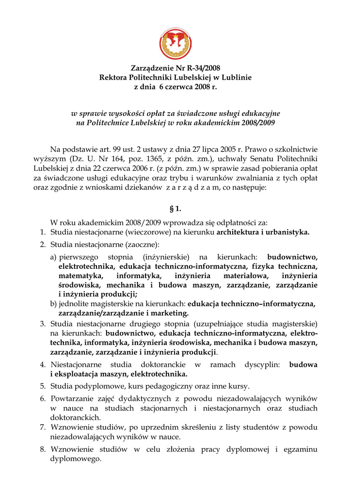 Zarządzenie Nr R-34/2008 Rektora Politechniki Lubelskiej w