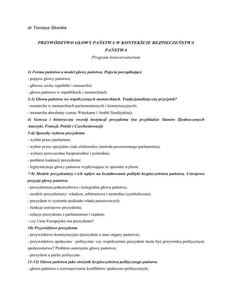 dr Tomasz Słomka PRZYWÓDZTWO GŁOWY PAŃSTWA W KONTEKŚCIE BEZPIECZEŃSTWA PAŃSTWA Program konwersatorium 1) Forma państwa a model głowy państwa. Pojęcia porządkujące - pojęcie głowy państwa; - główne cechy republiki i monarchii; - głowa państwa w republikach i monarchiach. 2-3) Głowa państwa we współczesnych monarchiach. Tradycjonalistyczny przeŜytek? - monarcha w monarchiach parlamentarnych i konstytucyjnych; - monarcha absolutny (casus Watykanu i Arabii Saudyjskiej). 4) Geneza i historyczny rozwój instytucji prezydenta (na przykładzie Stanów Zjednoczonych Ameryki, Francji, Polski i Czechosłowacji) 5-6) Sposoby wyboru prezydenta - wybór przez parlament; - wybór przez specjalne ciała elektorskie (metoda poszerzonego parlamentu); - wybory powszechne bezpośrednie i pośrednie; - problem kadencji prezydenta; - legitymizacja głowy państwa wypływająca ze sposobu wyboru. 7-9) Modele prezydentury i ich wpływ na kształtowanie polityki bezpieczeństwa państwa. Ustrojowa pozycja głowy państwa - prezydentura jednoosobowa i kolegialna głowa państwa; - modele prezydentury: władcza, arbitraŜowa i neutralna (symboliczna); - prezydent w systemie podziału władz państwowych; - funkcje ustrojowe prezydenta; - relacje prezydenta z parlamentem i rządem; - czy Unia Europejska ma prezydenta? 10) Przywództwo prezydenta - przywództwo konstytucyjne (prezydent a inne organy państwa); - przywództwo społeczno - polityczne: czy współcześnie prezydent moŜe być przywódcą politycznym społeczeństwa? Problem autorytetu głowy państwa; - prezydent a partie polityczne. 11-12) Głowa państwa jako straŜnik bezpieczeństwa politycznego państwa - głowa państwa a rozwiązywanie konfliktów społeczno-politycznych; - głowa państwa a mechanizmy ochrony ładu konstytucyjnego; - relacje między głową państwa a słuŜbami specjalnymi; - głowa państwa jako gwarant utrzymania państwowości (casus Czechosłowacji, Jugosławii, BośniHercegowiny, Belgii i Hiszpanii). 13-14) Głowa państwa jako zwierzchnik lub dowódca sił zbrojnych - istota zwierzchnictwa i dowództwa sił zbrojnych; - rodzaje uprawnień głowy państwa jako zwierzchnika sił zbrojnych; - organy wspierające głowę państwa w wykonywaniu zwierzchnictwa nad siłami zbrojnymi; - siły zbrojne jako element polityki prowadzonej przez głowę państwa (casus Turcji, Chile, Egiptu i Polski). 15) Formy odpowiedzialności głowy państwa. - odpowiedzialność polityczna i jej formy; - odpowiedzialność konstytucyjna; - inne formy odpowiedzialności. Wybrana literatura Antoszewski A., Herbut R., Demokracje Europy Środkowo - Wschodniej w perspektywie porównawczej, Wrocław 1997 Antoszewski A., Herbut R., Systemy polityczne współczesnego świata, Gdańsk 2001 Banaszak B., Prawo konstytucyjne, Warszawa 2001 Budzanowska A., Bugaj M., Czajowski J., Gawlik B., Grzybowski M., Karp J., Mikuli P., Niewitała M., Szkice o pozycji ustrojowej i statusie głowy państwa, Kraków 2003. Dziemidok-Olszewska B., Instytucja Prezydenta w państwach Europy Środkowo-Wschodniej, Lublin 2003 Gebethner S., Modele rządów prezydenckich, Warszawa 1982 Gebethner S., Parlamentarne i prezydenckie systemy rządów, "Państwo i Prawo" z.7-8/1994 Grabowska S., Grabowski R. (red.), Prawo wyborcze na urząd prezydenta w państwach europejskich, Warszawa 2007 Instytucja prezydenta we współczesnym świecie. Materiały na konferencję Warszawa - Senat 22-23 lutego 1993 r., Warszawa 1993 Mołdawa T., Szymanek J. (red.), Instytucja prezydenta. Zagadnienia teorii i praktyki na tle doświadczeń polskich oraz wybranych państw obcych, Warszawa 2010. Osiński J. (red.), Prezydent w państwach współczesnych, Warszawa 2000 Słomka T., Prezydent Rzeczypospolitej po 1989 roku. Ujęcie porównawcze, Warszawa 2005 Słomka T., Głowa państwa w europejskich systemach politycznych (wybrane problemy), „Politeja” 2007, nr 1(7) Wołpiuk W.J., Instytucja prezydenta. Geneza i rozwój, [w:], Konstytucja i władza we współczesnym świecie. Prace dedykowane Profesorowi Wojciechowi Sokolewiczowi na siedemdziesięciolecie urodzin, Warszawa 2002 Forma zaliczenia: recenzja ksiąŜki dotyczącej problematyki przedmiotu oraz obecność na zajęciach.