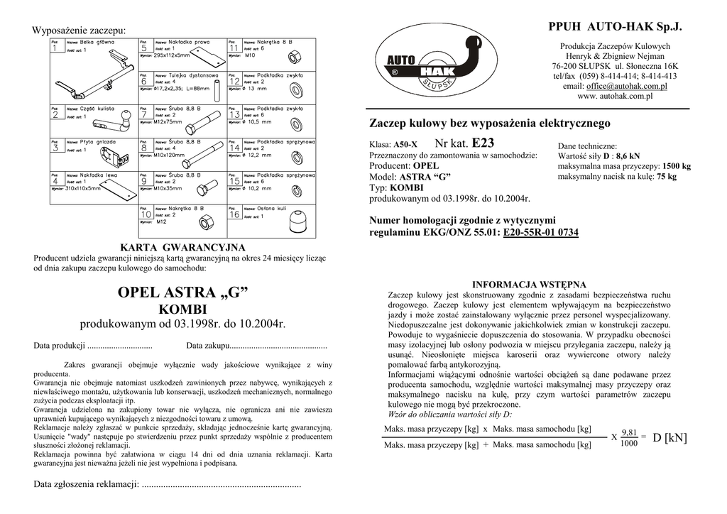 PPUH AUTO-HAK Sp.J. WyposaŜenie zaczepu: Produkcja Zaczepów Kulowych Henryk & Zbigniew Nejman 76-200 SŁUPSK ul. Słoneczna 16K tel/fax (059) 8-414-414; 8-414-413 email: [email protected] www. autohak.com.pl Zaczep kulowy bez wyposaŜenia elektrycznego E23 Klasa: A50-X Nr kat. Przeznaczony do zamontowania w samochodzie: Producent: OPEL Model: ASTRA “G” Typ: KOMBI produkowanym od 03.1998r. do 10.2004r. Dane techniczne: Wartość siły D : 8,6 kN maksymalna masa przyczepy: 1500 kg maksymalny nacisk na kulę: 75 kg Numer homologacji zgodnie z wytycznymi regulaminu EKG/ONZ 55.01: E20-55R-01 0734 KARTA GWARANCYJNA Producent udziela gwarancji niniejszą kartą gwarancyjną na okres 24 miesięcy licząc od dnia zakupu zaczepu kulowego do samochodu: OPEL ASTRA „G” KOMBI produkowanym od 03.1998r. do 10.2004r. Data produkcji .............................. Data zakupu............................................. Zakres gwarancji obejmuje wyłącznie wady jakościowe wynikające z winy producenta. Gwarancja nie obejmuje natomiast uszkodzeń zawinionych przez nabywcę, wynikających z niewłaściwego montaŜu, uŜytkowania lub konserwacji, uszkodzeń mechanicznych, normalnego zuŜycia podczas eksploatacji itp. Gwarancja udzielona na zakupiony towar nie wyłącza, nie ogranicza ani nie zawiesza uprawnień kupującego wynikających z niezgodności towaru z umową. Reklamacje naleŜy zgłaszać w punkcie sprzedaŜy, składając jednocześnie kartę gwarancyjną. Usunięcie "wady" następuje po stwierdzeniu przez punkt sprzedaŜy wspólnie z producentem słuszności złoŜonej reklamacji. Reklamacja powinna być załatwiona w ciągu 14 dni od dnia uznania reklamacji. Karta gwarancyjna jest niewaŜna jeŜeli nie jest wypełniona i podpisana. Data zgłoszenia reklamacji: ................................................................... INFORMACJA WSTĘPNA Zaczep kulowy jest skonstruowany zgodnie z zasadami bezpieczeństwa ruchu drogowego. Zaczep kulowy jest elementem wpływającym na bezpieczeństwo jazdy i moŜe zostać zainstalowany wyłącznie przez personel wyspecjalizowany. Niedopuszczalne jest dokonywanie jakichkolwiek zmian w konstrukcji zaczepu. Powoduje to wygaśniecie dopuszczenia do stosowania. W przypadku obecności masy izolacyjnej lub osłony podwozia w miejscu przylegania zaczepu, naleŜy ją usunąć. Nieosłonięte miejsca karoserii oraz wywiercone otwory naleŜy pomalować farbą antykorozyjną. Informacjami wiąŜącymi odnośnie wartości obciąŜeń są dane podawane przez producenta samochodu, względnie wartości maksymalnej masy przyczepy oraz maksymalnego nacisku na kulę, przy czym wartości parametrów zaczepu kulowego nie mogą być przekroczone. Wzór do obliczania wartości siły D: Maks. masa przyczepy [kg] x Maks. masa samochodu [kg] Maks. masa przyczepy [kg] + Maks. masa samochodu [kg] X 9,81 = 1000 D [kN] INSTRUKCJA montaŜu i eksploatacji zaczepu kulowego Oznaczenie zacisku wg ISO PN 1 L 2 + 3 31 4 R 5 58R 6 54 7 58L Kolejność czynności przy montaŜu 8 Łączenie przewodów Kierunkowskazy lewe Tylne światła przeciwmgłowe Masa Kierunkowskazy prawe Światła pozycyjne prawe Światła hamowania Światła pozycyjne lewe 5 8 A 9 7 1 4 6 2 1. Zdemontować zderzak a wewnątrz bagaŜnika osłony tylnego płata i bocznych ścian oraz odchylić do tyłu wykładzinę dywanową 2. Z prawej i lewej strony odszukać po trzy wyraźnie zaznaczone punkty, a następnie w skrajnych punktach wykonać po dwa otwory ø17mm. 3. W wykonane otwory włoŜyć odpowiednie tulejki dystansowe oraz przełoŜyć nakładki (poz. 4 i 5), a następnie włoŜyć śruby M10 jak na rysunku. 4. Od spodu samochodu na wystające śruby przyłoŜyć belkę główną zaczepu (poz. 1), a następnie przykręcić z odpowiednim momentem. 5. Przez otwory zaczepu (poz. A) przykręcić do ucha holowniczego przez fabryczne otwory śrubami M10x30mm (poz. 9). 6. Po wymontowaniu z czaszy zderzaka wypełnienia piankowego zamontować zderzak. 7. Do tak zamontowanego zaczepu przykręcić część kulistą (poz. 2) wraz z blachą pod gniazdo (poz. 3), śrubami M12x75mm (poz. 7). 8. Zawiesić tłumik, zamontować osłonę termiczna oraz zderzak. 9. Podłączyć przewody z gniazdka 7- bieg. do instalacji elektrycznej zgodnie z instrukcją fabryczną samochodu (zaleca się wykonanie w ASO). 10. Uzupełnić ewentualne ubytki powłoki malarskiej zaczepu powstałe w trakcie montaŜu. 3 Zaczep kulowy przeznaczony jest do zamontowania w samochodzie: OPEL ASTRA „G” KOMBI, produkowanym od 03.1998r. do 10.2004r., numer katalogowy E23 i słuŜy do ciągnięcia przyczep o masie całkowitej do 1500 kg i nacisku na kulę max 75 kg. OD PRODUCENTA Dziękujemy za wybór produkowanego przez naszą firmę zaczepu kulowego. Jego niezawodność została potwierdzona licznymi testami oraz opiniami zadowolonych klientów. JednakŜe niezawodność zaczepów kulowych jest zaleŜna równieŜ od prawidłowego montaŜu oraz prawidłowej eksploatacji. Z tego powodu prosimy Państwa o staranne przeczytanie niniejszej instrukcji montaŜu oraz przestrzeganie zawartych wskazówek. Zaczep naleŜy zamontować w miejscach do tego celu przeznaczonych przez producenta samochodu. Zalecany moment skręcający dla śrub i nakrętek 8,8: M6 - 11 Nm M8 - 25 Nm M10 - 50 Nm M12 - 87 Nm M14 - 138 Nm M16 - 210 Nm UWAGA Po zamontowaniu zaczepu kulowego naleŜy uzyskać wpis w dowodzie rejestracyjnym pojazdu na „stacji kontroli pojazdów” właściwej dla miejsca zamieszkania. Samochód powinien być wyposaŜony w : -kierunkowskazy boczne -lusterka boczne o rozstawie co najmniej szerokości przyczepy Sprawdzać śruby mocujące zaczepu kulowego po około 1 000 km przebiegu eksploatacji. Kula zaczepu musi być utrzymana w czystości i konserwowana smarem stałym.