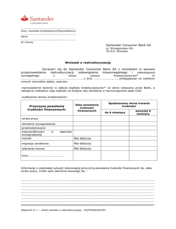 ………………………………………………………………… Imię i nazwisko Kredytobiorcy/Pożyczkobiorcy …………………………………………………………………. Adres ………………………………………………………………... Nr Umowy Santander Consumer Bank SA ul. Strzegomska 42c 53-611 Wrocław Wniosek o restrukturyzację Zwracam się do Santander Consumer Bank SA z wnioskiem w sprawie przeprowadzenia restrukturyzacji zobowiązania niewymagalnego i zobowiązania wymagalnego z tytułu umowy kredytu/pożyczki* nr …………………………………………………………………………..z dnia ………….………………., polegającego na ustaleniu nowych warunków spłaty, poprzez: -wprowadzenie karencji w spłacie kapitału kredytu/pożyczki* na okres wskazany przez Bank, a następnie rozłożeniu tego kapitału na kolejne raty określone w harmonogramie spłat i/lub -wydłużenie okresu kredytowania*. Przyczyna powstania trudności finansowych: Data powstania trudności finansowych Spodziewany okres trwania trudności do 6 miesięcy powyżej 6 miesięcy utrata pracy obniżenie wynagrodzenia przekredytowanie nieprawidłowości wynagrodzenia rozwód w płatności Nie dotyczy migracja zarobkowa Nie dotyczy zdarzenia losowe Nie dotyczy Inne: ………………………………………… Informacje o zaistniałej sytuacji stanowiącej przyczynę powstania trudności finansowych np. data utraty pracy, krótki opis zdarzenia losowego itp. : .......................................................................................................................................... .......................................................................................................................................... .......................................................................................................................................... .......................................................................................................................................... .......................................................................................................................................... .......................................................................................................................................... .......................................................................................................................................... .......................................................................................................................................... .......................................................................................................................................... Załącznik nr 1 – „Wzór wniosku o restrukturyzację – KH/PH/KS/KG/PS”. .......................................................................................................................................... .......................................................................................................................................... Jednocześnie Bank informuje, iż w przypadku podpisania aneksu w zakresie wnioskowanej wyżej restrukturyzacji ochrona ubezpieczeniowa, którą objęty jest Kredytobiorca/Pożyczkobiorca* ulegnie zmianie w zakresie wysokości świadczenia, która ustalana będzie na dzień wystąpienia zdarzenia objętego ochroną ubezpieczeniową: a) do końca bieżącego okresu ubezpieczenia - na podstawie harmonogramu spłat kredytu/pożyczki* obowiązującego na dzień przed zawarciem aneksu, b) po wznowieniu ochrony ubezpieczeniowej na kolejny okres ubezpieczenia - na podstawie harmonogramu spłaty kredytu/pożyczki* obowiązującego w dniu zajścia zdarzenia, z zachowaniem dotychczasowych zasad ustalania wysokości świadczenia z zastrzeżeniem, iż: w przypadku gdy ochrona ubezpieczeniowa jest wznawiana na kolejny okres ubezpieczenia w trakcie trwania karencji w spłacie kredytu/pożyczki* wynikającej z aneksu, do końca trwania okresu karencji wysokość świadczenia ustala będzie na podstawie harmonogramu spłat Kredytu/Pożyczki* obowiązującego na dzień przed zawarciem aneksu, a po zakończeniu okresu karencji w spłacie Kredytu/Pożyczki* - na podstawie harmonogramu spłaty Kredytu/ Pożyczki* obowiązującego w dniu zajścia zdarzenia**. Jednocześnie Bank informuje, iż w przypadku podpisania aneksu w zakresie wnioskowanego wyżej restrukturyzacji, ochrona ubezpieczeniowa, którą objęty jest Kredytobiorca/Pożyczkobiorca* ulegnie zmianie w zakresie: a) okresu ubezpieczenia, b) wysokości świadczenia, a Towarzystwo Ubezpieczeniowe odpowiadać będzie na podstawie harmonogramu spłat Kredytu/Pożyczki* obowiązującego przed zawarciem aneksu, z zachowaniem dotychczasowych zasad ustalania wysokości świadczenia***. .......................................................................... data i czytelny(e) podpis(y) Kredytobiorcy (ów)/Pożyczkobiorcy(ów) * należy wybrać odpowiednie ** dotyczy Umów Kredytu Hipotecznego/Kredytu Konsolidacyjnego/Pożyczki hipotecznej ubezpieczeniem na życie *** dotyczy Umów Kredytu gotówkowego objętych ubezpieczeniem na życie i/lub od utraty pracy Załącznik nr 1 – „Wzór wniosku o restrukturyzację – KH/PH/KS/KG/PS”. objętych