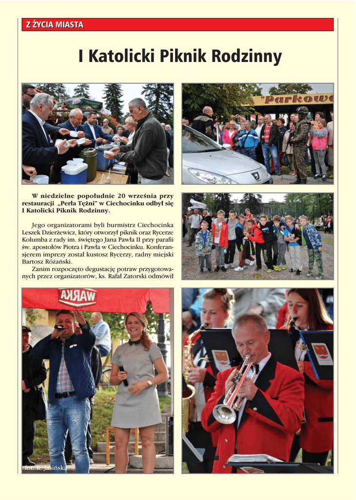 Z ˚YCIA MIASTA I Katolicki Piknik Rodzinny W niedzielne popo∏udnie 20 wrzeÊnia przy restauracji „Per∏a T´˝ni” w Ciechocinku odby∏ si´ I Katolicki Piknik Rodzinny. Jego organizatorami byli burmistrz Ciechocinka Leszek Dzier˝ewicz, który otworzy∏ piknik oraz Rycerze Kolumba z rady im. Êwi´tego Jana Paw∏a II przy parafii Êw. aposto∏ów Piotra i Paw∏a w Ciechocinku. Konferansjerem imprezy zosta∏ kustosz Rycerzy, radny miejski Bartosz Ró˝aƒski. Zanim rozpocz´to degustacj´ potraw przygotowanych przez organizatorów, ks. Rafa∏ Zatorski odmówi∏ fot. K. Jasiƒska modlitw´. Nast´pnie wszystkich zebranych cz´stowano „˝urem rycerskim”, po który ustawi∏a si´ bardzo d∏uga kolejka. Na schodach przy restauracji gra∏a Orkiestra D´ta Ochotniczej Stra˝y Po˝arnej z Wagaƒca pod dyrekcjà Romana OrganiÊciaka. Licznie przyby∏a publicznoÊç zgromadzi∏a si´ przy ustawionych poni˝ej restauracji sto∏ach, a tak˝e na zboczach alejki parkowej. Jednà z atrakcji pikniku by∏ tak˝e pokaz dynamiczny jednostki strzeleckiej z Torunia, która w strojach antyterrorystów dokona∏a zatrzymania p´dzàcych samochodów. Wr´czono równie˝ Puchar Rycerski uczestnikom meczu m∏odzików. Dru˝yna z Ciechocinka zwyci´˝y∏a z Racià˝kiem, pokonujàc rywali 11:0. Puchar odebra∏ zdobywca czterech goli Szymon Wi´ckowski z Ciechocinka. Nast´pnie kanclerz Rycerzy Jerzy St´pniak zapozna∏ publicznoÊç z dzia∏alnoÊcià Rycerzy Kolumba. Ostatnim punktem pikniku by∏ wyst´p muzyka Andrzeja Koziƒskiego. W czasie Êpiewu starego przeboju „Ach Franka, Franka” zaczà∏ padaç rz´sisty deszcz, który wystraszy∏ cz´Êç zebranych goÊci. Na szcz´Êcie oberwanie chmury nie trwa∏o d∏ugo, a piknik zakoƒczy∏ si´ wraz z nadejÊciem kolorowej t´czy. Wojciech Krzysztof Jankowski - kronikarz Rycerzy Kolumba z Ciechocinka ZAPRASZAMY Co? Gdzie? Kiedy? PAèDZIERNIK Gazeta Samorzàdu Lokalnego Wydawca: Urzàd Miejski Ciechocinka. Adres redakcji: ul. Kopernika 19, 87-720 Ciechocinek, tel. 54 416 18 00 Dy˝ury redakcji: Êroda 14.30 - 15.30 Biuro Promocji Miasta ul. Zdrojowa 2b e-mail: [email protected] Redaguje kolegium w sk∏adzie: Aldona Nocna, Katarzyna Kaliszewska, Barbara Kawczyƒska, Mariola Ró˝aƒska, Maciej Wzi´ch, Dawid Jasiƒski - redaktor naczelny. Ok∏adka Karolina Jasiƒska Opracowanie graficzne sk∏ad i ∏amanie: tel. 600 919 975. Druk: Pracownia Poligraficzna, Toruƒ, ul. Chrobrego 145/147, tel. 56 650 91 53 Tekstów niezamówionych redakcja nie zwraca. Zastrzegamy sobie prawo do skracania tekstów i redagowania tytu∏ów. Redakcja nie ponosi odpowiedzialnoÊci za opinie przedstawiane w publikacjach zamieszczonych na ∏amach gazety. 02.10.2015 r., godz. 17.00 Otwarcie wystawy fotografii Zbigniewa Przybysza pt. „Oko na Maroko” miejsce: galeria-czytelnia Miejskiej Biblioteki Publicznej w Ciechocinku, organizator: MBP w Ciechocinku 10.10.2015 r., godz. 15.00 II Mi´dzynarodowy Festiwal Piosenki Anny German - pó∏fina∏ miejsce: Teatr Letni, organizator: Liga Kobiet Polskich, Urzàd Miasta 11.10.2015 r., godz. 11.00 Ods∏oni´cie gwiazdy Roberta Korzeniowskiego na Deptaku S∏aw miejsce: deptak przy ul. Armii Krajowej, organizator: Urzàd Miejski 13.10.2015 r., godz. 19.00 XVIII Ogólnopolskie Spotkania Teatralne - spektakl „Wszystko przez Judasza” miejsce: Teatr Letni, organizator: Miejskie Centrum Kultury Uwaga: wszystkie bilety na spektakl zosta∏y wyprzedane! 24.10.2015 r., godz. 15.00 Koncert z cyklu „Cztery Pory Roku - Jesieƒ” miejsce: sala widowiskowa Miejskiego Centrum Kultury, organizator: MCK Powy˝sze kalendarium mo˝e ulec zmianie. 3 ZDRÓJ CIECHOCI¡SKI wrzesieƒ 2015
