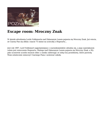 Escape room: Mroczny Znak W skutek odrodzenia Lorda Voldemorta nad Zakazanym Lasem pojawia się Mroczny Znak. Już wiecie, że Czarny Pan się zbliża i macie 75 minut na ucieczkę z Hogwartu... Jest rok 1997, Lord Voldemort najpotężniejszy z czarnoksiężników odradza się, a jego największym celem jest zniszczenie Hogwartu. Dlatego nad Zakazanym Lasem pojawia się Mroczny Znak, a Wy jako uczniowie uczelni musicie zbiec z zamku zabierając ze sobą trzy przedmioty, które pozwolą Wam ostatecznie zniszczyć Czarnego Pana i uratować szkołę.