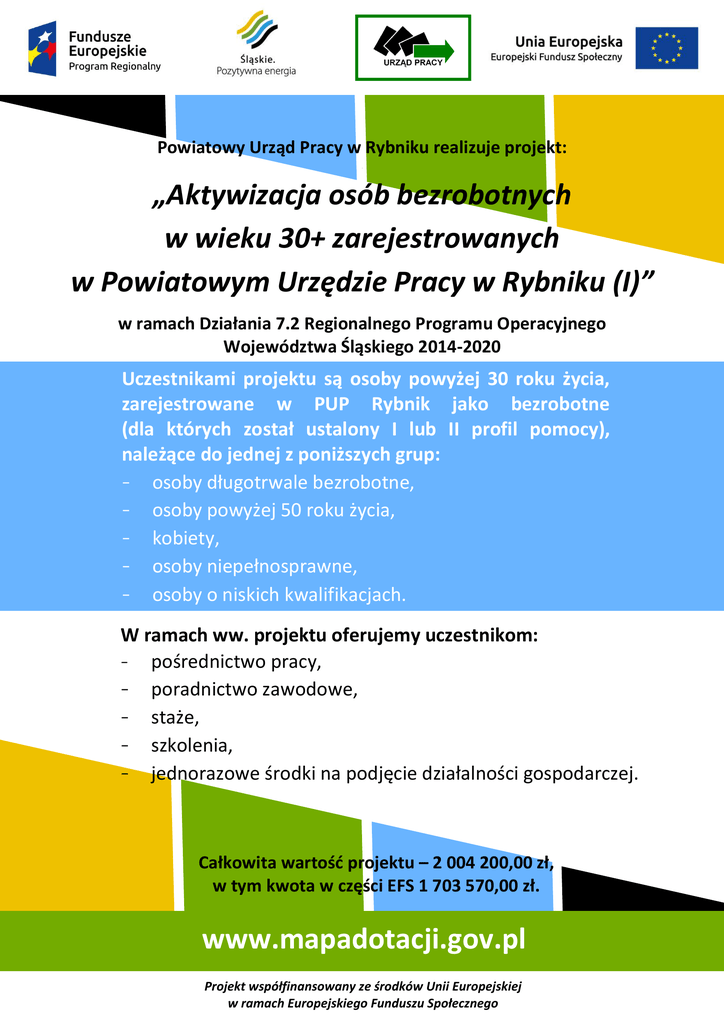 Powiatowy Urząd Pracy w Rybniku realizuje projekt: 4 „Aktywizacja osób bezrobotnych w wieku 30+ zarejestrowanych w Powiatowym Urzędzie Pracy w Rybniku (I)” w ramach Działania 7.2 Regionalnego Programu Operacyjnego Województwa Śląskiego 2014-2020 Uczestnikami projektu są osoby powyżej 30 roku życia, zarejestrowane w PUP Rybnik jako bezrobotne (dla których został ustalony I lub II profil pomocy), należące do jednej z poniższych grup: - osoby długotrwale bezrobotne, - osoby powyżej 50 roku życia, - kobiety, - osoby niepełnosprawne, - osoby o niskich kwalifikacjach. W ramach ww. projektu oferujemy uczestnikom: - pośrednictwo pracy, - poradnictwo zawodowe, - staże, - szkolenia, - jednorazowe środki na podjęcie działalności gospodarczej. Całkowita wartość projektu – 2 004 200,00 zł, w tym kwota w części EFS 1 703 570,00 zł. www.mapadotacji.gov.pl Projekt współfinansowany ze środków Unii Europejskiej w ramach Europejskiego Funduszu Społecznego