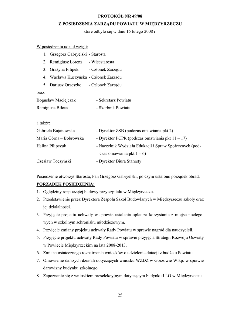 25 PROTOKÓŁ NR 49/08 Z POSIEDZENIA ZARZĄDU POWIATU W