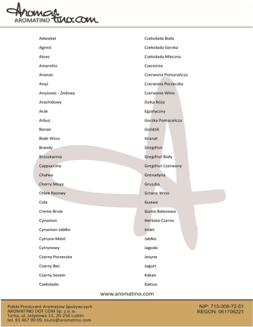 Adwokat Czekolada Biała Agrest Czekolada Gorzka Aloes Czekolada Mleczna Amaretto Czereśnia Ananas Czerwona Pomarańcza Anyż Czerwona Porzeczka Anyżowo - Ziołowy Czerwone Wino Arachidowy Dzika Róża Arak Egzotyczny Arbuz Gorzka Pomarańcza Banan Goździk Białe Wino Granat Brandy Grejpfrut Brzoskwinia Grejpfrut Biały Cappuccino Grejpfrut Czerwony Chałwa Grenadyna Cherry Moya Gruszka Chleb Razowy Grzane Wino Cola Guawa Creme Brule Guma Balonowa Cynamon Herbata Czarna Cynamon-Jabłko Imbir Cytryna-Miód Jabłko Cytrynowy Jagoda Czarna Porzeczka Jeżyna Czarny Bez Jogurt Czarny Sezam Kakao Czekolada Kaktus Karmel Masło Kasztan Maślano-Śmietankowy Kawa Melon Kawa Biała Mięta Kawa Czarna Migdały Kawa Latte Miodowy Kawa Latte Machiatto Miód - Cytryna Kiwi Miód - Jogurt Klon Mirabelka Kokos Mleczny Koniak Mleko Skondensowane Korzenny Mohito Krem Morela Kukułki Multiwitamina Kukurydza Nektarynka Landrynka Nektarynka - Śmietanka Liczi Nugat Limetka Ogórek Lukrecja Opuncja Malaga Orzech Laskowy Malina Orzech Włoski Malina - Kokos Owoc Goji Malina - Śmietanka Owoce Lasu Mandarynka Owoce Lasu W Jogurcie Mango Owoce Lasu W Śmietanie Marakuja Papaja Marcepan Piernik Marchew Piernik-Korzenny Pigwa Toffi-Krówka Pigwa Tonic Pinacolada Tropic Pistacja Tropic - Banan - Śmietanka Pomarańcza Truskawka Popcorn Truskawki W Śmietanie Poziomka Tutti-Frutti Poziomka Twaróg Rabarbar Wanilia Rodzynki-Twaróg Wanilia-Śmietanka Róża Waniliowo-Mleczny Rum Waniliowy Krem - Custard Sernik Wata Cukrowa Sex On The Beach Wermut Sezam Whisky Słodki Eukaliptus Wieloowocowy Słonecznik Winno - Rumoy Słony Karmel Winogrono Białe Smerfowy Winogrono Czerwone Straciatella Wiśnia Szampan Wiśnia - Śmietanka Szarlotka Wiśnia W Czekoladzie Śliwka Żurawina Śliwka Suszona Śmietanka Śmietanka - Cynamon Tiramisu Toffi Ananas - Kokos Jabłko - Brzoskwinia Ananas – Banan Jabłko - Rabarbar Aronia – Jabłko Jabłko - Antonówka Ananas-Banan Jabłko - Arbuz Ananas - Brzoskwinia - Mango - Papaja Jabłko - Czerwona Porzeczka Ananas – Kokos Jabłko – Mięta Ananas – Poziomka Jagoda - Malina Banan - Jabłko - Cytryna Jagoda – Truskawka Brandy - Orange Jogurt - Ananas Brzoskwinia - Twaróg Jogurt - Brzoskwinia Banan - Anyż Jogurt - Cytryna Banan – Śmietanka Jogurt - Truskawka Brzoskwinia - Malina Jagoda - Jogurt Brzoskwinia - Truskawka Jagoda - Śmietanka Brzoskwinia - Ananas Kaktus – Kiwi Cola - Wanilia Liczi – Marakuja Czarny Bez - Malina Malina - Mięta Czarny Bez – Jagoda Malina - Jeżyna Czekolada-Mięta Malina - Acai Exotic Mięta - Cytryna Granat - Czarna Porzeczka Mięta - Jabłko Gruszka – Jabłko Mięta - Czekolada Gruszka - Pistacja Mango - Ananas Herbata Jaśminowa Mango - Brzoskwinia Herbata Zielona Mango - Liczi Herbata Ice Mango - Marakuja Irish Cream Marchew - Malina - Jabłko Irish Whisky Marchew - Jabłko - Banan Jabłko - Ananas Marchew - Jabłko Jabłko - Gruszka Melon – Truskawka Jabłko - Porzeczka Oranżada Malinowa Jabłko - Śmietanka Oranżada Truskawkowa Pomarańcza - Brzoskwinia Pomarańcza - Jabłko - Aronia - Wiśnia Pomarańcza - Jabłko - Wiśnia Pomarańcza - Imbir Pomarańcza - Grejfrut - Imbir Pomarańcza-Imbir Passiflora Poziomka - Jagoda Poziomka - Truskawka Poziomka - Owoce Lasu Poziomka - Śmietanka Porzeczka - Nektarynka Porzeczkowo - Wiśnia Rabarbar – Truskawka Trawa Cytrynowa - Żurawina Truskawka - Kiwi Truskawka - Banan Truskawka W Śmietanie Truskawka - Pomarańcza Toffi - Śmietanka Tropic Winogrono – Jabłko Żurawina - Malina