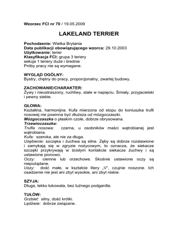 Wzorzec FCI nr 70 / 19.05.2009 LAKELAND TERRIER Pochodzenie: Wielka Brytania Data publikacji obowiązującego wzorca: 29.10.2003 Użytkowanie: terier Klasyfikacja FCI: grupa 3 teriery sekcja 1 teriery duże i średnie Próby pracy nie są wymagane. WYGLĄD OGÓLNY: Bystry, chętny do pracy, proporcjonalny, zwartej budowy. ZACHOWANIE/CHARAKTER: Żywy i nieustraszony, ruchliwy, stale w napięciu. Śmiały, przyjacielski i pewny siebie. GŁOWA: Kształtna, harmonijna. Kufa mierzona od stopu do koniuszka trufli nosowej nie powinna być dłuższa od mózgoczaszki. Mózgoczaszka o płaskim czole, dobrze obrysowana. Trzewioczaszka: Trufla nosowa: czarna, u osobników maści wątrobianej jest wątrobiana. Kufa: szeroka, ale nie za długa. Uzębienie: szczęka i żuchwa są silne. Zęby są dobrze rozstawione i zamykają się w zgryzie nożycowym, to oznacza, że siekacze szczęki przykrywają w ścisłym kontakcie siekacze żuchwy i są ustawione pionowo. Oczy: ciemne lub orzechowe. Skośnie ustawione oczy są niepożądane. Uszy: dość małe, w kształcie litery „V”, czujnie noszone. Ich osadzenie nie jest ani zbyt wysokie, ani zbyt niskie. SZYJA: Długa, lekko łukowata, bez luźnego podgardla. TUŁÓW: Grzbiet: silny, dość krótki. Lędźwie: dobrze związane. Klatka piersiowa: umiarkowanie wąska. OGON: Dawniej był zazwyczaj kopiowany. Ogon kopiowany: Dobrze osadzony, noszony radośnie, ale nie nad grzbietem ani też zakręcony. Ogon niekopiowany: Dobrze osadzony, noszony radośnie, ale nie nad grzbietem, ani też zakręcony. Proporcjonalny do całości sylwetki psa. KOŃCZYNY: Kończyny przednie: proste, o dobrej kości. Łopatki: należycie skośne. Kończyny tylne: silne i muskularne. Uda: długie i mocne. Stawy kolanowe: dobrze kątowane. Stawy skokowe: nisko umiejscowione. Śródstopia: proste. Łapy: małe, zwarte, okrągłe, o mocnych opuszkach. RUCH: Kończyny przednie i tylne kierują się prosto do przodu i są względem siebie równoległe. Łokcie swobodnie poruszają się po osi tułowia. Kolana nie są skierowane do wewnątrz ani na zewnątrz. Energiczny wykrok zależy od odpowiedniej elastyczności kończyn tylnych. SZATA: Włos gęsty, szorstki, odporny na zmiany pogody, z obfitym podszerstkiem. Umaszczenie: czarne podpalane, błękitne podpalane, czerwone, pszeniczne, szaroczerwone (grizzle), wątrobiane, błękitne lub czarne. Małe białe znaczenia na łapach i piersi są dopuszczalne, ale niepożądane. Umaszczenie mahoniowe lub ciemnorude są nietypowe. WIELKOŚĆ: Wzrost nie przekracza 37 cm w kłębie. Waga: dla psów 7,7 kg, dla suk 6,8 kg. WADY: Wszelkie odstępstwa od powyższego wzorca powinny być traktowane jako wady i oceniane w zależności od ich stopnia oraz wpływu na stan zdrowia i dobrostan psa. Psy, wykazujące wyraźne wady fizyczne lub odchylenia psychiczne, powinny być dyskwalifikowane. UWAGA: Samce muszą mieć dwa normalnie rozwinięte jądra, umieszczone w mosznie.