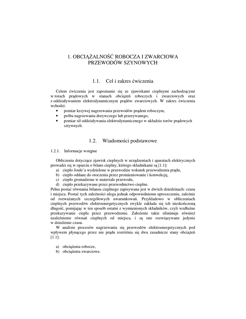 1. OBCIĄŻALNOŚĆ ROBOCZA I ZWARCIOWA PRZEWODÓW SZYNOWYCH 1.1. Cel i zakres ćwiczenia Celem ćwiczenia jest zapoznanie się ze zjawiskami cieplnymi zachodzącymi w torach prądowych w stanach obciążeń roboczych i zwarciowych oraz z oddziaływaniem elektrodynamicznym prądów zwarciowych. W zakres ćwiczenia wchodzi: • pomiar krzywej nagrzewania przewodów prądem roboczym, • próba nagrzewania dorywczego lub przerywanego, • pomiar sił oddziaływania elektrodynamicznego w układzie torów prądowych sztywnych. 1.2. 1.2.1. Wiadomości podstawowe Informacje wstępne Obliczenia dotyczące zjawisk cieplnych w urządzeniach i aparatach elektrycznych prowadzi się w oparciu o bilans cieplny, którego składnikami są [1.1]: a) ciepło Joule’a wydzielone w przewodzie wskutek przewodzenia prądu, b) ciepło oddane do otoczenia przez promieniowanie i konwekcję, c) ciepło gromadzone w materiale przewodu, d) ciepło przekazywane przez przewodnictwo cieplne. Pełna postać równania bilansu cieplnego zapisywana jest w dwóch dziedzinach: czasu i miejsca. Postać tych zależności ulega jednak odpowiedniemu uproszczeniu, zależnie od rozważanych szczegółowych uwarunkowań. Przykładowo w obliczeniach cieplnych przewodów elektroenergetycznych zwykle zakłada się ich nieskończoną długość, pomijając w ten sposób ostatni z wymienionych składników, czyli wzdłużne przekazywanie ciepła przez przewodzenie. Założenie takie eliminuje również uzależnienie równań cieplnych od miejsca, i są one rozwiązywane jedynie w dziedzinie czasu. W analizie procesów nagrzewania się przewodów elektroenergetycznych pod wpływem płynącego przez nie prądu rozróżnia się dwa zasadnicze stany obciążeń [1.1]: a) obciążenia robocze, b) obciążenia zwarciowe. 1.2.2. Obciążalność robocza przewodów Obciążenia robocze dzieli się na: a) stany cieplnie ustalone (obciążalność długotrwała), b) stany cieplnie nieustalone. Stan cieplnie ustalony (obciążalność długotrwała) to stan, w którym przewód osiągnął ustaloną temperaturę ϑu wskutek płynącego prądu o ustalonej wartości Iu, a całe ciepło Joule’a wydzielone w przewodzie jest oddawane do otoczenia. W równaniu bilansu cieplnego uwzględnia się wówczas jedynie składniki a) i b) wymienione w punkcie 1.2.1. Pomiędzy prądem Iu a ustaloną temperatura przewodu ϑu zachodzi zależność: I u2 = a (ϑ u − ϑ 0 ) = aτ u , (1.1) gdzie: a – wielkość stała w roboczym zakresie temperatury, zależna od właściwości materiałowych przewodnika, jego rozmiarów i warunków odprowadzenia ciepła do otoczenia, ϑ0 – obliczeniowa temperatura otoczenia, τu – ustalony przyrost temperatury, τu = (ϑu - ϑ0). Szczególnym przypadkiem ustalonego prądu obciążenia jest prąd obciążalności dopuszczalnej długotrwale IZ, który w ustalonych warunkach oddawania ciepła do otoczenia nagrzałby przewód do temperatury dopuszczalnej długotrwale ϑdd. Prąd IZ dla przewodów stosowanych w instalacjach elektrycznych jest podany w normie [1.2]. Przyjęta tam obliczeniowa temperatura otoczenia dla przewodów umieszczonych w powietrzu oraz w budynkach wynosi 30°C, a dla przewodów ułożonych w ziemi 20°C. Znajomość prądu IZ oraz ϑdd pozwala na obliczenie temperatury przewodów obciążonych dowolnym ustalonym prądem roboczym Iu: I ϑu − ϑ 0 = τ u = u IZ 2 τ dd , (1.2) gdzie: τdd – dopuszczalny długotrwale przyrost temperatury. Z tej samej zależności można wyliczyć dowolny ustalony prąd roboczy, który nagrzałby przewody do określonej temperatury ϑu: Iu = IZ τu ϑu − ϑ 0 . = IZ τ dd ϑ dd − ϑ 0 (1.3) Stan cieplnie nieustalony dotyczy sytuacji, gdy proces przyrostu temperatury przewodu nie został ustalony, czyli ciepło Joule’a wydzielone wskutek przepływu prądu jest częściowo oddawane do otoczenia, a częściowo gromadzone w materiale przewodu podnosząc jego temperaturę. W bilansie cieplnym dla tego stanu uwzględnia się więc trzy pierwsze składniki a), b) i c), wymienione w punkcie 1.2.1. Przyrost temperatury przewodu τ = f(t) podczas przepływu ustalonego prądu roboczego Iu, w przypadku gdy proces nagrzewania rozpoczął się od temperatury przewoduϑp równej temperaturze otoczenia ϑ0 (τp = ϑp - ϑ0 = 0), jest określony zależnością (krzywa 1, rys. 1.1): − t τ = τ u (1 − e T ) , (1.4) gdzie T jest cieplną stałą czasową przewodu. Jeżeli proces nagrzewania przewodu rozpoczyna się od pewnej temperatury początkowej przewodu ϑp różnej od temperatury otoczenia ϑ0 , czyli τp = ϑp - ϑ0 ≠ 0, wówczas zależność τ = f(t) ma postać (krzywa 2, rys.1.1): − t − t τ = τ u (1 − e T ) + τ p e T . (1.5) Drugi składnik sumy w równaniu (1.5) jest równaniem krzywej stygnięcia przewodu (przebieg 3, rys. 1.1), a krzywa (2) jest sumą przebiegów (1) i (3). ϑ τ T ϑu τu 2 1 ϑp τp 3 ϑ0 0 t Rys. 1.1. Przebiegi krzywej nagrzewania się przewodu, wg zależności (1.4) - krzywa 1 oraz wg zależności (1.5) – krzywa 2, która jest sumą krzywej nagrzewania od temperatury początkowej przewodu równej temperaturze otoczenia ϑ0 (krzywa 1) i krzywej stygnięcia 3. Wyróżnia się trzy typowe stany nieustalone w obciążalności roboczej przewodów: • obciążenie dorywcze, podczas którego przewód nagrzewany jest prądem Idor o wartości przekraczającej obciążalność długotrwałą przewodu IZ (rys. 1.2), przez czas niewystarczający do ustalenia się temperatury, po czym prąd jest wyłączany i przewód stygnie do temperatury otoczenia. Czas tdor, po którym temperatura przewodu osiągnie temperaturę dopuszczalną długotrwale ϑdd jest maksymalnym czasem trwania obciążenia dorywczego (rys. 1.2), co wyraża zależność: I dor = I Z 1 1− e − t dor . (1.6) T a) τ τdd 0 b) tdor t tdor t I Idor IZ 0 Rys. 1.2. Przebieg przyrostu temperatury przewodu τ = f(t) podczas obciążenia dorywczego (a) oraz przebieg prądu dorywczego
