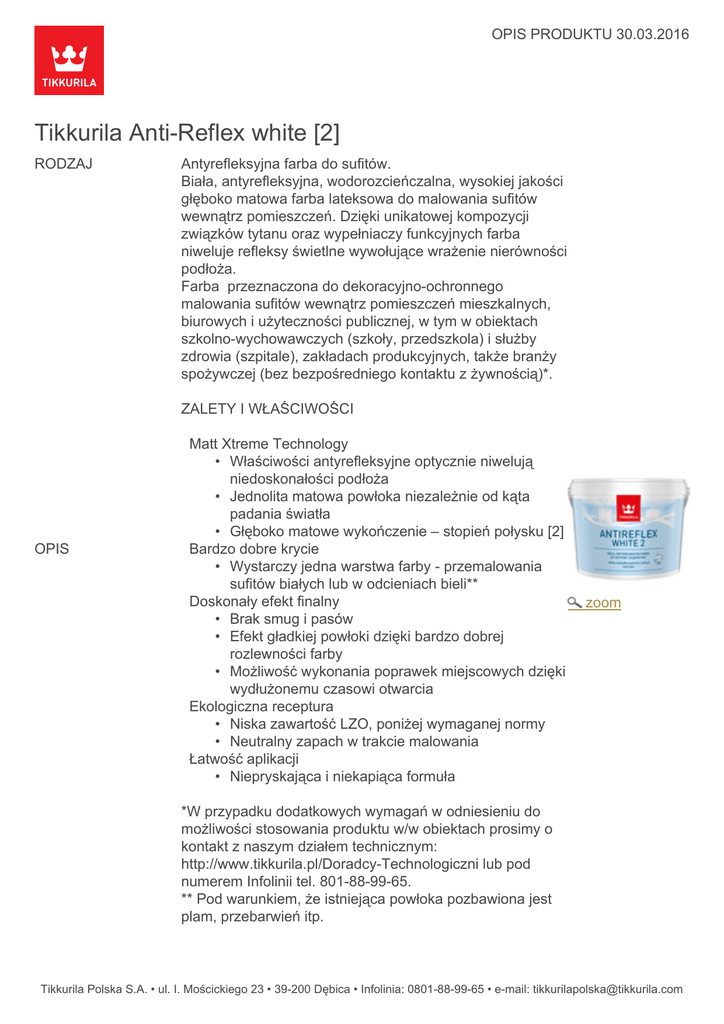 OPIS PRODUKTU 30.03.2016 Tikkurila Anti-Reflex white [2] RODZAJ Antyrefleksyjna farba do sufitów. Biała, antyrefleksyjna, wodorozcieńczalna, wysokiej jakości głęboko matowa farba lateksowa do malowania sufitów wewnątrz pomieszczeń. Dzięki unikatowej kompozycji związków tytanu oraz wypełniaczy funkcyjnych farba niweluje refleksy świetlne wywołujące wrażenie nierówności podłoża. Farba przeznaczona do dekoracyjno-ochronnego malowania sufitów wewnątrz pomieszczeń mieszkalnych, biurowych i użyteczności publicznej, w tym w obiektach szkolno-wychowawczych (szkoły, przedszkola) i służby zdrowia (szpitale), zakładach produkcyjnych, także branży spożywczej (bez bezpośredniego kontaktu z żywnością)*. ZALETY I WŁAŚCIWOŚCI OPIS Matt Xtreme Technology • Właściwości antyrefleksyjne optycznie niwelują niedoskonałości podłoża • Jednolita matowa powłoka niezależnie od kąta padania światła • Głęboko matowe wykończenie – stopień połysku [2] Bardzo dobre krycie • Wystarczy jedna warstwa farby - przemalowania sufitów białych lub w odcieniach bieli** Doskonały efekt finalny • Brak smug i pasów • Efekt gładkiej powłoki dzięki bardzo dobrej rozlewności farby • Możliwość wykonania poprawek miejscowych dzięki wydłużonemu czasowi otwarcia Ekologiczna receptura • Niska zawartość LZO, poniżej wymaganej normy • Neutralny zapach w trakcie malowania Łatwość aplikacji • Niepryskająca i niekapiąca formuła zoom *W przypadku dodatkowych wymagań w odniesieniu do możliwości stosowania produktu w/w obiektach prosimy o kontakt z naszym działem technicznym: http://www.tikkurila.pl/Doradcy-Technologiczni lub pod numerem Infolinii tel. 801-88-99-65. ** Pod warunkiem, że istniejąca powłoka pozbawiona jest plam, przebarwień itp. Tikkurila Polska S.A. • ul. I. Mościckiego 23 • 39-200 Dębica • Infolinia: 0801-88-99-65 • e-mail: [email protected] OPIS PRODUKTU 30.03.2016 Tikkurila Anti-Reflex white [2] PRZYKŁADY ZASTOSOWANIA Farba TIKKURILA ANTI-REFLEX white [2] przeznaczona jest do malowania sufitów wewnątrz budynku. Można ją stosować do malowania niemalowanych powierzchni i powierzchni uprzednio pokrytych farbami dyspersyjnymi. Nadaje się do malowania powierzchni szpachlowanych, tynku, płyt pilśniowych, wiórowych i okładzin tynkowych oraz tapet z włókna szklanego i materiałów podobnego typu. Produkt nadaje się również dekoracyjnego malowania betonu. Idealnie sprawdzi się m.in. w: pokojach dziennych, dziecięcych, sypialniach, salonach, jadalniach, holach, korytarzach, a także pomieszczeniach biurowych i użyteczności publicznej. Szczególnie polecana jest do malowania sufitów o dużej powierzchni i dużym doświetleniu, tworzy całkowicie matową i pozbawioną refleksów świetlnych drobnoziarnistą powierzchnię. DANE TECHNICZNE 6 Właściwości Kolory Stopień połysku Wydajność 8 Wydziela neutralny zapach podczas nanoszenia i schnięcia. Tworzy jednolitą głęboko matową powłokę odporną na delikatne przemywanie. Biały. Pełny mat Do 8 m2/l, przy jednokrotnym malowaniu. Praktyczna wydajność uzależniona jest od: chłonności i tekstury podłoża, metody aplikacji, użytego narzędzia malarskiego. 3 l, 10 l Wałek, pędzel, natrysk (0,017 - 0,021). Wielkość opakowań Nakładanie Czas schnięcia przy temp. 23°C i Farba schnie ok. 30 minut. Zaleca się, aby odstęp pomiędzy nakładaniem wilgotności względnej kolejnych warstw wynosił ok. 3 godzin. 50% Odporność na naświetlanie w pomieszczeniach o zwiększonej higienie pracy Odporność na np. szpitale: po 8-godzinnym ciągłym naświetlaniu lampą UVC ( odległość od naświetlanie powłoki -1,5 m) powłoka nie żółknie. Gęstość ok.1,29 g/cm3 Termin ważności: 2 lata od daty produkcji, w fabrycznie zamkniętym Przechowywanie opakowaniu. INSTRUKCJE STOSOWANIA Wszystkie powierzchnie malowane muszą być suche, temperatura powietrza Warunki nakładania od 5°C do +25°C, przy wilgotności względnej powietrza poniżej 80%. OPIS PRODUKTU 30.03.2016 Tikkurila Anti-Reflex white [2] Powierzchnie niemalowane pokryte szpachlówką, tynk, beton oraz płyty wiórowe, pilśniowe i gipsowe: oczyścić z kurzu, brudu i luźnego pyłu. Zagruntować farbą gruntującą Tikkurila Optiva Primer lub rozcieńczoną wodą (maksymalnie do 20%) białą farbą Tikkurila Anti Reflex white [2]. Powierzchnie malowane farbami dyspersyjnymi, alkidowymi i olejnymi: przed malowaniem powierzchnię należy dokładnie zmyć i odtłuścić. Łuszczące się powłoki usunąć,a powierzchnie skredowane odpylić na sucho i zmyć wodą. Błyszczące powierzchnie zmatowić średnioziarnistym papierem ściernym. Spłukać dokładnie wodą, wysuszyć. Przygotowanie Powierzchnie malowane farbami klejowymi i wapiennymi: powłoki farb klejowych muszą być starannie usunięte, aż do odsłonięcia tynku. Nierówności i ubytki wygładzić szpachlówką, całą powierzchnię zagruntować farbą gruntującą Tikkurila Optiva Primer lub rozcieńczoną wodą (maksymalnie do 20%) białą farbą Tikkurila Anti Reflex white [2]. Szpachlowanie i wypełnianie ubytków: Szpachlówka dobrej jakości, zapewniająca mocne i stabilne podłoże. W przypadku podłoży sypkich przed gruntowaniem właściwym należy zastosować preparat Tikkurila Suprabilit. Na podłożach uprzednio malowanych należy wykonać wymalowanie próbne na małej powierzchni. Uzyskanie pożądanego efektu decyduje o zastosowaniu produktu. W niniejszej karcie niemożliwe jest opisanie wszystkich aspektów stosowania produktu. W przypadkach, które nie zostały opisane powyżej, prosimy o kontakt z Doradcą Technologicznym. Chętnie udzielimy Państwu szczegółowych informacji związanych z konkretnym obiektem. Ważne: Nie rozpoczynać malowania gdy temperatura powierzchni jest niższa niż +5°C. Malowanie ubytków Szpachlówka dobrej jakości, zapewniająca mocne i stabilne podłoże. Rozcieńczanie Nie