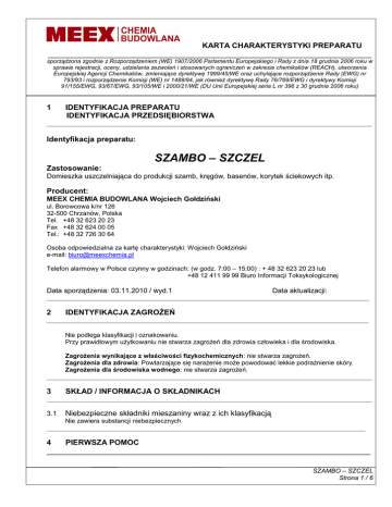 KARTA CHARAKTERYSTYKI PREPARATU __________________________________________________________________________________ sporządzona zgodnie z Rozporządzeniem (WE) 1907/2006 Parlamentu Europejskiego i Rady z dnia 18 grudnia 2006 roku w sprawie rejestracji, oceny, udzielania zezwoleń i stosowanych ograniczeń w zakresie chemikaliów (REACH), utworzenia Europejskiej Agencji Chemikaliów, zmieniające dyrektywę 1999/45/WE oraz uchylające rozporządzenie Rady (EWG) nr 793/93 i rozporządzenie Komisji (WE) nr 1488/94, jak również dyrektywę Rady 76/769/EWG i dyrektywy Komisji 91/155/EWG, 93/67/EWG, 93/105/WE i 2000/21/WE (DU Unii Europejskiej seria L nr 396 z 30 grudnia 2006 roku) 1 IDENTYFIKACJA PREPARATU IDENTYFIKACJA PRZEDSIĘBIORSTWA ___________________________________________________________________________________________________ Identyfikacja preparatu: SZAMBO – SZCZEL Zastosowanie: Domieszka uszczelniająca do produkcji szamb, kręgów, basenów, korytek ściekowych itp. Producent: MEEX CHEMIA BUDOWLANA Wojciech Gołdziński ul. Borowcowa k/nr 126 32-500 Chrzanów, Polska Tel. +48 32 623 20 23 Fax +48 32 624 00 05 Tel.: +48 32 726 30 64 Osoba odpowiedzialna za kartę charakterystyki: Wojciech Gołdziński e-mail: [email protected] Telefon alarmowy w Polsce czynny w godzinach: (w godz. 7:00 – 15:00) : + 48 32 623 20 23 lub +48 12 411 99 99 Biuro Informacji Toksykologicznej Data sporządzenia: 03.11.2010 / wyd.1 Data aktualizacji: __________________________________________________________________________________________________ 2 IDENTYFIKACJA ZAGROŻEŃ __________________________________________________________________________________________________ Nie podlega klasyfikacji i oznakowaniu. Przy prawidłowym użytkowaniu nie stwarza zagrożeń dla zdrowia człowieka i dla środowiska. Zagrożenia wynikające z właściwości fizykochemicznych: nie stwarza zagrożeń. Zagrożenia dla zdrowia: Powtarzające się narażenie może powodować lekkie podrażnienie skóry. Zagrożenia dla środowiska wodnego: nie stwarza zagrożeń. ___________________________________________________________________________________________________ 3 SKŁAD / INFORMACJA O SKŁADNIKACH ___________________________________________________________________________________________________ 3.1 Niebezpieczne składniki mieszaniny wraz z ich klasyfikacją Nie zawiera substancji niebezpiecznych _________________________________________________________________________________________________ 4 PIERWSZA POMOC __________________________________________________________________________________ SZAMBO – SZCZEL Strona 1 / 6 KARTA CHARAKTERYSTYKI PREPARATU __________________________________________________________________________________ sporządzona zgodnie z Rozporządzeniem (WE) 1907/2006 Parlamentu Europejskiego i Rady z dnia 18 grudnia 2006 roku w sprawie rejestracji, oceny, udzielania zezwoleń i stosowanych ograniczeń w zakresie chemikaliów (REACH), utworzenia Europejskiej Agencji Chemikaliów, zmieniające dyrektywę 1999/45/WE oraz uchylające rozporządzenie Rady (EWG) nr 793/93 i rozporządzenie Komisji (WE) nr 1488/94, jak również dyrektywę Rady 76/769/EWG i dyrektywy Komisji 91/155/EWG, 93/67/EWG, 93/105/WE i 2000/21/WE (DU Unii Europejskiej seria L nr 396 z 30 grudnia 2006 roku) 4.1 Instrukcje postępowania w zależności od drogi narażenia Wynieść poszkodowanego z miejsca narażenia, ułożyć w wygodnej pozycji półleżącej lub siedzącej, zapewnić spokój, chronić przed utratą ciepła. Jeżeli wystąpią zaburzenia oddychania, podawać tlen do oddychania. Jeżeli objawy nie ustępują, wezwać lekarza. Kontakt z oczami: Natychmiast płukać dużą ilością letniej wody, najlepiej bieżącej, przez co najmniej 15 min. Usunąć szkła kontaktowe. Unikać silnego strumienia wody ze względu na ryzyko mechanicznego uszkodzenia rogówki. Jeżeli podrażnienie nie ustępuje, należy skonsultować się z lekarzem-okulistą. Kontakt ze skórą: Obficie zmywać letnią, bieżącą wodą. Zdjąć zanieczyszczoną odzież. Jeśli podrażnienie nie ustępuje, zasięgnąć porady lekarza. Połknięcie: Jeżeli nastąpi połknięcie, nie powodować wymiotów. Jeżeli poszkodowany jest przytomny podać do wypicia dużą ilość wody. Ogólne zalecenia: Powinny być przestrzegane zwykłe środki ostrożności jak przy pracy z chemikaliami. Jeżeli wystąpią jakiekolwiek niepokojące objawy, wezwać lekarza. Wskazówki dla lekarza: Stosować leczenie objawowe. Wdychanie: __________________________________________________________________________________ 5 POSTĘPOWANIE W PRZYPADKU POŻARU __________________________________________________________________________________________________ 5.1 Zalecane środki gaśnicze Piana odporna na działanie alkoholu, dwutlenek węgla, proszki gaśnicze, rozproszony strumień wody. Pojemniki nie objęte pożarem, narażone na działanie ognia, chłodzić rozproszonym strumieniem wody. 5.2 Zabronione środki gaśnicze Zwarty strumień wody. 5.3 Niebezpieczne produkty rozkładu W czasie pożaru mogą powstawać tlenki węgla (CO, CO2). 5.4 Specjalistyczny sprzęt przeciwpożarowy Zakładać gazoszczelną odzież ochronną i aparaty oddechowe niezależne od powietrza z otoczenia. Zbiorniki narażone na działanie ognia chłodzić wodą z bezpiecznej odległości. Wodę gaśniczą zbierać osobno, nie wylewać do kanalizacji. ___________________________________________________________________________________________________ 6 POSTĘPOWANIE W PRZYPADKU NIEZAMIERZONEGO UWOLNIENIA DO ŚRODOWISKA ___________________________________________________________________________________________________ 6.1 Zagrożenia dla zdrowia i środki ochrony ludzi Środki ostrożności: Uszkodzone opakowanie umieścić w opakowaniu zastępczym. Zapewnić odpowiednią wentylację. Nakładać odzież ochronną i rękawice. Nie wdychać oparów. 6.2 Zagrożenia dla środowiska i środki ochrony środow