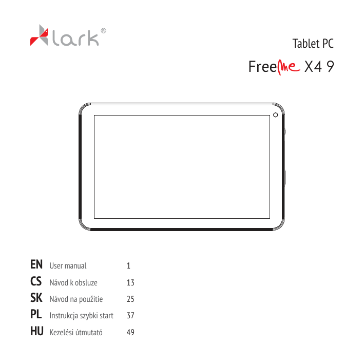 Tablet PC X4 9 EN CS SK PL HU User manual 1 Návod k obsluze 13 Návod na použitie 25 Instrukcja szybki start 37 Kezelési útmutató 49 Before you begin Thankyou for choosing Lark FreeMe X4 9 tablet .We wish you manysatisfaction from its use. Tablet PC is a multi-functional device, which can be used for work and education and for entertainment as well. Thanks to the tablet you have the Internet always in your reach, without need of bulky personal computers of previous generation. Android 4.4 KitKat and Google Play enable access to plenty of useful applications, for both business and entertainment purposes. Clear and intuitive interface gives you the pleasure of dailyuse of the tablet. Please read the user guide and keep it for further reference.The user guide contains important information regarding safe and effective use of the tablet. The producer mayintroduce changes in the device and the user guide. Please refer to the www.lark.com.pl website in case of questions or doubts concerning use of the device. 1 Before you begin Safetyand handling Prevent your tablet and accessories from getting wet. Getting electrical equipment wet not only causes serious damage, but it is also a threat to the user (risk of electric shock). Protect your device against shocks, falls and vibrations. Protect the device from high and low temperatures. Do not drop, bend, puncture, insert foreign objects, or place heavyobjects on your tablet. Do not use unauthorized accessories, as the maydamage the tablet and void manufacturer's warranty. Important safetyinstructions Be sure to follow instructions bellow. Make sure that theyare known to all users of your tablet, including children.. Never use your tablet while driving. Hospitals and other medical facilities may be prohibited from using electronic devices, including tablets. Always follow these restrictions. Turn off the tablet in the plane for the whole flight or during take-off and landing, according to the instructions given bythe aircraft personnel. Switch off the device near important electronic devices, which could be disrupted bypossible interference. Do not attempt to disassemble, modifyor repair the tablet. Always entrust these tasks to authorized specialist. Protect your tablet from strong magnetic fields.These fields can damage magnetic storage media. Do not use the tablet in veryhigh temperatures or in areas at high risk of fire or explosion, such as petrol stations. 2 Before you begin Supervise the use of the device bychildren, do not let them playwith the tablet unattended. Prevent the tablet from getting wet, for instance do not use or store it in the bathroom. The symbol to the left means that according to European Union laws and regulations your product and/or its battery shall be disposed of separately from household waste. When this product reaches its end of life, take it to a collection point designated by local authorities. The separate collection and recycling of your product and/or its battery at the time of disposal will help conserve natural resources and ensure that it is recycled in a manner that protects human health and the environment. 3 Product overview Parts and buttons of the device 2 1 1. Touch screen 2. Front camera 4 Product overview 3 4 7 8 9 10 11 6 5 3. Rear camera 8. Earphone jack 4. Speaker 9. Micro USB port 5. RESET button 10. DC IN 6. MicroSD card slot 11. Volume up / Volume down 7. Power ON/OFF button 5 Getting started Battery charging Please charge the battery before first use. 1. Connect Table to the AC charger, and the charger to AC power outlet. 2. Check charging lights. Red light means that device is charging, green that the charge has been completed. ATTENTION! The battery will fully charge in around 4 hours. Using the device during charging will make charging process longer. Disconnect the ac charger from your tablet when the battery power is full or when you wish to stop the charging. You can only use identical battery as a replacement. Physical damages to the battery may cause a fire or electric shock. 6 Using your tablet Buttons functions Power button - press and hold for a few seconds to turn on the device Volume UP - press and hold Volume Up button to increase the volume Volume Down - press and hold Volume Down button to decrease the volume Powering on/off the device Turning on After pressing and holding the ON/OFF button for 2 seconds the start screen will appear. Turning off To turn off the device press and hold the ON/OFF button for 2 seconds. Locking the screen To unlock the screen swipe the lock icon upwards 7 Using your tablet Multi-touch screen Never before have the use of an electronic device was so easy and natural. The screen responds to even gentle brush, understand a few fingers touch applied simultaneously, eg. 'pinching' shrink the image, and spreading the fingers apart-expand it. You can rotate the image with two fingers, like a piece of paper on the table. The capacitive touch screen is also indispensable for gaming use. Using the multitouch screen Tap gently on the screen with your fingertip to launch an application, select an item, open a menu, or type text using the onscreen keyboard. Touch The device is operated by touching appropriate place on the screen. Swipe or slide Move your finger in a vertical or horizontal direction on the screen to scroll through the content. Drag Touch, hold and drag an item to the desired position. Rotate the screen The tablet has a built-in motion sensor that supports the screen auto-rotation feature. By default, this feature is enabled. When you rotate the tablet, the screen automatically rotates to landscape or portrait view which is very convenient during internet browsing, watching the movies, pictures, etc. Navigating through the screens Home screen surface is greater than the display surface, so it is possible to affix the more shortcuts, applications and widgets. Switching between home screen pages is possible by dragging the screen to the left or t