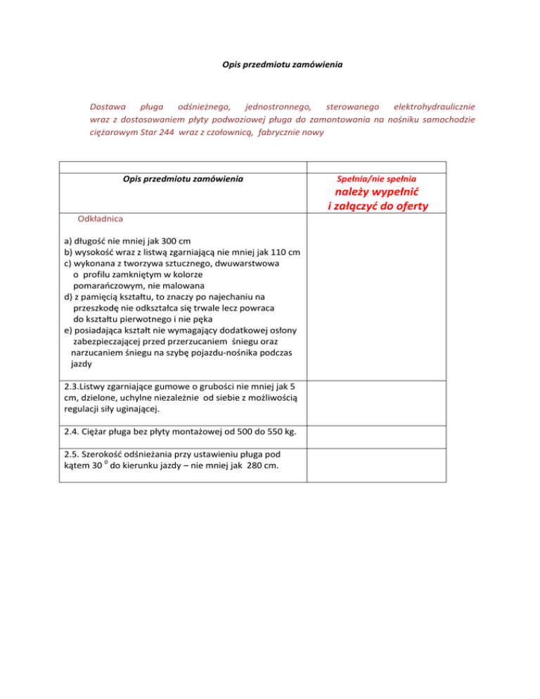 Opis przedmiotu zamówienia Dostawa pługa odśnieżnego, jednostronnego, sterowanego elektrohydraulicznie wraz z dostosowaniem płyty podwoziowej pługa do zamontowania na nośniku samochodzie ciężarowym Star 244 wraz z czołownicą, fabrycznie nowy Opis przedmiotu zamówienia Spełnia/nie spełnia należy wypełnić i załączyć do oferty Odkładnica a) długość nie mniej jak 300 cm b) wysokość wraz z listwą zgarniającą nie mniej jak 110 cm c) wykonana z tworzywa sztucznego, dwuwarstwowa o profilu zamkniętym w kolorze pomarańczowym, nie malowana d) z pamięcią kształtu, to znaczy po najechaniu na przeszkodę nie odkształca się trwale lecz powraca do kształtu pierwotnego i nie pęka e) posiadająca kształt nie wymagający dodatkowej osłony zabezpieczającej przed przerzucaniem śniegu oraz narzucaniem śniegu na szybę pojazdu-nośnika podczas jazdy 2.3.Listwy zgarniające gumowe o grubości nie mniej jak 5 cm, dzielone, uchylne niezależnie od siebie z możliwością regulacji siły uginającej. 2.4. Ciężar pługa bez płyty montażowej od 500 do 550 kg. 2.5. Szerokość odśnieżania przy ustawieniu pługa pod kątem 30 0 do kierunku jazdy – nie mniej jak 280 cm. 2.6. Materiały konstrukcyjne pługa powinny zachować elastyczność i wytrzymałość w temperaturze do – 40 0 C. 2.7. Tłoczyska siłowników powinny być wykonane ze stali odpornej na korozję. 2.8. Wszystkie elementy złączne takie jak śruby, nakrętki, sworznie powinny być ocynkowane. 2.9. Układ sterowania elektrohydrauliczny z pulpitu sterującego w kabinie kierowcy z funkcjami podnoszenia, opuszczania, skrętu w lewo i w prawo, praca z dociskiem. 2.10. Rama nośna pługa oraz czołownica wykonane ze stali i zabezpieczone antykorozyjnie. 2.11. Czołownica i zestaw montażowy powinny być przystosowane do zamontowania na nośniku Star 244 i podobnych według norm DIN 2.12. Pług powinien posiadać zawieszenie umożliwiające ustawienie listwy zgarniającej do nachylenia drogi w kierunku poprzecznym w granicach +/- 100 2.13. Pług powinien posiadać dwa systemy zabezpieczeń przed uszkodzeniem: listwa zgarniająca segmentowa, z możliwością uchylenia przy najeździe na przeszkodę jednego lub kilku jego segmentów, oraz możliwość odchylenia całej okładnicy przy najechaniu na przeszkodę i powrót do położenia pierwotnego 2.14. Pług powinien posiadać oświetlenie robocze zastępujące światła nośnika, to znaczy wymagane kodeksem drogowym, światła drogowe i mijania montowane na konstrukcji zawieszenia pługa zasilane prądem stałym 24 V oraz oświetlenie obrysowe w kolorze białym z przodu i czerwonym z tyłu. 2.15.Pług powinien posiadać kółka podporowe – prowadzące pełne, nie pompowane, z możliwością szybkiej regulacji wysokości zamocowania. 2.16. Pług powinien posiadać podpory demontażowe, umożliwiające stabilne ustawienie pługa po zakończeniu prac zimowego utrzymania dróg, oraz ucho transportowe do przenoszenia pługa. 2.17. Pług powinien być oznakowany obustronną folią odblaskową o szerokości nie mniej jak 15 cm, wysokości nie mniej jak 50 cm, w skośne biało-czerwone pasy, umieszczona na skrajni pługa. 2.18. Pług powinien być przystosowany do odśnieżania przy prędkości jazdy nośnika do 60 km/h ..................................................... Podpis(y) osoby(osób) upoważnionej(ych)do podpisania niniejszej oferty w imieniu Wykonawcy (ów) Wypełnić i załączyć do oferty