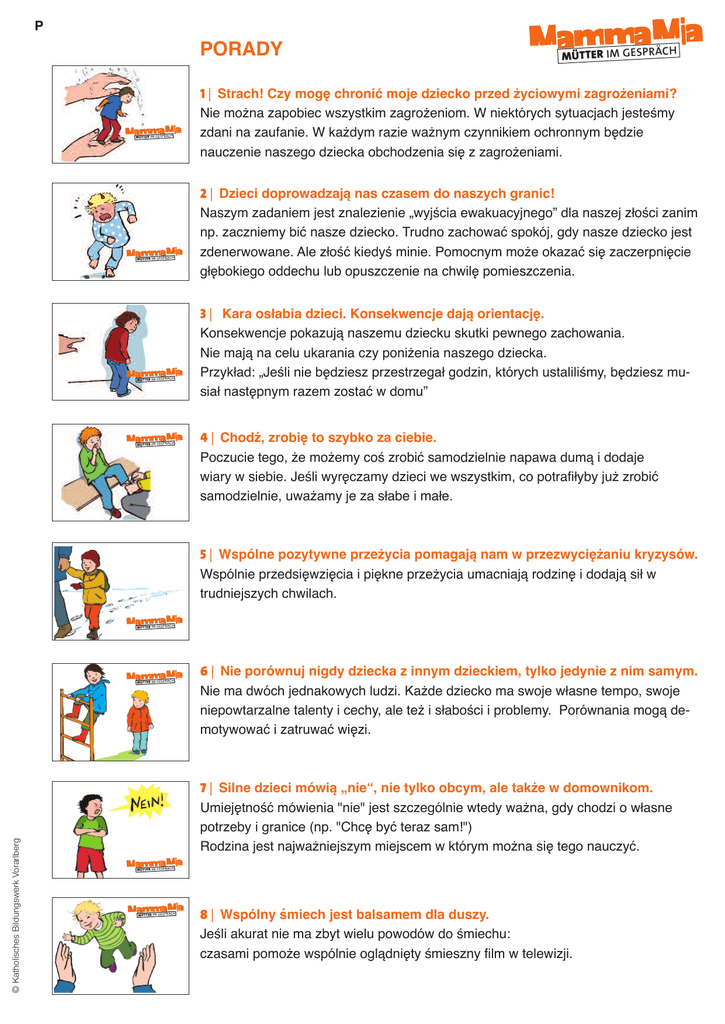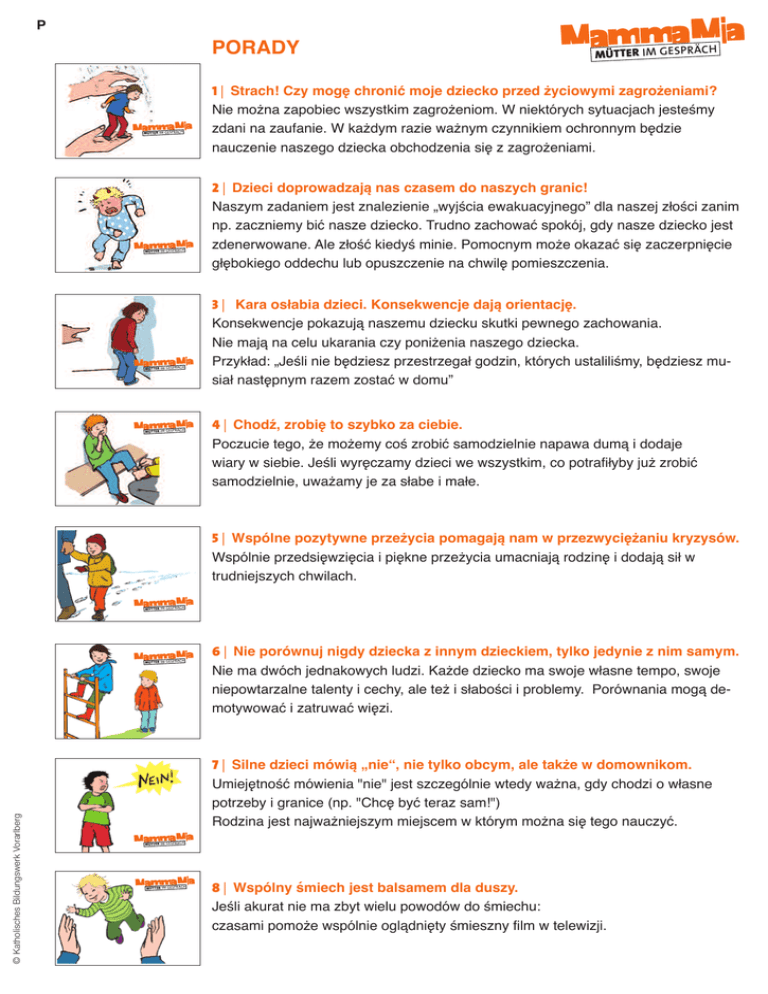 P PORADY MammaMi a MÜTTER IM GESPRÄCH MammaMia MÜTTER IM GESPRÄCH MammaMia MÜTTER IM GESPRÄCH MammaMia MÜTTER IM GESPRÄCH Mamma Mia MÜTTER IM GESPRÄCH 1 | Strach! Czy mogę chronić moje dziecko przed życiowymi zagrożeniami? Nie można zapobiec wszystkim zagrożeniom. W niektórych sytuacjach jesteśmy zdani na zaufanie. W każdym razie ważnym czynnikiem ochronnym będzie nauczenie naszego dziecka obchodzenia się z zagrożeniami. 2 | Dzieci doprowadzają nas czasem do naszych granic! Naszym zadaniem jest znalezienie „wyjścia ewakuacyjnego” dla naszej złości zanim np. zaczniemy bić nasze dziecko. Trudno zachować spokój, gdy nasze dziecko jest zdenerwowane. Ale złość kiedyś minie. Pomocnym może okazać się zaczerpnięcie głębokiego oddechu lub opuszczenie na chwilę pomieszczenia. 3 | Kara osłabia dzieci. Konsekwencje dają orientację. Konsekwencje pokazują naszemu dziecku skutki pewnego zachowania. Nie mają na celu ukarania czy poniżenia naszego dziecka. Przykład: „Jeśli nie będziesz przestrzegał godzin, których ustaliliśmy, będziesz musiał następnym razem zostać w domu” 4 | Chodź, zrobię to szybko za ciebie. Poczucie tego, że możemy coś zrobić samodzielnie napawa dumą i dodaje wiary w siebie. Jeśli wyręczamy dzieci we wszystkim, co potrafiłyby już zrobić samodzielnie, uważamy je za słabe i małe. 5 | Wspólne pozytywne przeżycia pomagają nam w przezwyciężaniu kryzysów. Wspólnie przedsięwzięcia i piękne przeżycia umacniają rodzinę i dodają sił w trudniejszych chwilach. Mamma Mia MÜTTER IM GESPRÄCH Mamma Mia © Katholisches Bildungswerk Vorarlberg MÜTTER IM GESPRÄCH 6 | Nie porównuj nigdy dziecka z innym dzieckiem, tylko jedynie z nim samym. Nie ma dwóch jednakowych ludzi. Każde dziecko ma swoje własne tempo, swoje niepowtarzalne talenty i cechy, ale też i słabości i problemy. Porównania mogą demotywować i zatruwać więzi. 7 | Silne dzieci mówią „nie“, nie tylko obcym, ale także w domownikom. Umiejętność mówienia "nie" jest szczególnie wtedy ważna, gdy chodzi o własne potrzeby i granice (np. "Chcę być teraz sam!") Rodzina jest najważniejszym miejscem w którym można się tego nauczyć. Mamma Mia MÜTTER IM GESPRÄCH MammaMia MÜTTER IM GESPRÄCH 8 | Wspólny śmiech jest balsamem dla duszy. Jeśli akurat nie ma zbyt wielu powodów do śmiechu: czasami pomoże wspólnie oglądnięty śmieszny film w telewizji. Mamma Mia P MÜTTER IM GESPRÄCH MammaMia MÜTTER IM GESPRÄCH Mamma Mia MÜTTER IM GESPRÄCH 9 | By wychować dziecko potrzebna jest cała wioska. Nie musimy wszystkiego robić sami. Także ojcowie, dziadkowie i inne bliskie osoby mogą przejąć część zadań przy wychowywaniu i opiece nad dziećmi. 10 | Wyraźne „nie“ jest często najlepszą odpowiedzią, jaką możemy dać dziecku. Aby móc dobrze wychowywać dzieci, niejednokrotnie musimy im mówić nie: by chronić je przed zagrożeniami/ gdy chodzi o godziny oglądania telewizji czy chodzenia spać/ lub gdy chodzi o wygórowane życzenia konsumpcyjne. 11 | Dobrze jest czuć, że ktoś się mną interesuje. Interesując się szczerze tym, jak się nasze dziecko czuje, co przeżyło, co mu się podoba, o czym myśli.... pokazujemy mu, jak bardzo je kochamy. Mamma Mia MÜTTER IM GESPRÄCH MammaMi a 12 | Akceptuję cię takim, jakim jesteś. To całkowicie normalne, że niektórych cech naszego dziecka czasami nie lubimy. Ale mimo wszystko to dziecko kochamy. Tylko człowiek, który czuje się zaakceptowany przez rodziców, może zaakceptować siebie. MÜTTER IM GESPRÄCH MammaMia MÜTTER IM GESPRÄCH 13 | Niemowlę przysparza wiele radości i wiele pracy w domu. Niemowlęta potrzebują stałej opieki i ciągłej uwagi. Dlatego czasami dobrze nam zrobi, gdy ktoś z rodziny nas odciąży i zajmie się trochę dzieckiem. 14 | Silni rodzice nie potrzebują idealnych dzieci. Próbowanie czegoś i popełnianie błędów jest częścią życia. Pozwalamy naszemu dziecku na bycie dzieckiem. MammaMia © Katholisches Bildungswerk Vorarlberg MÜTTER IM GESPRÄCH MammaMia MÜTTER IM GESPRÄCH Mamma Mia MÜTTER IM GESPRÄCH 15 | Dzieci potrafią rozwiązywać konflikty między sobą – jeśli tylko im na to pozwolimy. Umiejętność rozwiązywania konfliktów jest bardzo ważnym doświadczeniem. Dajmy naszym dzieciom możliwość, by mogły się tego nauczyć! Jeśli nie będą potrafiły sobie samodzielnie z tym poradzić, możemy zawsze je wesprzeć radą. 16 | Dzieci powinny móc współdecydować o sprawach, które ich dotyczą. My rodzice ponosimy odpowiedzialność za naszą rodzinę. Zależnie od wieku dzieci możemy także w różnych kwestiach uwzględnić ich zdanie lub pozwolić im na współdecydownie.