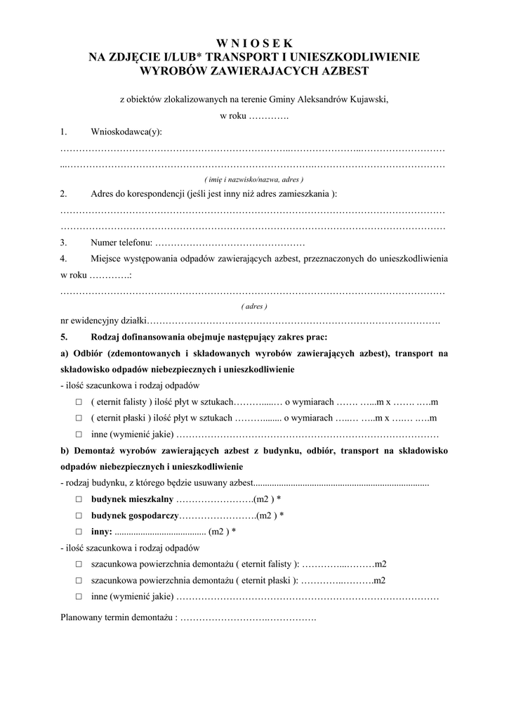 WNIOSEK NA ZDJĘCIE I/LUB* TRANSPORT I UNIESZKODLIWIENIE WYROBÓW ZAWIERAJACYCH AZBEST z obiektów zlokalizowanych na terenie Gminy Aleksandrów Kujawski, w roku …………. 1. Wnioskodawca(y): ………………………………………………………………..…………………..……………………… ...…………………………………………………………………….…………………………………… ( imię i nazwisko/nazwa, adres ) Adres do korespondencji (jeśli jest inny niż adres zamieszkania ): 2. …………………………………………………………………………………………………………… …………………………………………………………………………………………………………… 3. Numer telefonu: ………………………………………… 4. Miejsce występowania odpadów zawierających azbest, przeznaczonych do unieszkodliwienia w roku ………….: …………………………………………………………………………………………………………… ( adres ) nr ewidencyjny działki…………………………………………………………………………………. Rodzaj dofinansowania obejmuje następujący zakres prac: 5. a) Odbiór (zdemontowanych i składowanych wyrobów zawierających azbest), transport na składowisko odpadów niebezpiecznych i unieszkodliwienie - ilość szacunkowa i rodzaj odpadów □ ( eternit falisty ) ilość płyt w sztukach……….....… o wymiarach ……. …...m x ……. .….m □ ( eternit płaski ) ilość płyt w sztukach ………........ o wymiarach …..… …..m x ….… .….m □ inne (wymienić jakie) ………………………………………………………………………… b) Demontaż wyrobów zawierających azbest z budynku, odbiór, transport na składowisko odpadów niebezpiecznych i unieszkodliwienie - rodzaj budynku, z którego będzie usuwany azbest........................................................................... □ budynek mieszkalny …………………….(m2 ) * □ budynek gospodarczy…………………….(m2 ) * □ inny: ....................................... (m2 ) * - ilość szacunkowa i rodzaj odpadów □ szacunkowa powierzchnia demontażu ( eternit falisty ): …………...………m2 □ szacunkowa powierzchnia demontażu ( eternit płaski ): …………..……….m2 □ inne (wymienić jakie) ………………………………………………………………………… Planowany termin demontażu : ……………………….……………. 6. Określenie zakresu pomocy (zaznaczyć odpowiednie pole): □ wnioskuję o pomoc w zakresie odbiór, transport i unieszkodliwienie wyrobów zawierających azbest zalegających na mojej nieruchomości □ wnioskuję o pomoc w pełnym zakresie – demontaż, transport i unieszkodliwienie wyrobów zawierających azbest 7. Środki zostaną zrefundowane jedynie w przypadku przeprowadzenia prac przez firmę wybraną w ogłoszonym przetargu na realizację całości zadania 8. Gmina Aleksandrów Kujawski zastrzega sobie prawo odstąpienia od realizacji zadania w przypadku nieotrzymania dofinansowania. OŚWIADCZENIA: 1. Oświadczam, że dane zawarte w powyższym zgłoszeniu wypełniłem/am zgodnie z prawdą i znane mi są warunki programu. 2. Oświadczam, że wyrażam zgodę na wejście firmy zajmującej się demontażem, transportem i unieszkodliwienie wyrobów zawierających azbest na teren mojej posesji. 3. Oświadczam, że nowe poszycie dachowe wykonam we własnym zakresie i na własny koszt. 4. Oświadczam, że zostałem poinformowany iż w przypadku zmiany konstrukcji dachu niezbędne będzie zlecenie przez Wnioskodawcę opracowania projektu budowlanego i uzyskanie pozwolenia na budowę. Wyrażam zgodę na przetwarzanie moich danych osobowych zawartych w zgłoszeniu dla potrzeb realizacji zadania demontażu, transportu i utylizacji azbestu, zgodnie z ustawą z dnia 29 sierpnia 1997 r. o ochronie danych osobowych. ( Dz. U. z 2002 r. Nr 101, poz. 926 z późn. zm. ). …………………………………………………………………... ( data i czytelny podpis ) Wymagane załączniki: 1. Oświadczenie (druk WFOŚiGW). (załącznik nr 1) 2. Oświadczenie o maksymalnej kwocie dofinansowania. (załącznik nr 2) 3. Oświadczenie o dostarczeniu dokumentu potwierdzającego zgłoszenie robót związanych z demontażem wyrobów zawierających azbest (załącznik nr 3) 4. Oświadczenie o odtworzeniu elementów budowlanych w miejscu zdjętych z własnych środków. (załącznik nr 3) 5. Decyzja o pozwolenie na budowę lub zgłoszenie robót budowlanych nie wymagających pozwolenia na budowę. 6. Wypis z rejestru gruntów. 7. Kopia mapy zasadniczej działki, na której znajduje się budynek przeznaczony do demontażu wyrobów zawierających azbest w skali 1:1000 Załącznik nr 1 do wniosku …………………………………, dnia …………………. ……………………………………... …………………………………….. ...................................................... Dane właściciela nieruchomości OŚWIADCZENIE Oświadczam, że deklaruję realizację zadania polegającego na zdjęciu, zabezpieczeniu i unieszkodliwieniu azbestu zgodnie z aktualnie obowiązującymi wymaganiami prawnymi przy dofinansowaniu w formie dotacji ze środków Wojewódzkiego Funduszu Ochrony Środowiska i Gospodarki Wodnej w Toruniu oraz Narodowego Funduszu Ochrony Środowiska i Gospodarki Wodnej. Jednocześnie oświadczam, że nowe pokrycie dachowe wykonam we własnym zakresie*) …..………………………………….. Podpis właściciela nieruchomości *) skreślić, jeśli nie dotyczy Załącznik nr 2 do wniosku ……………………………, dnia …………………. ……………………………….. ……………………………….. .........................